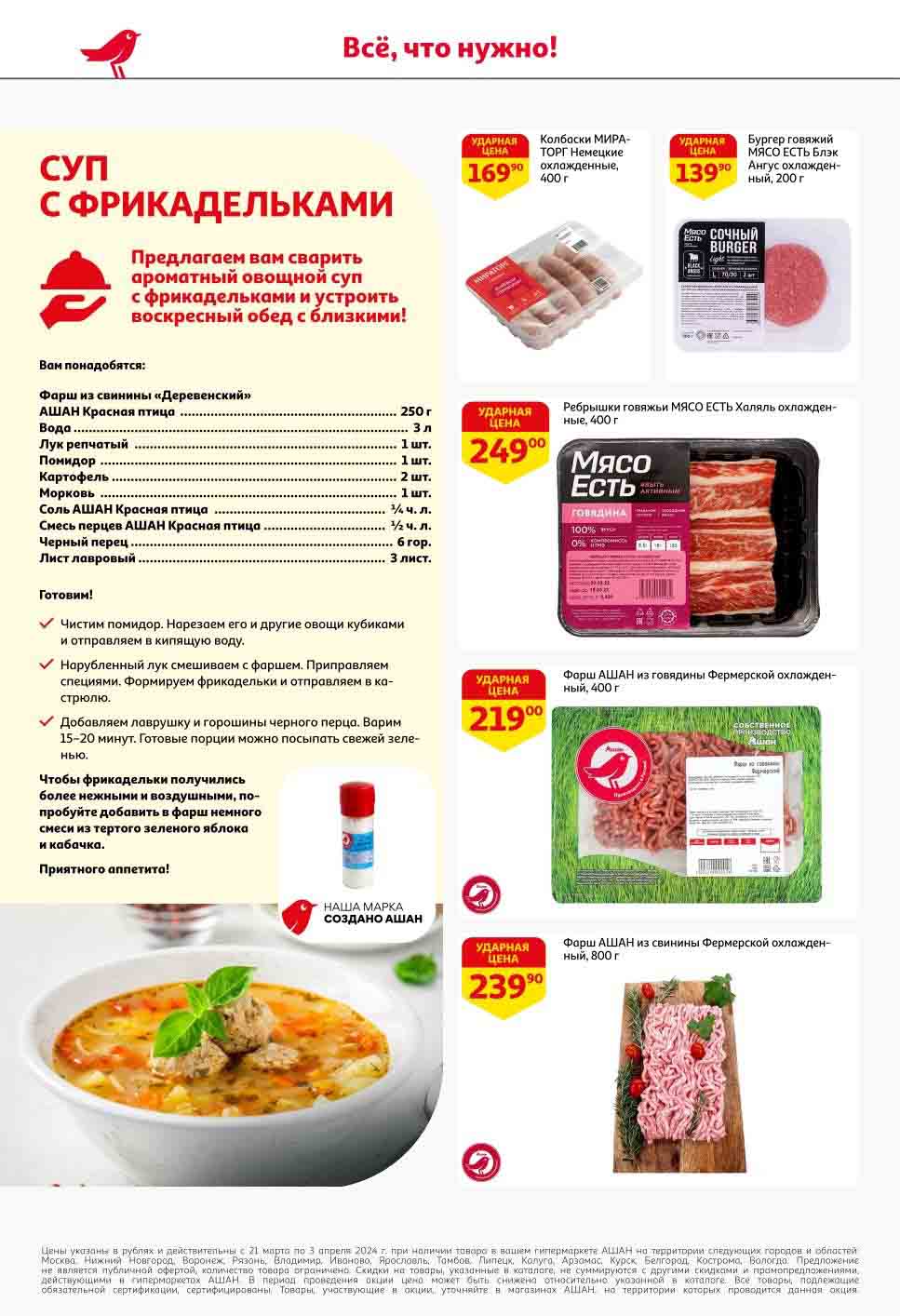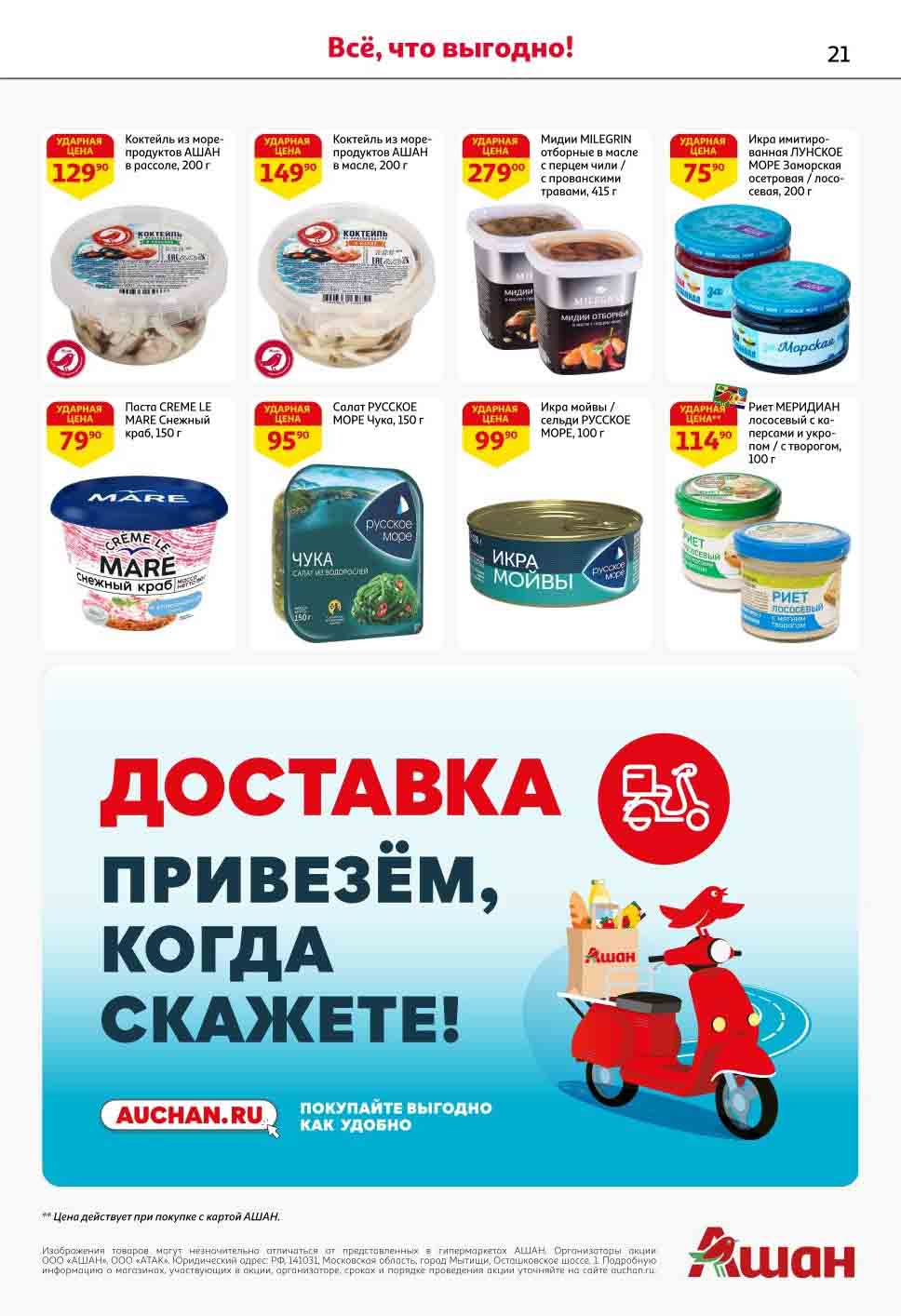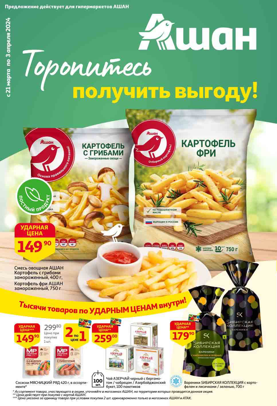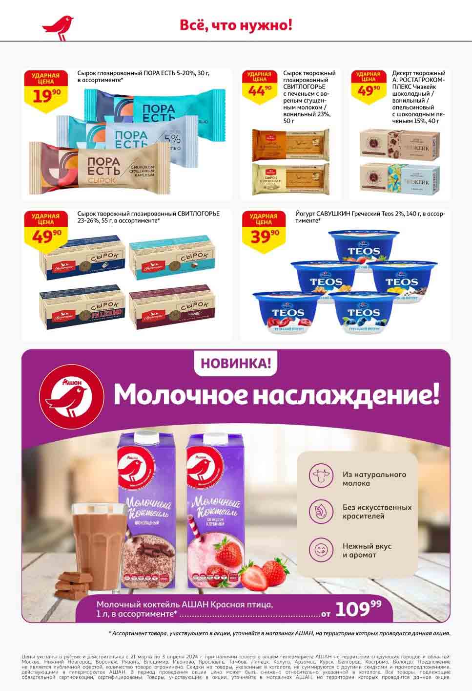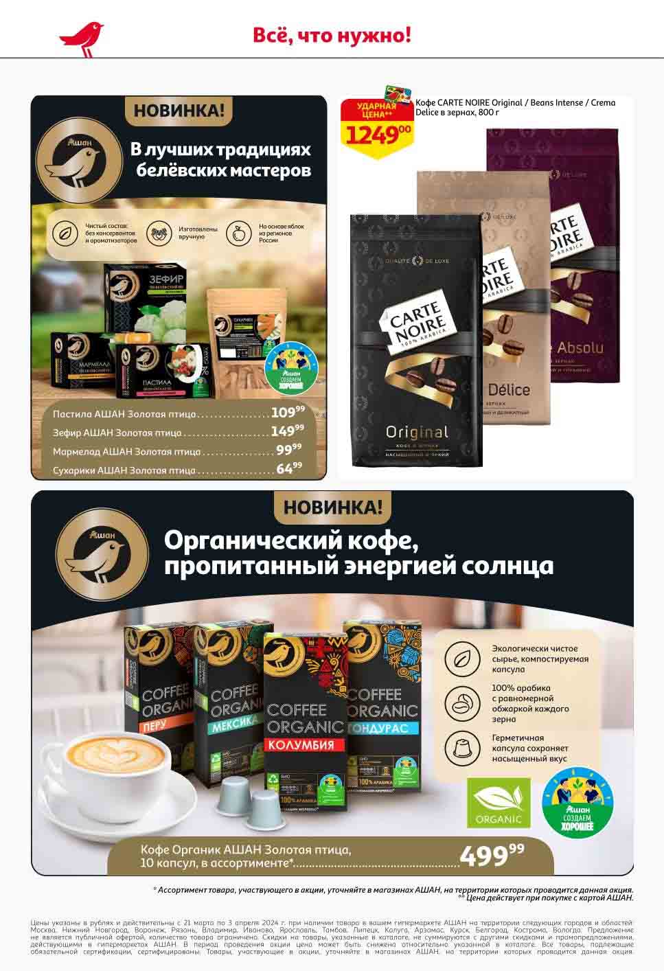 На страницах каталога Ашан вы найдете все свои любимые продукты, которые сейчас предлагаются в супермаркете. Не пропустите последние специальные предложения и сэкономьте на покупках. Предложение действительно при наличии товара на прилавках. Скидки на товары, указанные в каталоге, не суммируются с другими скидками. Изображения товаров могут незначительно отличаться от представленных на полках. Цены по акции Ашан действуют в городах: Москва. Балашиха. Химки. Подольск. Королев. Мытищи. Люберцы. Электросталь. Коломна. Одинцово. Железнодорожный, Серпухов, Орехово-Зуево. Красногорск, Щелково, Сергиев Посад, Пушкино. Жуковский, Ногинск, Раменское и многих других населенных пунктах Московского региона.