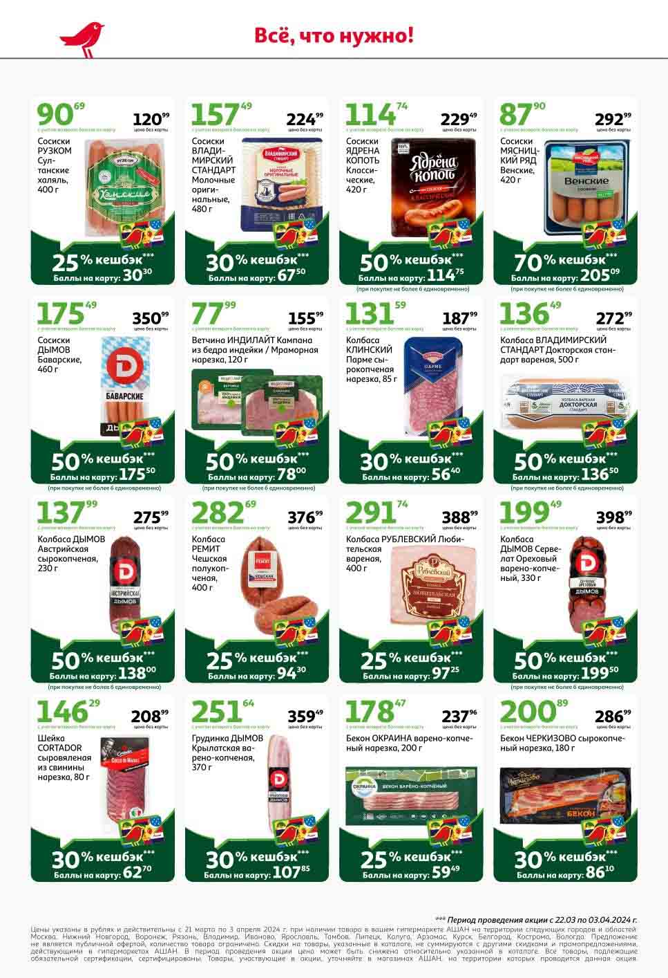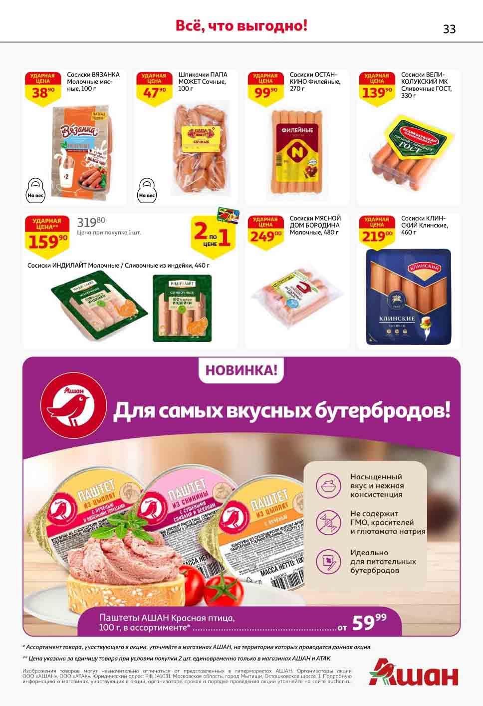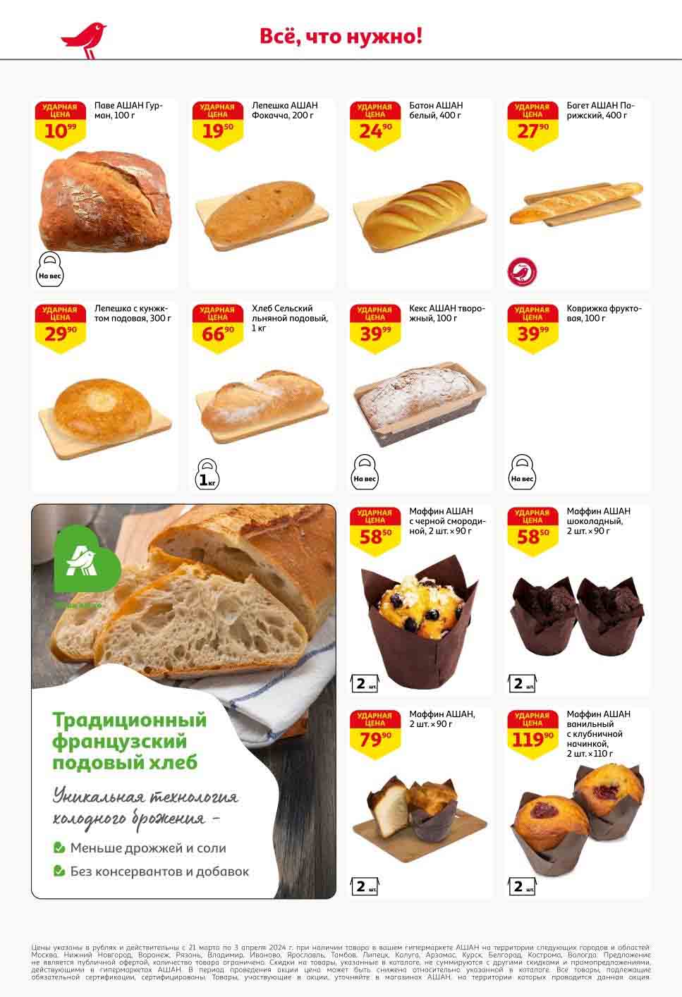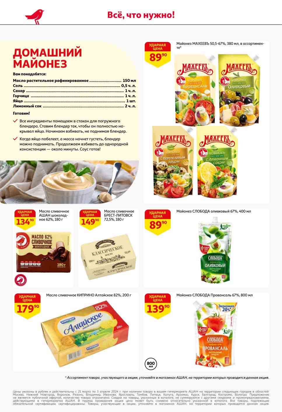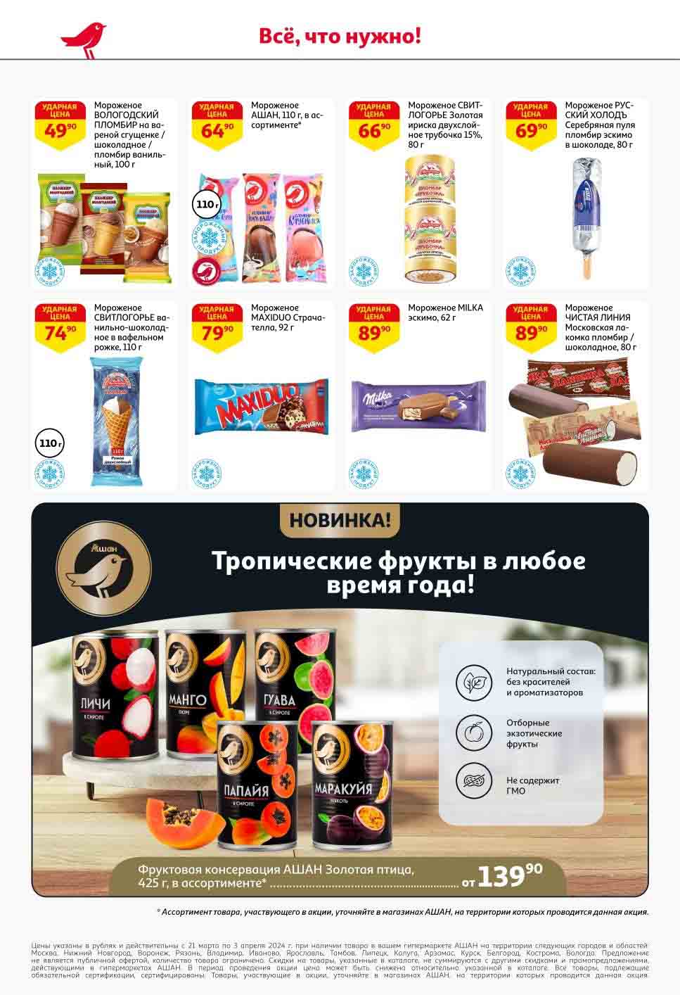 На страницах каталога Ашан вы найдете все свои любимые продукты, которые сейчас предлагаются в супермаркете. Не пропустите последние специальные предложения и сэкономьте на покупках. Предложение действительно при наличии товара на прилавках. Скидки на товары, указанные в каталоге, не суммируются с другими скидками. Изображения товаров могут незначительно отличаться от представленных на полках. Цены по акции Ашан действуют в городах: Москва. Балашиха. Химки. Подольск. Королев. Мытищи. Люберцы. Электросталь. Коломна. Одинцово. Железнодорожный, Серпухов, Орехово-Зуево. Красногорск, Щелково, Сергиев Посад, Пушкино. Жуковский, Ногинск, Раменское и многих других населенных пунктах Московского региона.