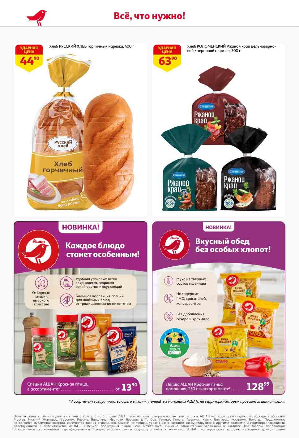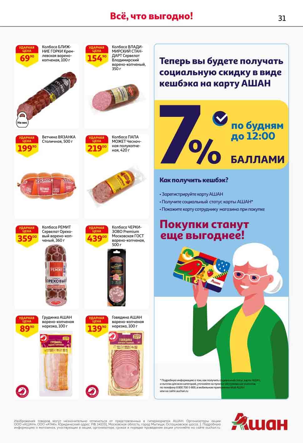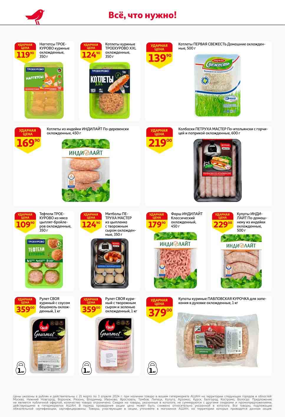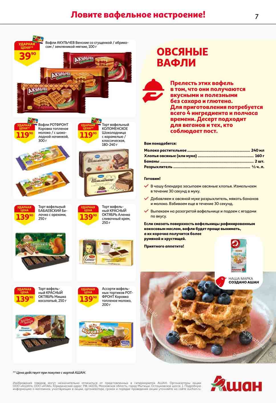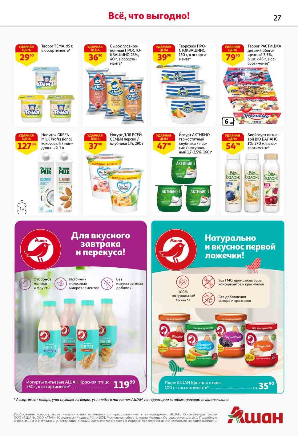 На страницах каталога Ашан вы найдете все свои любимые продукты, которые сейчас предлагаются в супермаркете. Не пропустите последние специальные предложения и сэкономьте на покупках. Предложение действительно при наличии товара на прилавках. Скидки на товары, указанные в каталоге, не суммируются с другими скидками. Изображения товаров могут незначительно отличаться от представленных на полках. Цены по акции Ашан действуют в городах: Москва. Балашиха. Химки. Подольск. Королев. Мытищи. Люберцы. Электросталь. Коломна. Одинцово. Железнодорожный, Серпухов, Орехово-Зуево. Красногорск, Щелково, Сергиев Посад, Пушкино. Жуковский, Ногинск, Раменское и многих других населенных пунктах Московского региона.