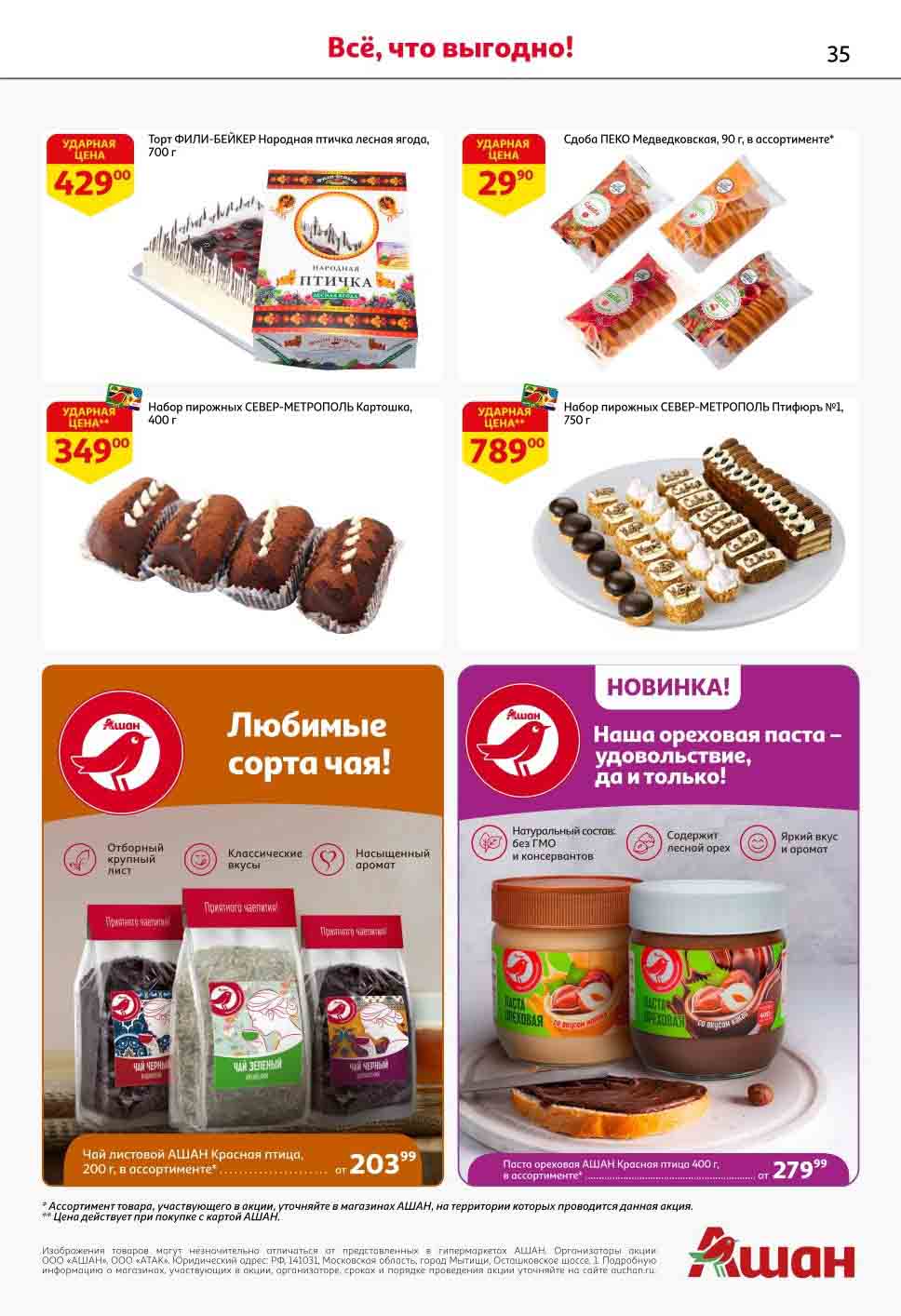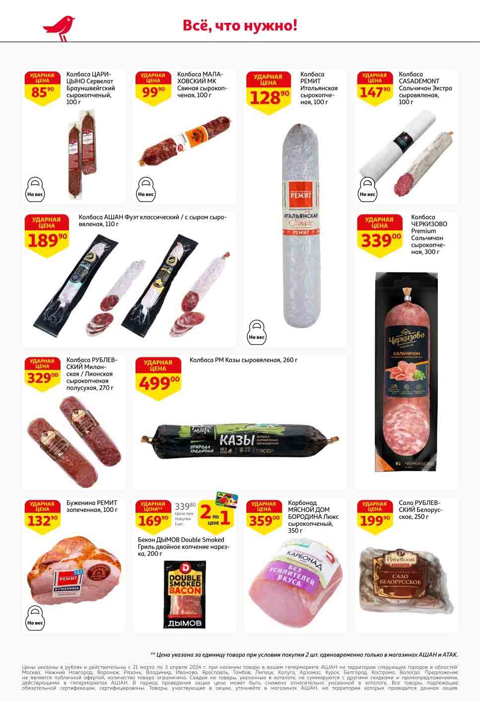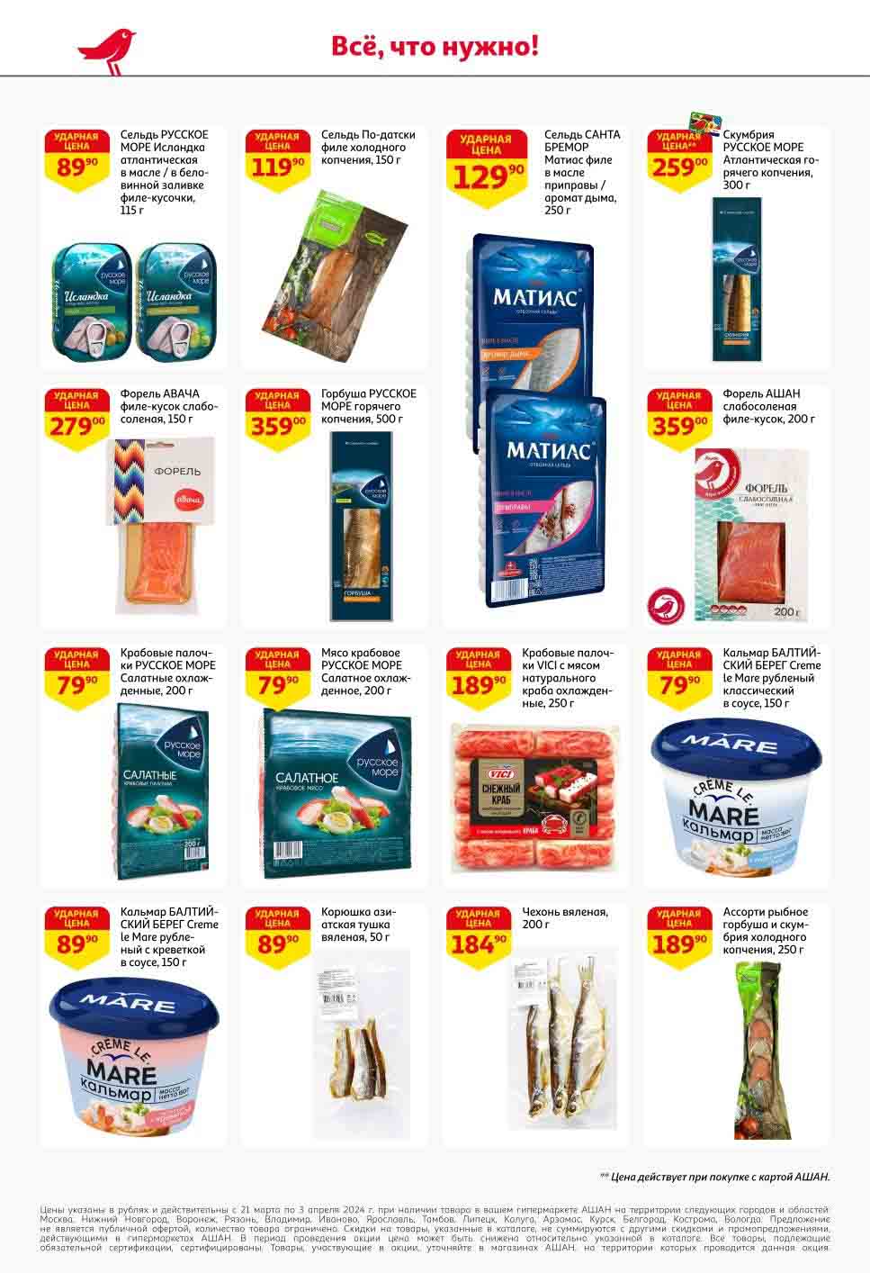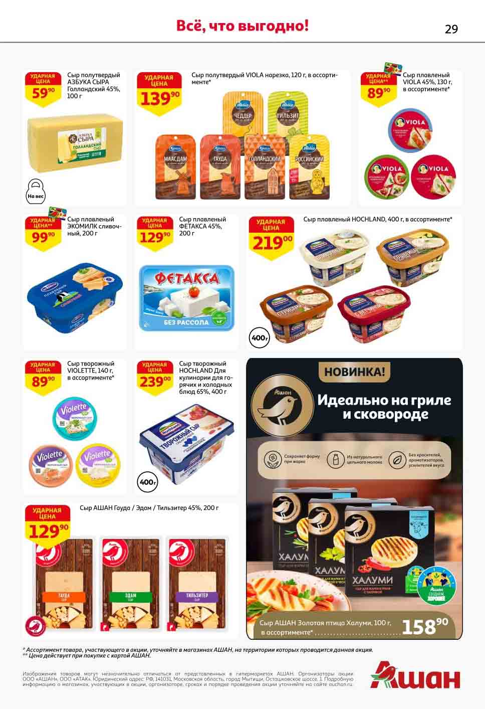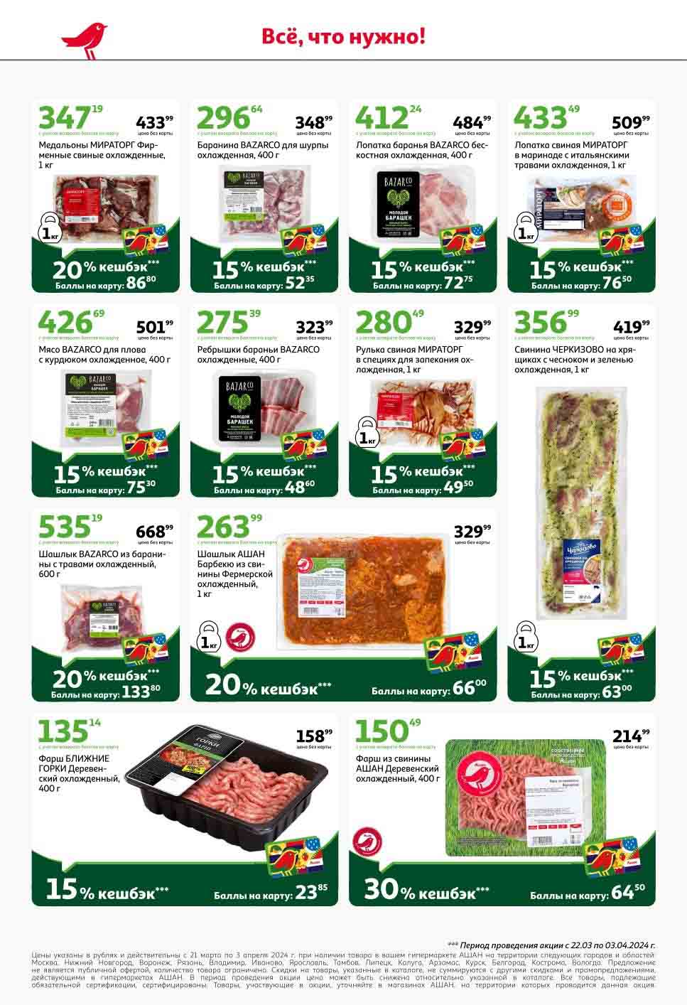 На страницах каталога Ашан вы найдете все свои любимые продукты, которые сейчас предлагаются в супермаркете. Не пропустите последние специальные предложения и сэкономьте на покупках. Предложение действительно при наличии товара на прилавках. Скидки на товары, указанные в каталоге, не суммируются с другими скидками. Изображения товаров могут незначительно отличаться от представленных на полках. Цены по акции Ашан действуют в городах: Москва. Балашиха. Химки. Подольск. Королев. Мытищи. Люберцы. Электросталь. Коломна. Одинцово. Железнодорожный, Серпухов, Орехово-Зуево. Красногорск, Щелково, Сергиев Посад, Пушкино. Жуковский, Ногинск, Раменское и многих других населенных пунктах Московского региона.