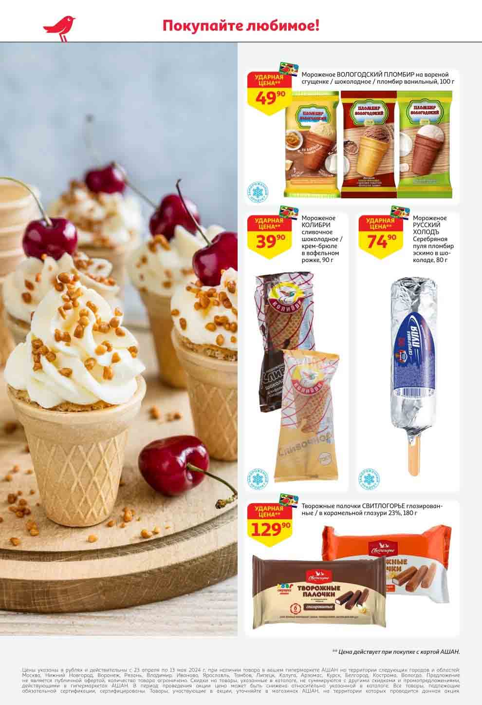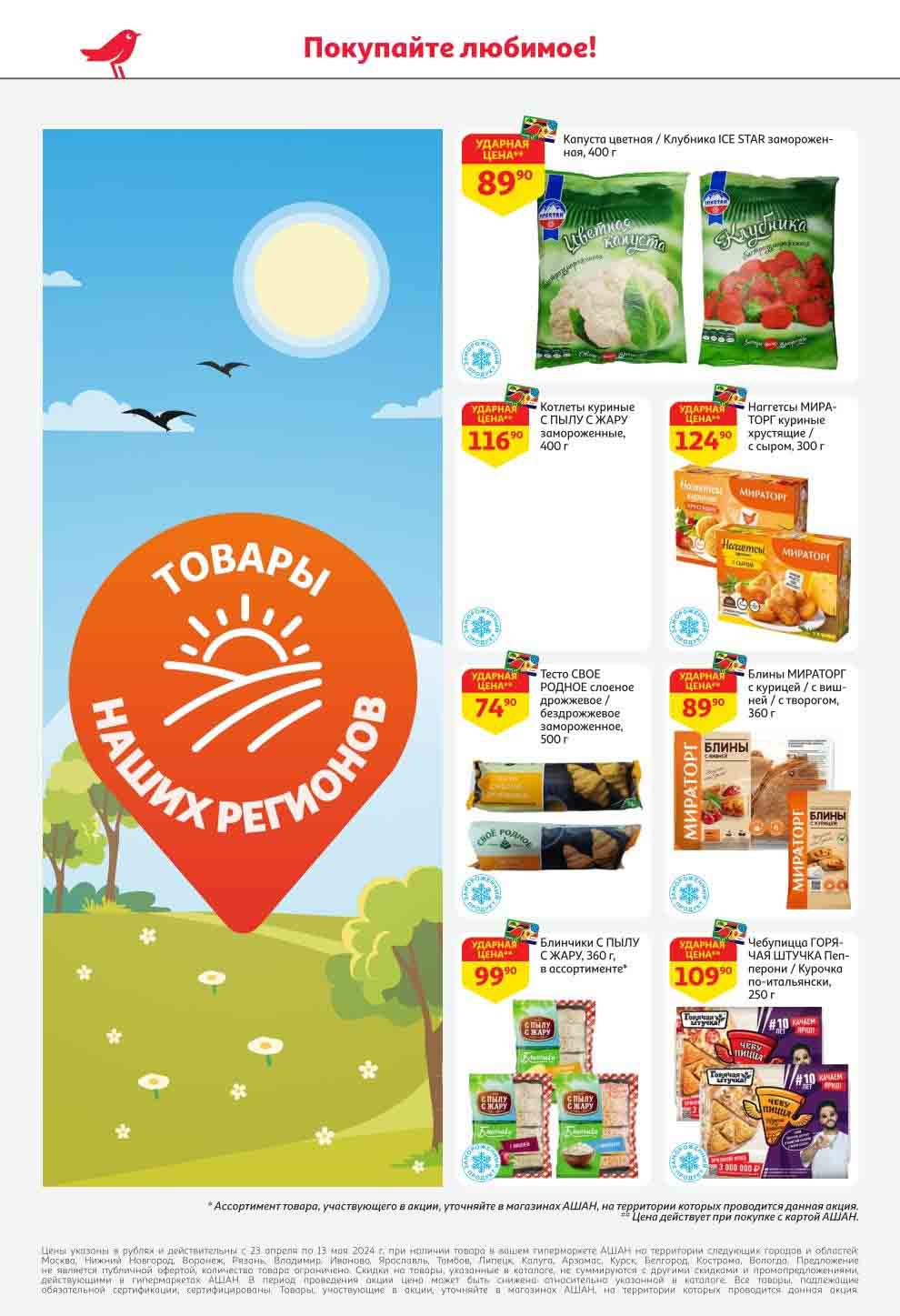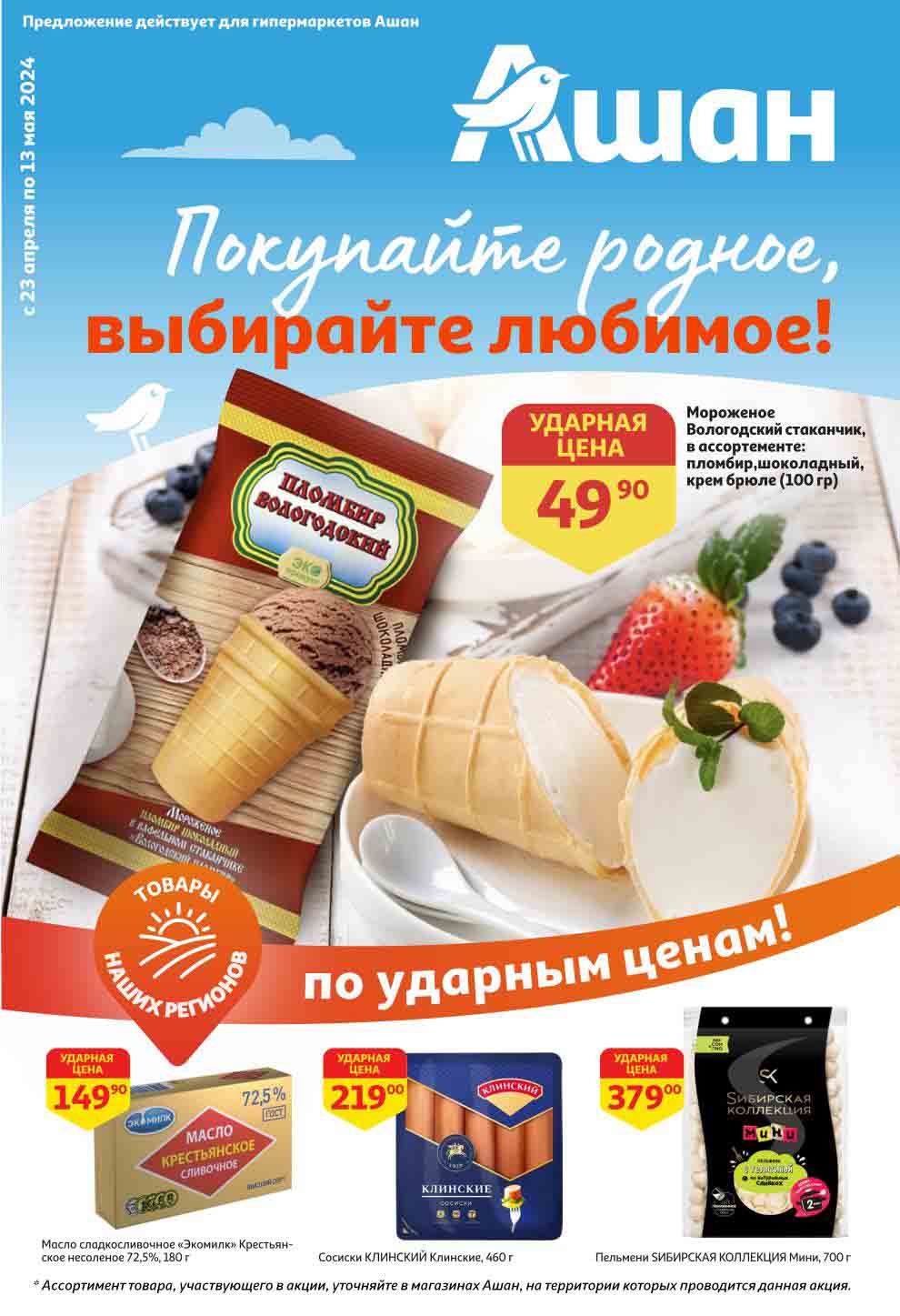 На страницах каталога Ашан вы найдете все свои любимые продукты, которые сейчас предлагаются в супермаркете. Не пропустите последние специальные предложения и сэкономьте на покупках. Предложение действительно при наличии товара на прилавках. Скидки на товары, указанные в каталоге, не суммируются с другими скидками. Изображения товаров могут незначительно отличаться от представленных на полках. Цены по акции Ашан действуют в городах: Москва. Балашиха. Химки. Подольск. Королев. Мытищи. Люберцы. Электросталь. Коломна. Одинцово. Железнодорожный, Серпухов, Орехово-Зуево. Красногорск, Щелково, Сергиев Посад, Пушкино. Жуковский, Ногинск, Раменское и многих других населенных пунктах Московского региона.