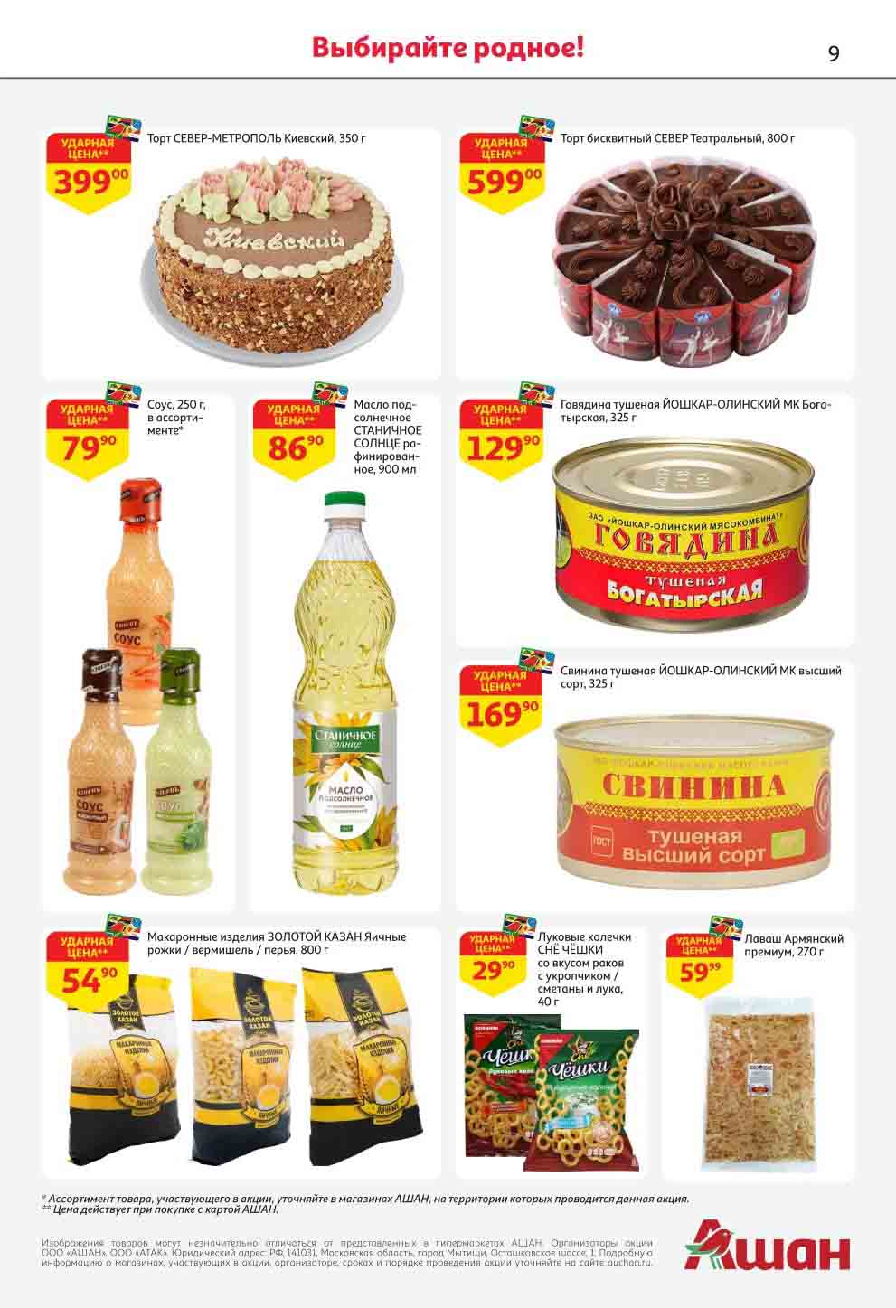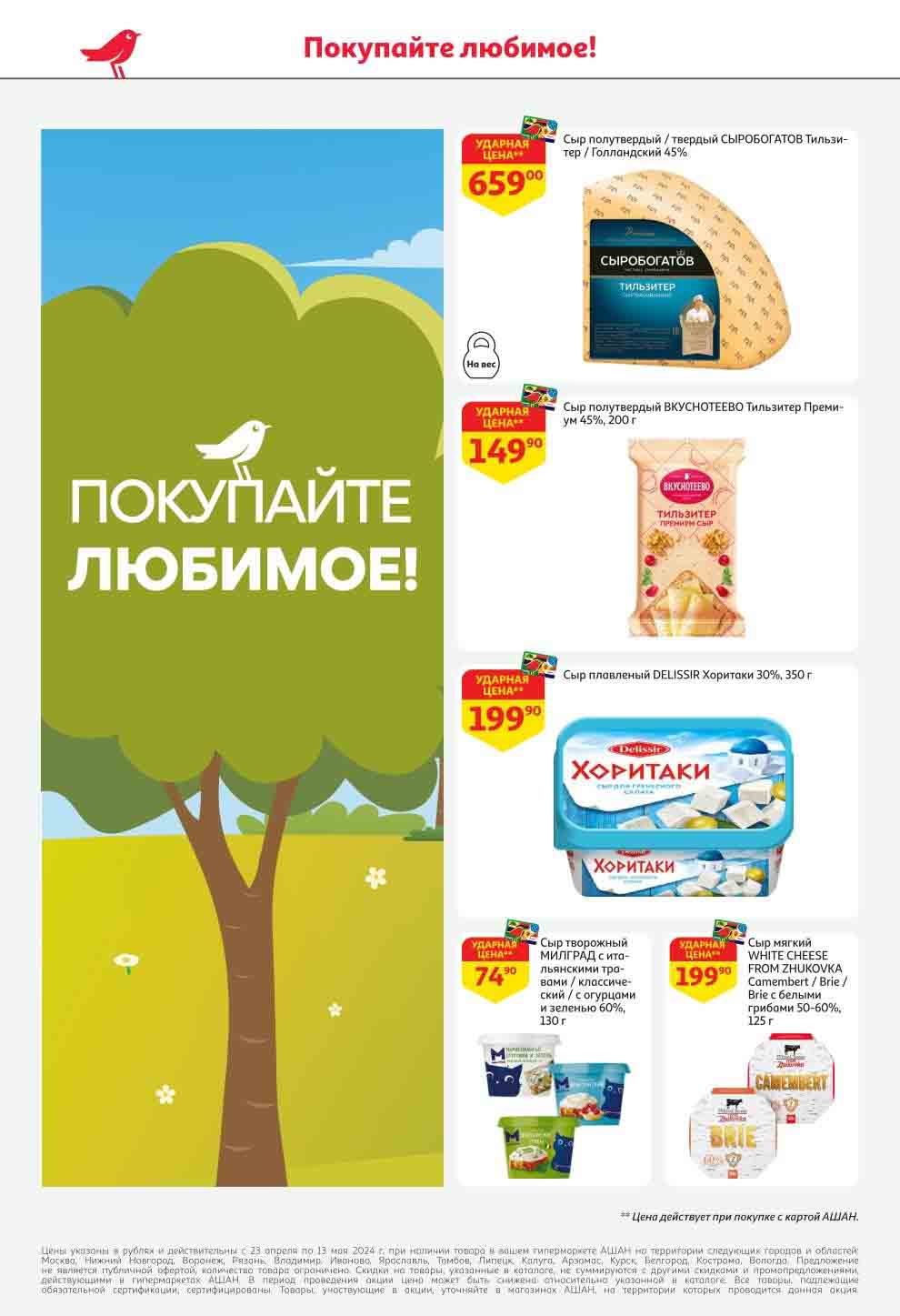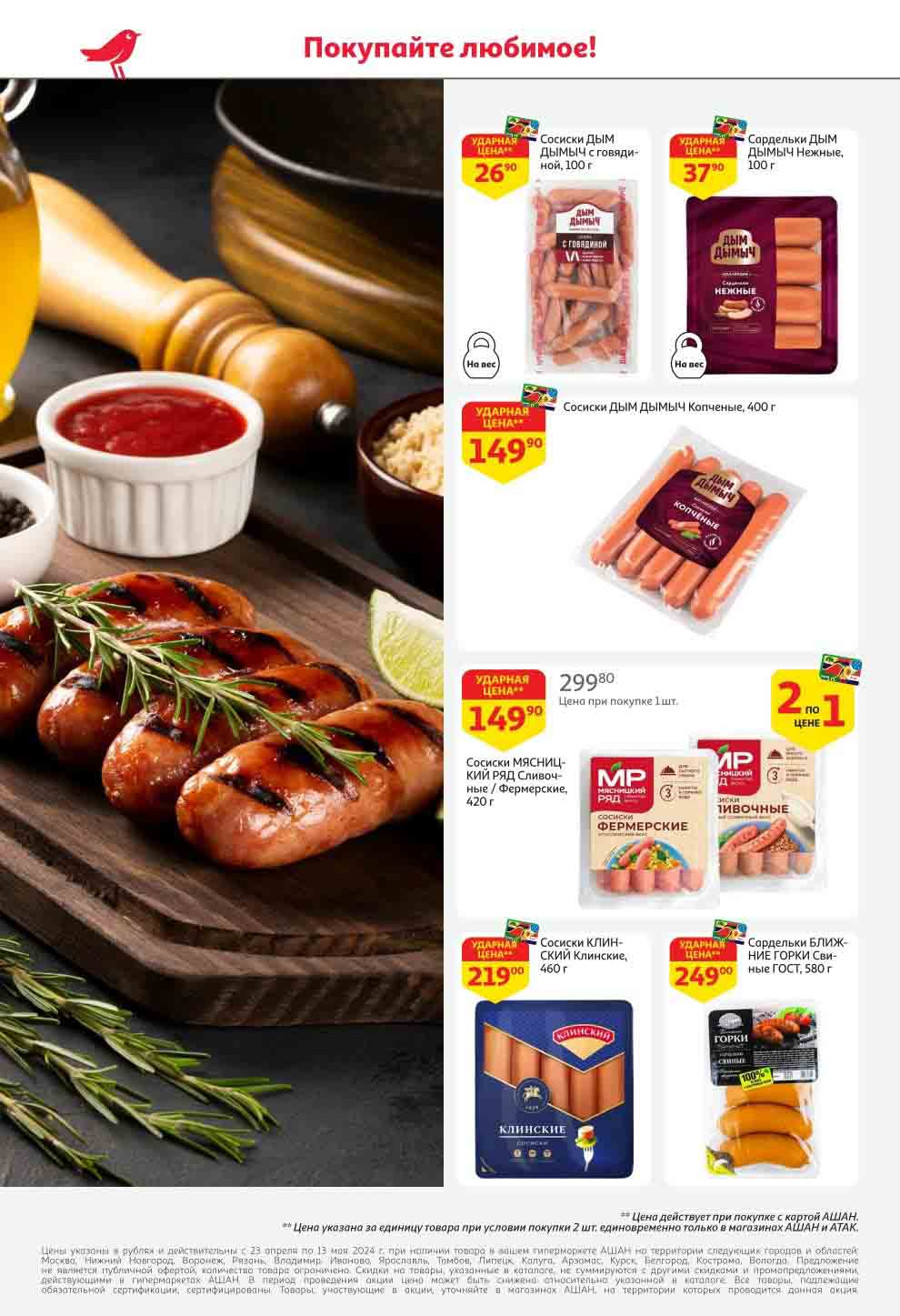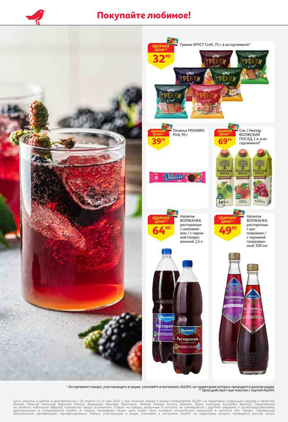 На страницах каталога Ашан вы найдете все свои любимые продукты, которые сейчас предлагаются в супермаркете. Не пропустите последние специальные предложения и сэкономьте на покупках. Предложение действительно при наличии товара на прилавках. Скидки на товары, указанные в каталоге, не суммируются с другими скидками. Изображения товаров могут незначительно отличаться от представленных на полках. Цены по акции Ашан действуют в городах: Москва. Балашиха. Химки. Подольск. Королев. Мытищи. Люберцы. Электросталь. Коломна. Одинцово. Железнодорожный, Серпухов, Орехово-Зуево. Красногорск, Щелково, Сергиев Посад, Пушкино. Жуковский, Ногинск, Раменское и многих других населенных пунктах Московского региона.