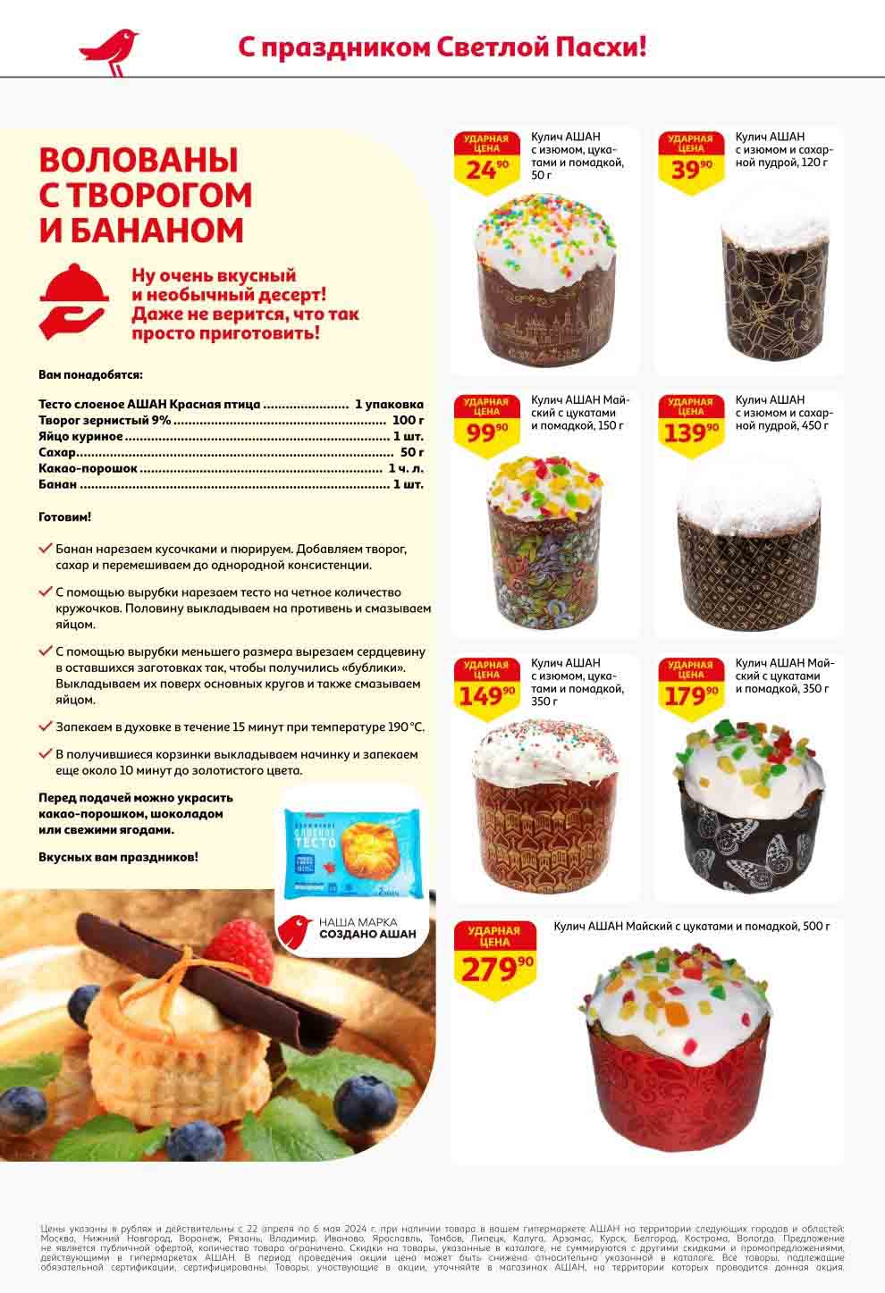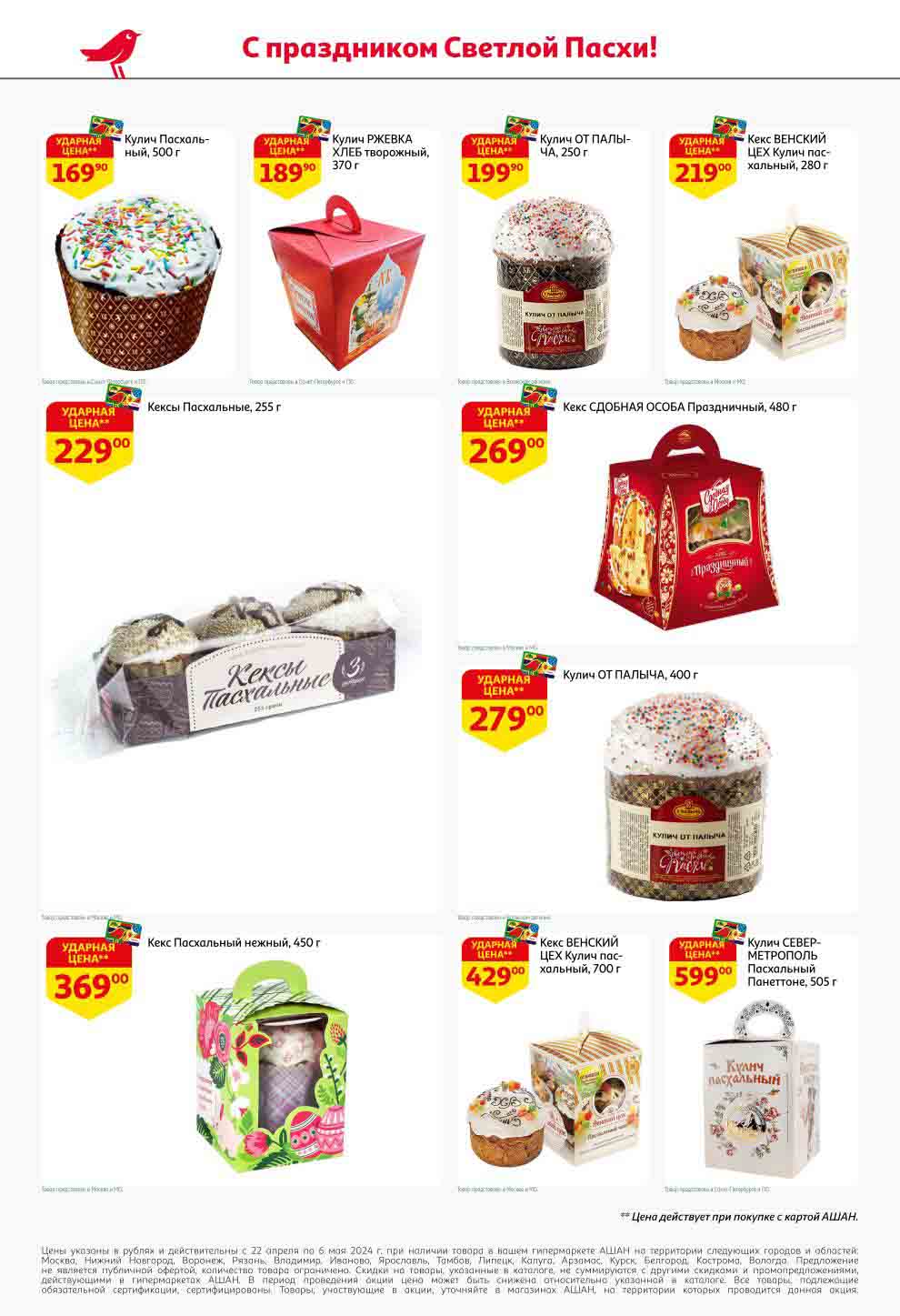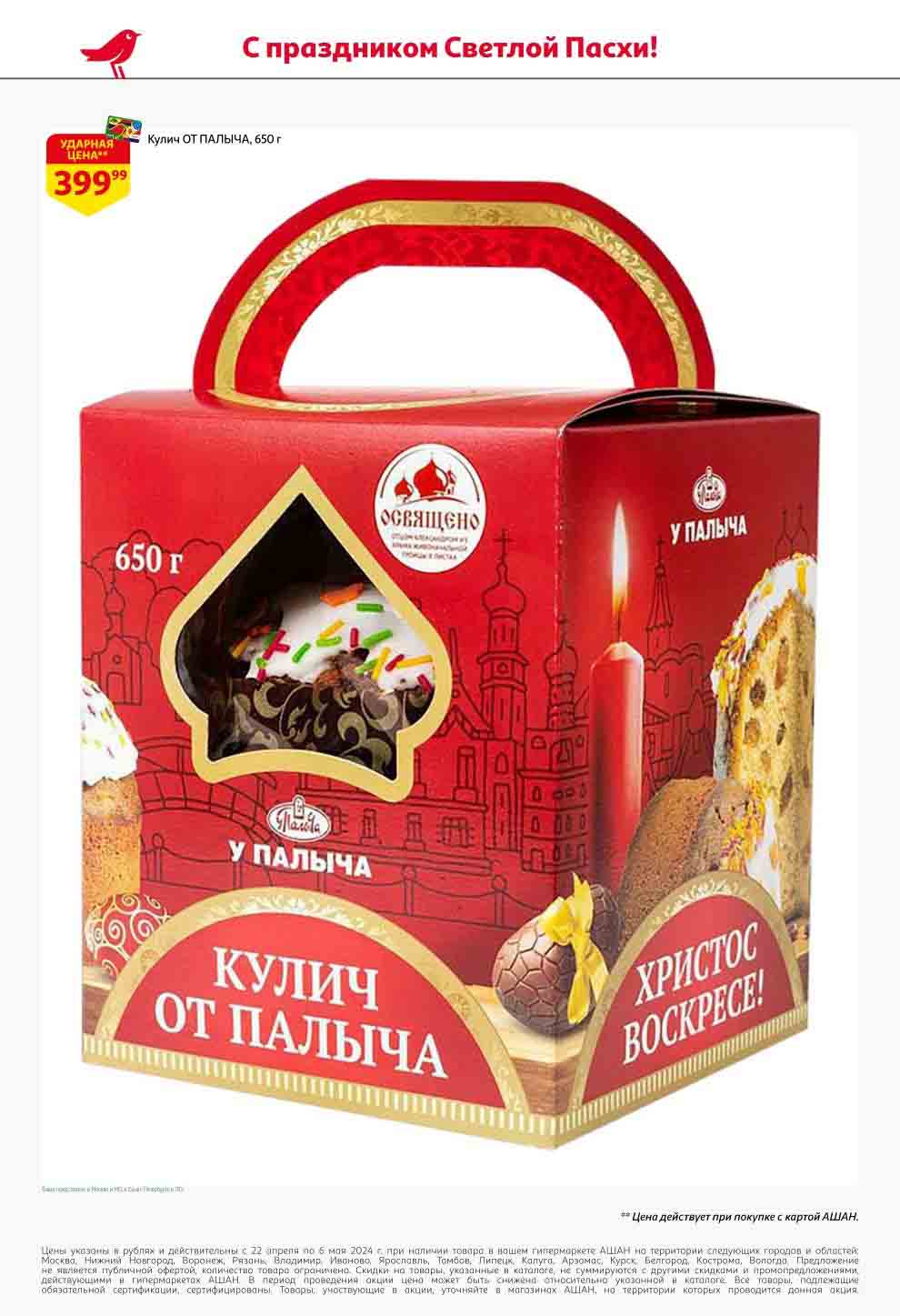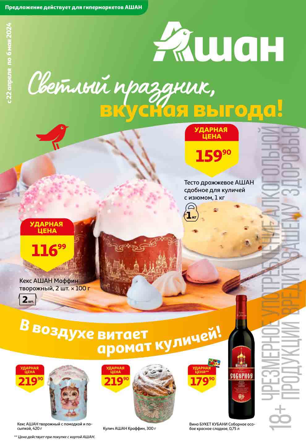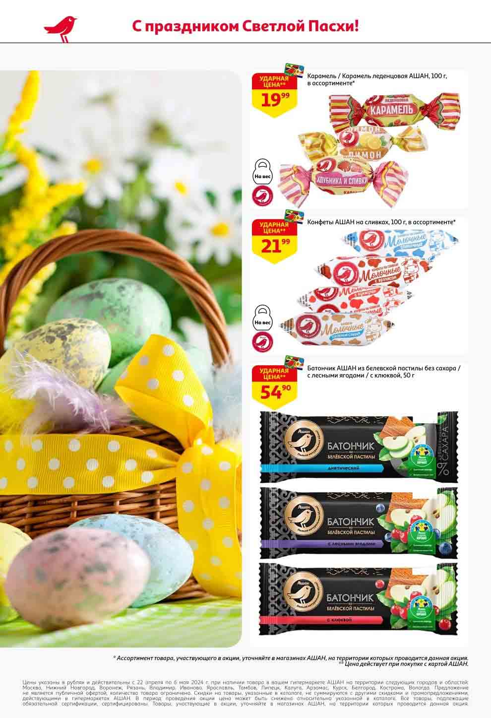 На страницах каталога Ашан вы найдете все свои любимые продукты, которые сейчас предлагаются в супермаркете. Не пропустите последние специальные предложения и сэкономьте на покупках. Предложение действительно при наличии товара на прилавках. Скидки на товары, указанные в каталоге, не суммируются с другими скидками. Изображения товаров могут незначительно отличаться от представленных на полках. Цены по акции Ашан действуют в городах: Москва. Балашиха. Химки. Подольск. Королев. Мытищи. Люберцы. Электросталь. Коломна. Одинцово. Железнодорожный, Серпухов, Орехово-Зуево. Красногорск, Щелково, Сергиев Посад, Пушкино. Жуковский, Ногинск, Раменское и многих других населенных пунктах Московского региона.