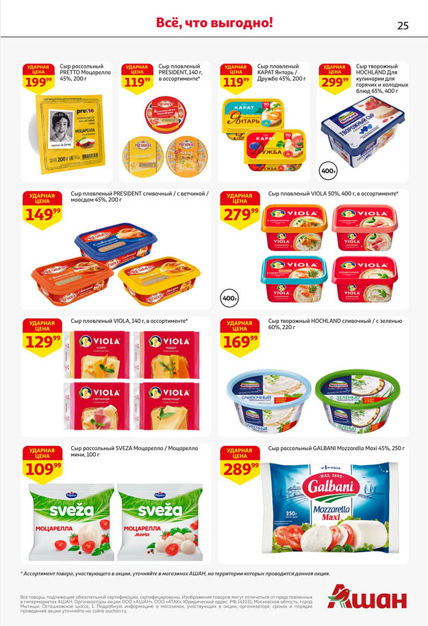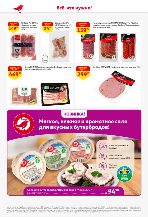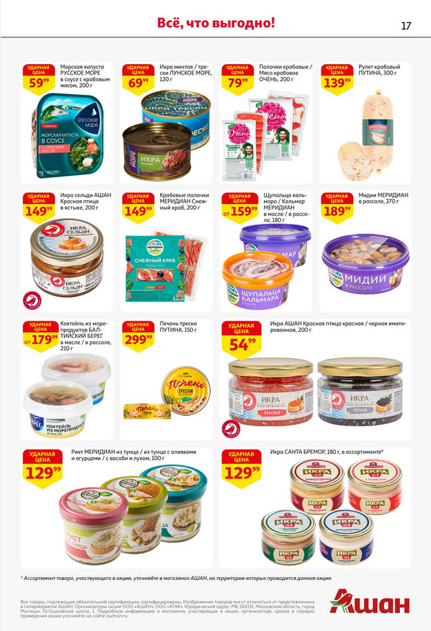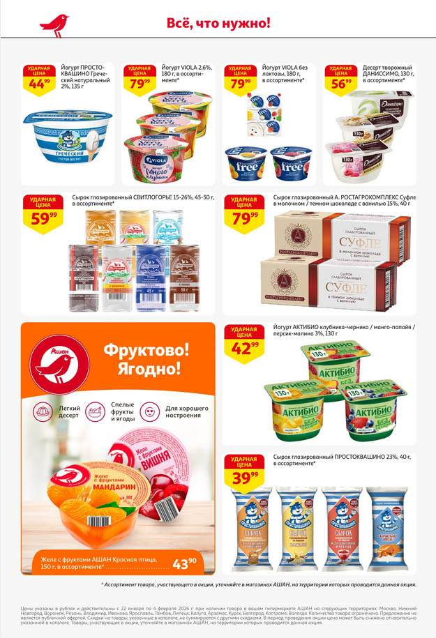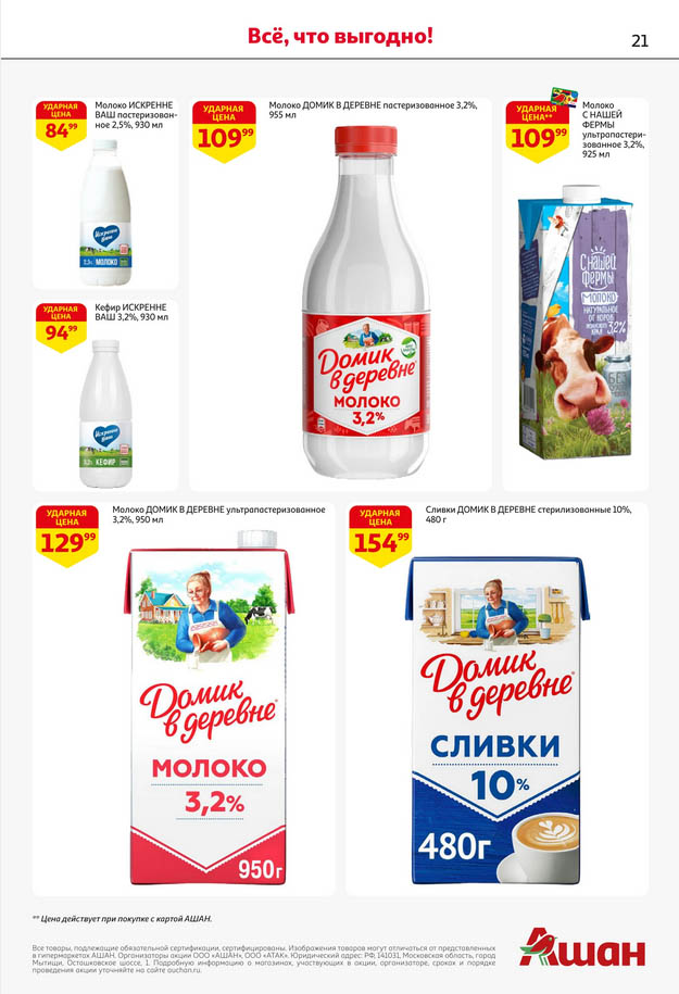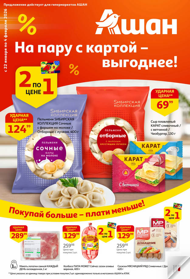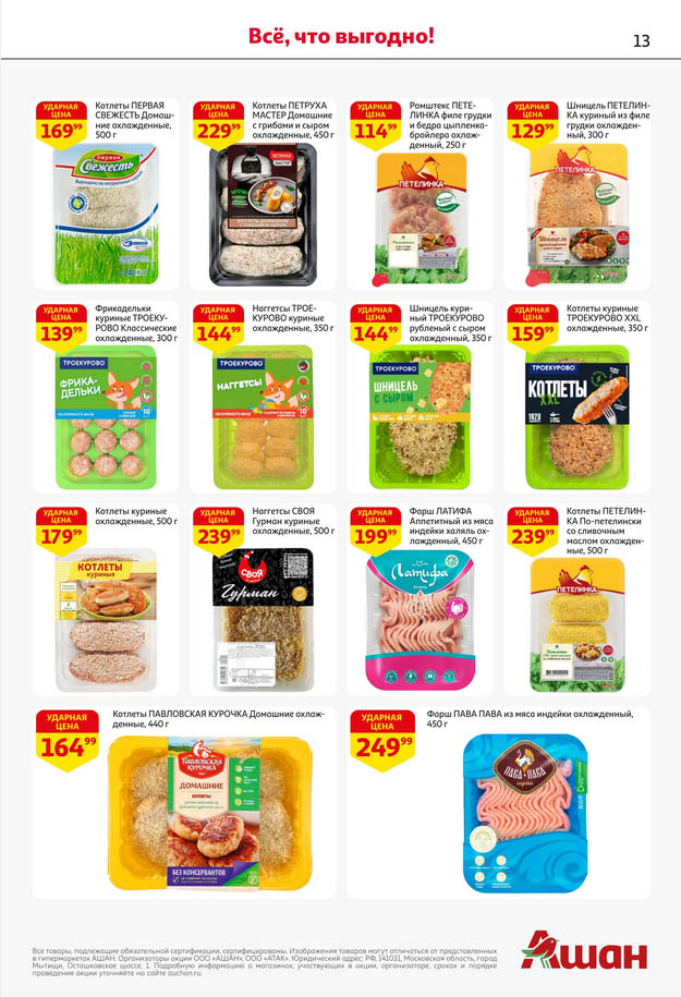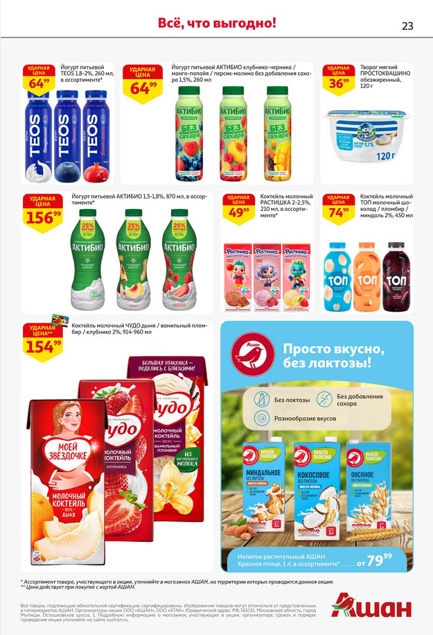На страницах каталога Ашан вы найдете все свои любимые продукты, которые сейчас предлагаются в супермаркете. Не пропустите последние специальные предложения и сэкономьте на покупках. Предложение действительно при наличии товара на прилавках. Скидки на товары, указанные в каталоге, не суммируются с другими скидками. Изображения товаров могут незначительно отличаться от представленных на полках. Цены по акции Ашан действуют в городах: Москва. Балашиха. Химки. Подольск. Королев. Мытищи. Люберцы. Электросталь. Коломна. Одинцово. Железнодорожный, Серпухов, Орехово-Зуево. Красногорск, Щелково, Сергиев Посад, Пушкино. Жуковский, Ногинск, Раменское и многих других населенных пунктах Московского региона.