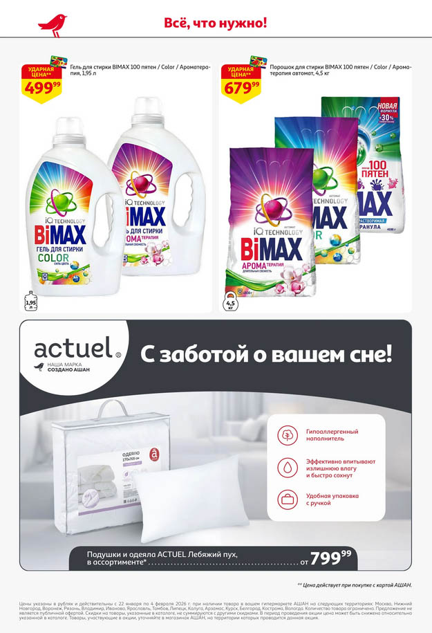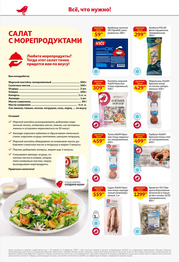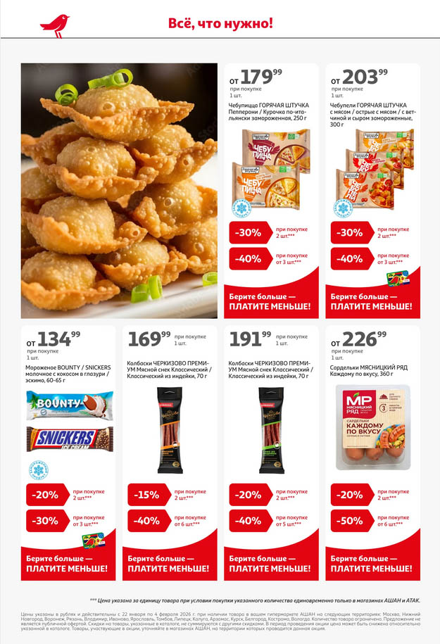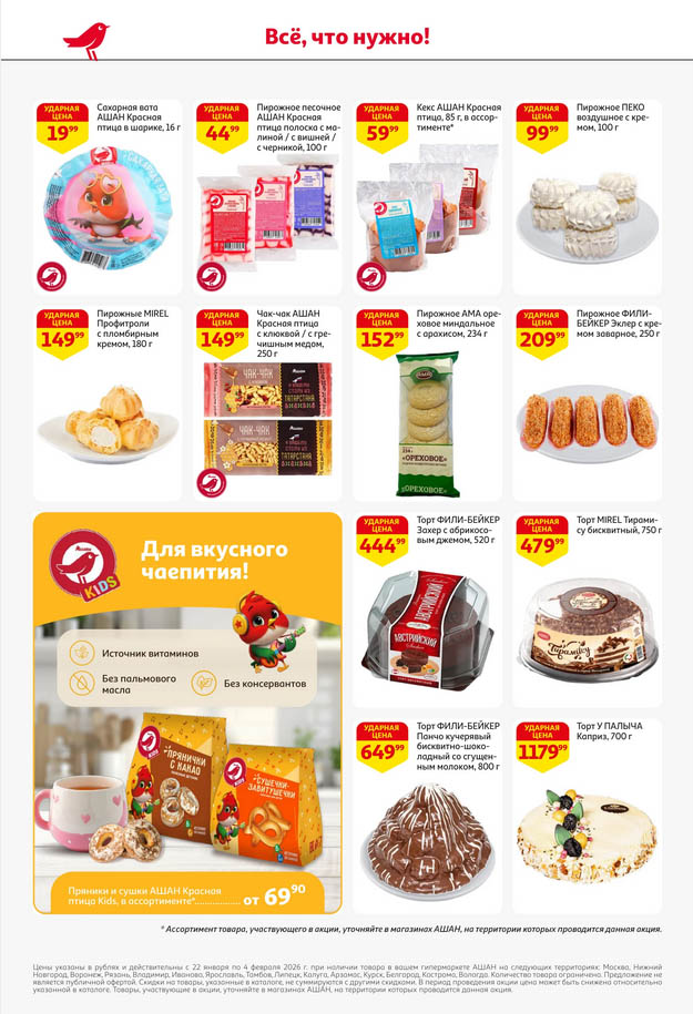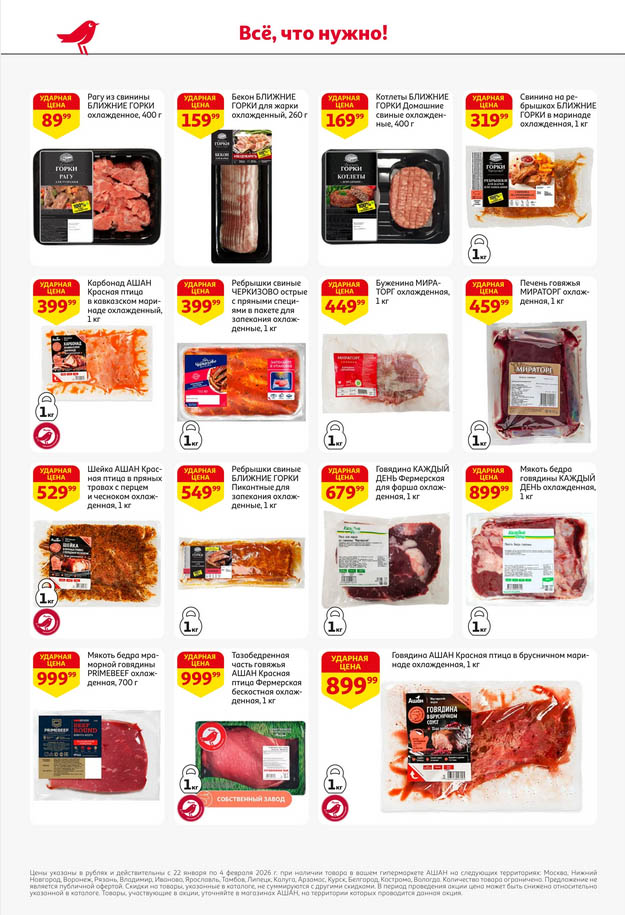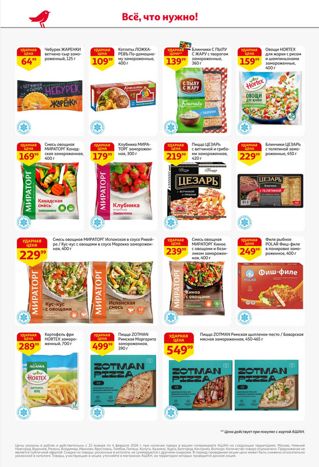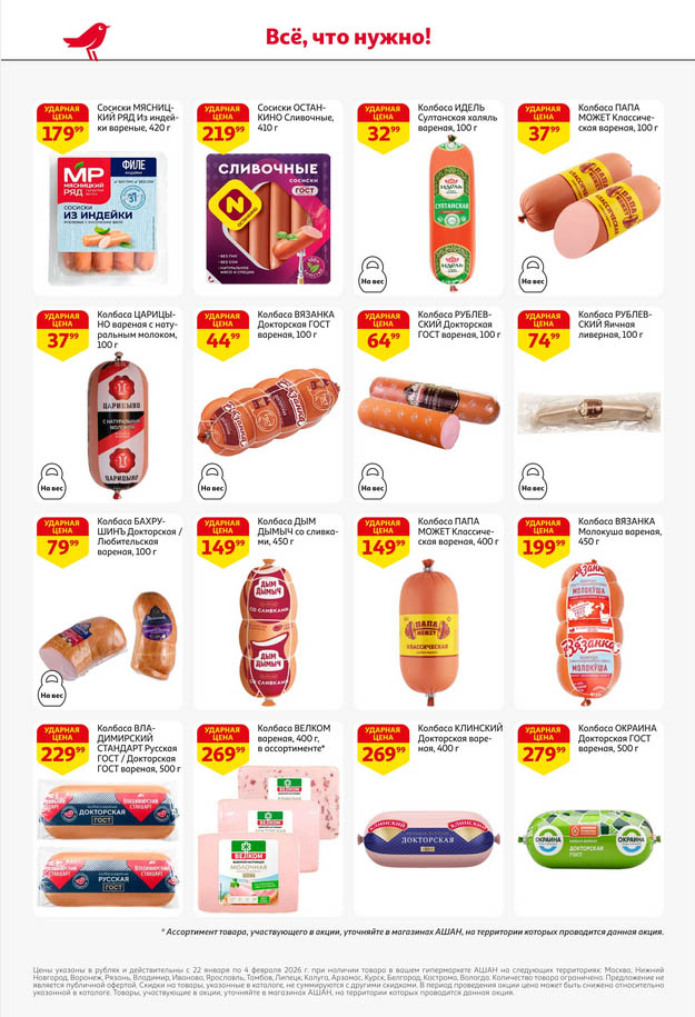На страницах каталога Ашан вы найдете все свои любимые продукты, которые сейчас предлагаются в супермаркете. Не пропустите последние специальные предложения и сэкономьте на покупках. Предложение действительно при наличии товара на прилавках. Скидки на товары, указанные в каталоге, не суммируются с другими скидками. Изображения товаров могут незначительно отличаться от представленных на полках. Цены по акции Ашан действуют в городах: Москва. Балашиха. Химки. Подольск. Королев. Мытищи. Люберцы. Электросталь. Коломна. Одинцово. Железнодорожный, Серпухов, Орехово-Зуево. Красногорск, Щелково, Сергиев Посад, Пушкино. Жуковский, Ногинск, Раменское и многих других населенных пунктах Московского региона.