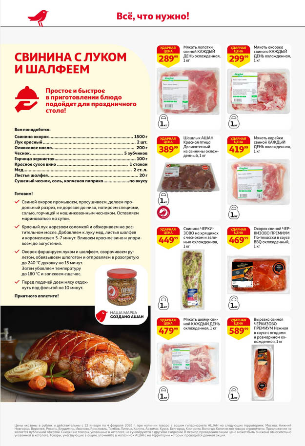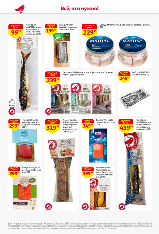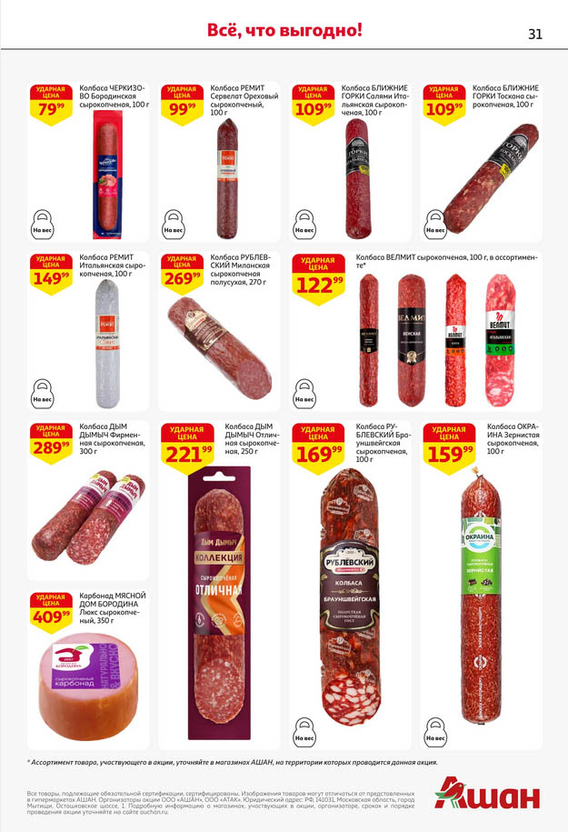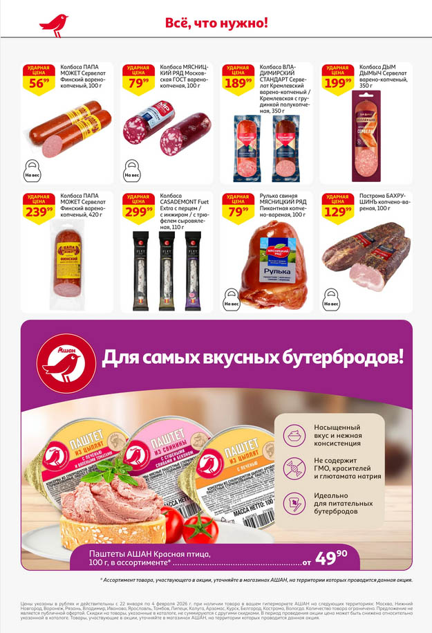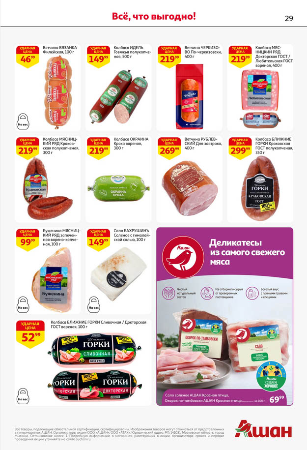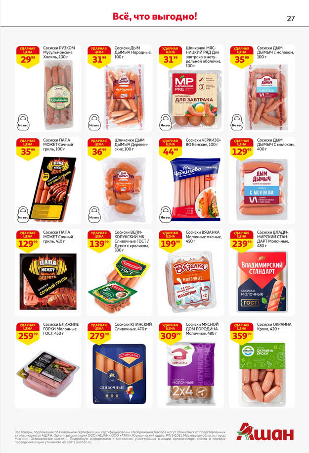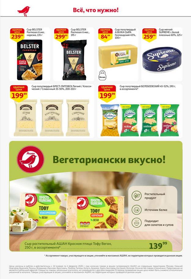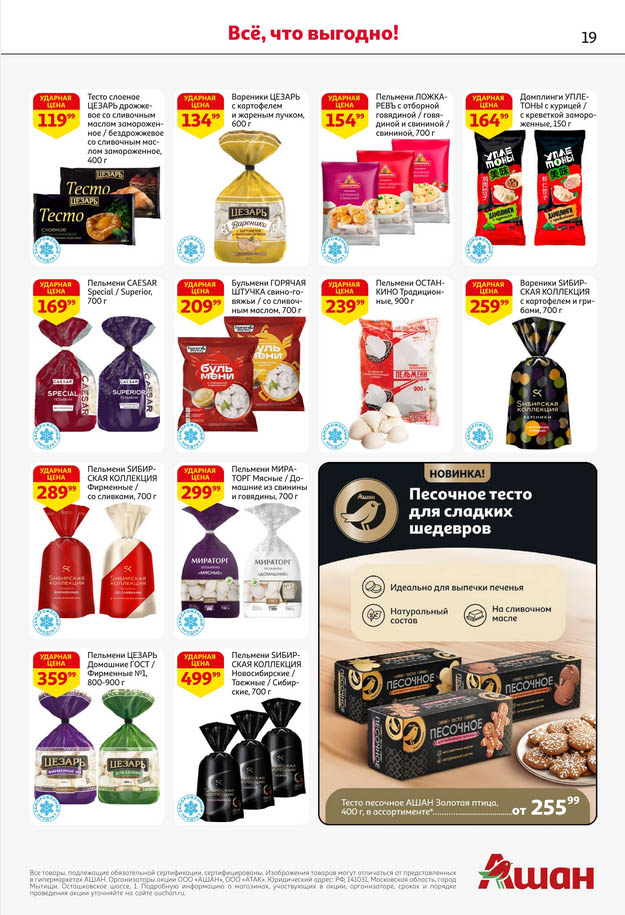 На страницах каталога Ашан вы найдете все свои любимые продукты, которые сейчас предлагаются в супермаркете. Не пропустите последние специальные предложения и сэкономьте на покупках. Предложение действительно при наличии товара на прилавках. Скидки на товары, указанные в каталоге, не суммируются с другими скидками. Изображения товаров могут незначительно отличаться от представленных на полках. Цены по акции Ашан действуют в городах: Москва. Балашиха. Химки. Подольск. Королев. Мытищи. Люберцы. Электросталь. Коломна. Одинцово. Железнодорожный, Серпухов, Орехово-Зуево. Красногорск, Щелково, Сергиев Посад, Пушкино. Жуковский, Ногинск, Раменское и многих других населенных пунктах Московского региона.