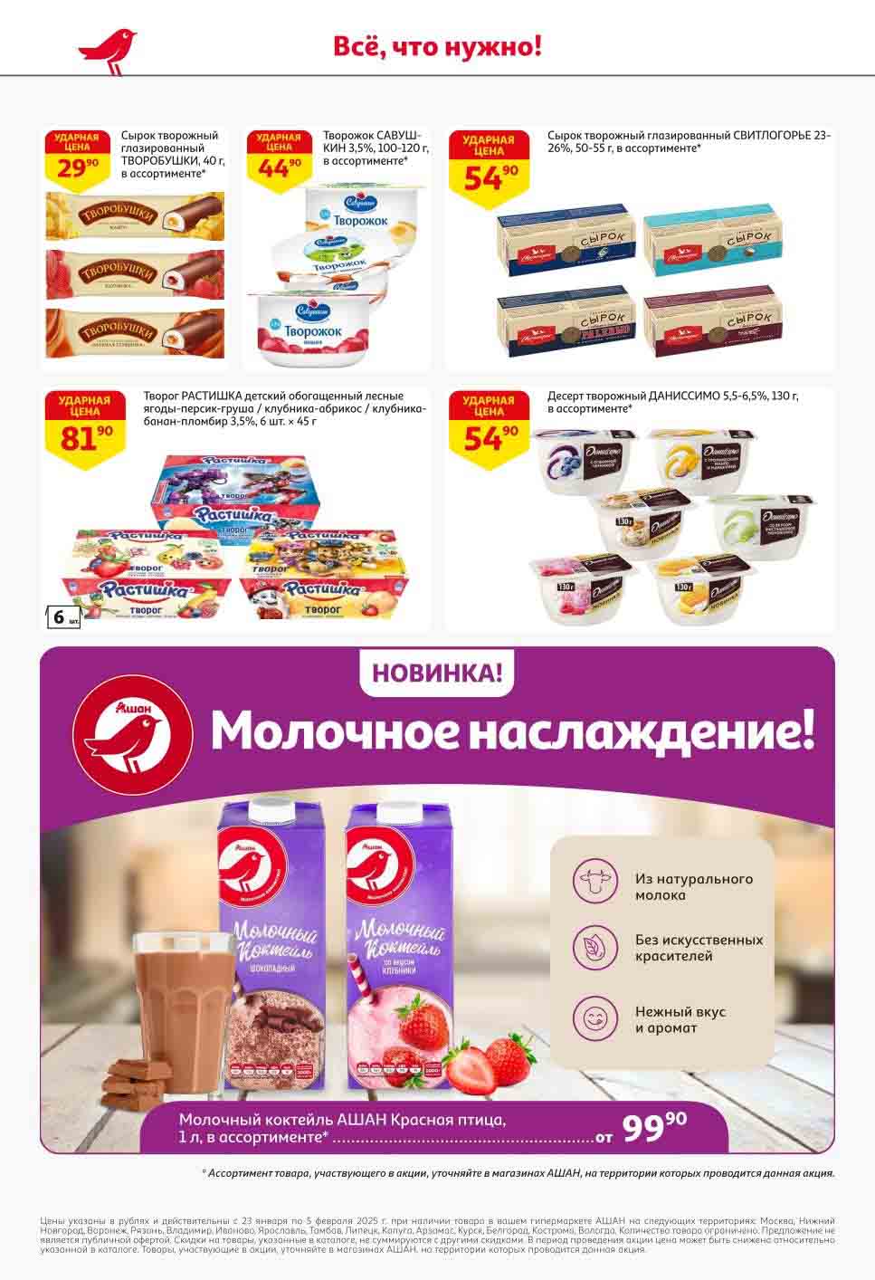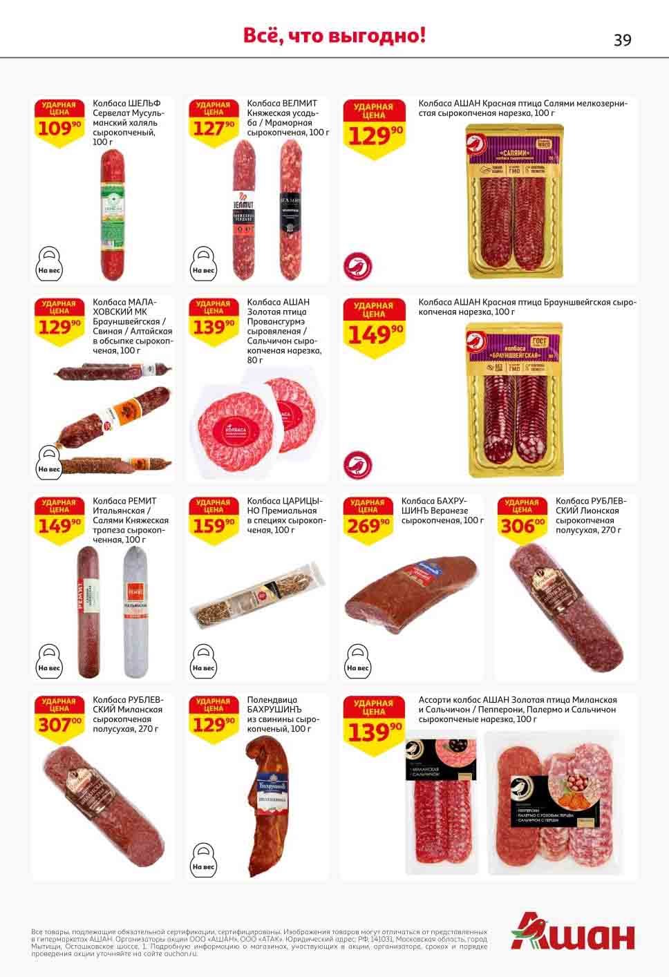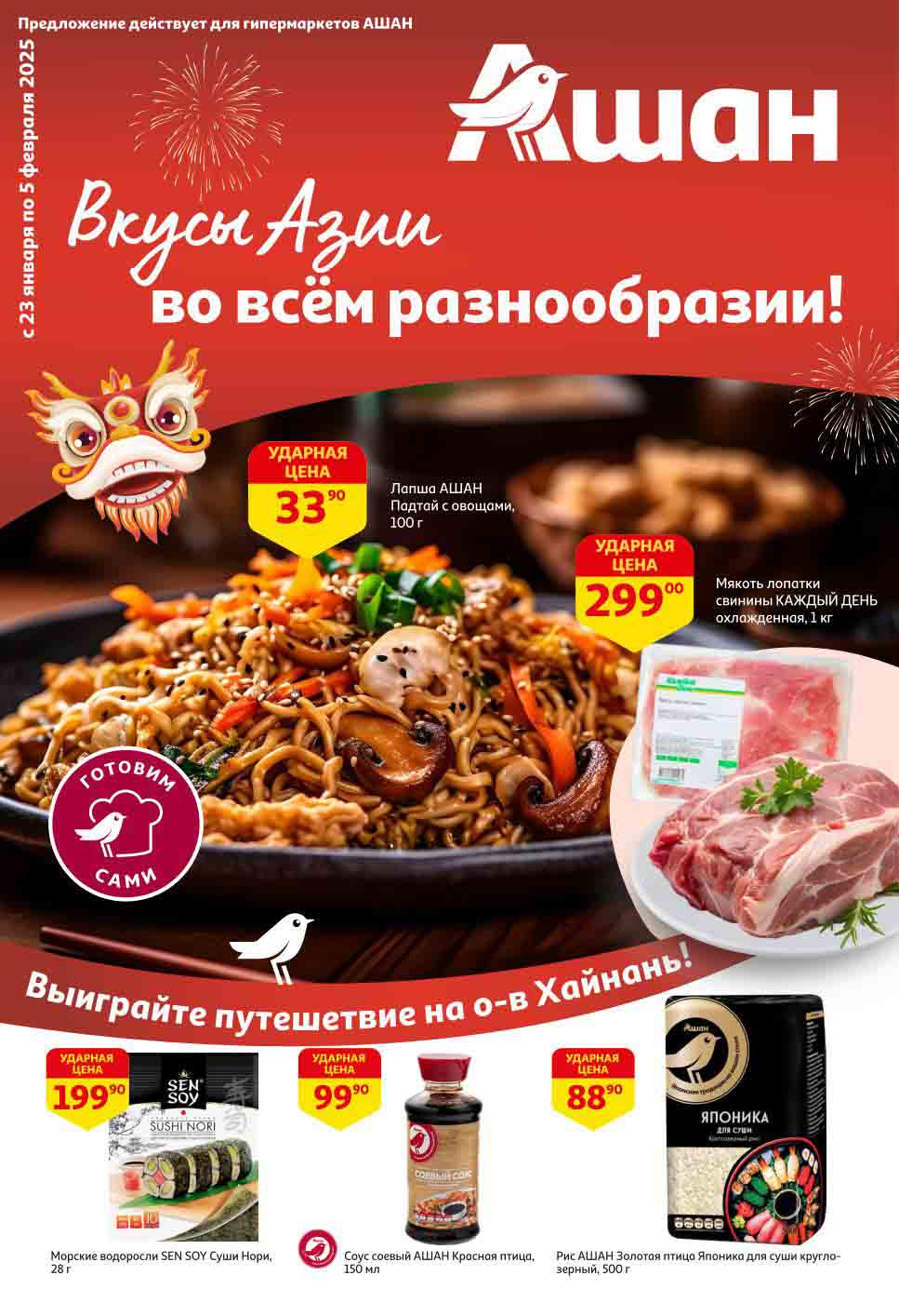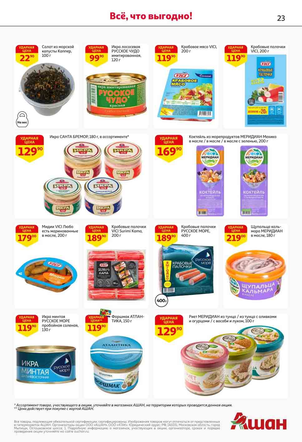 На страницах каталога Ашан вы найдете все свои любимые продукты, которые сейчас предлагаются в супермаркете. Не пропустите последние специальные предложения и сэкономьте на покупках. Предложение действительно при наличии товара на прилавках. Скидки на товары, указанные в каталоге, не суммируются с другими скидками. Изображения товаров могут незначительно отличаться от представленных на полках. Цены по акции Ашан действуют в городах: Москва. Балашиха. Химки. Подольск. Королев. Мытищи. Люберцы. Электросталь. Коломна. Одинцово. Железнодорожный, Серпухов, Орехово-Зуево. Красногорск, Щелково, Сергиев Посад, Пушкино. Жуковский, Ногинск, Раменское и многих других населенных пунктах Московского региона.