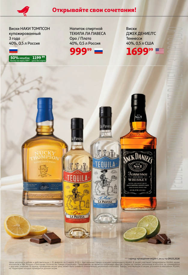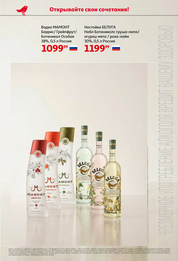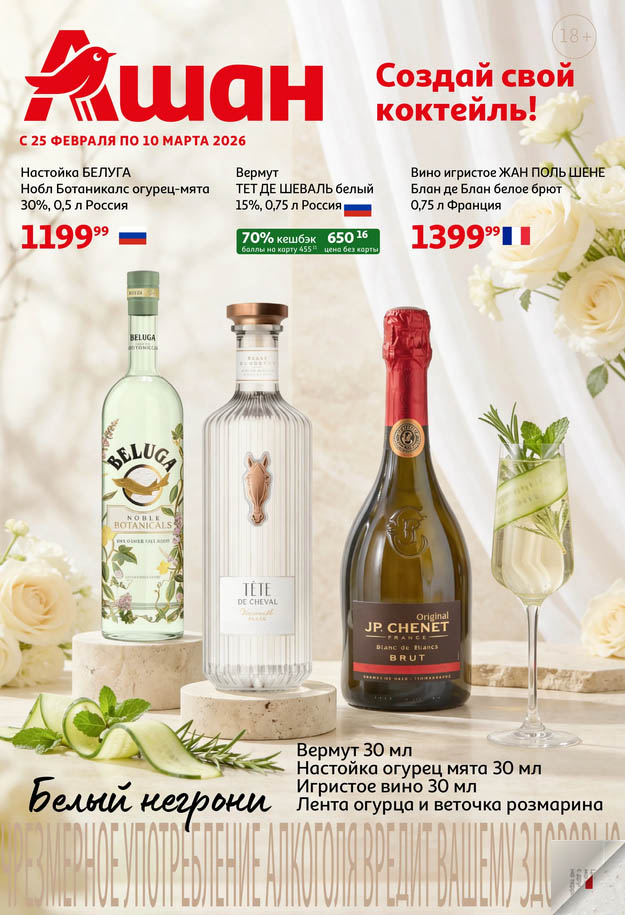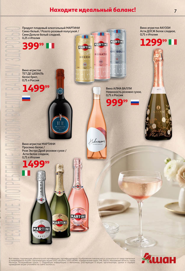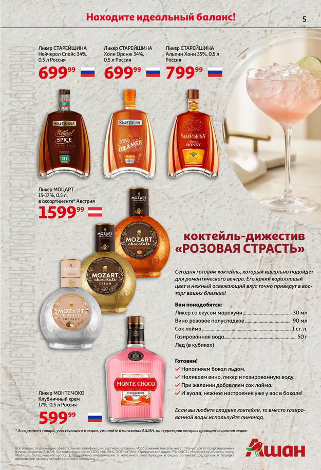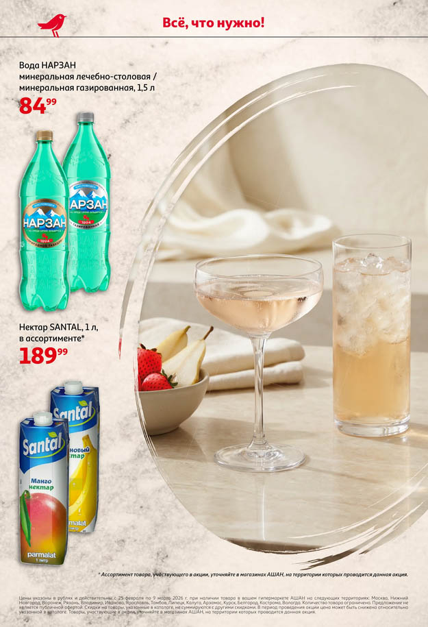 На страницах каталога Ашан вы найдете все свои любимые продукты, которые сейчас предлагаются в супермаркете. Не пропустите последние специальные предложения и сэкономьте на покупках. Предложение действительно при наличии товара на прилавках. Скидки на товары, указанные в каталоге, не суммируются с другими скидками. Изображения товаров могут незначительно отличаться от представленных на полках. Цены по акции Ашан действуют в городах: Москва. Балашиха. Химки. Подольск. Королев. Мытищи. Люберцы. Электросталь. Коломна. Одинцово. Железнодорожный, Серпухов, Орехово-Зуево. Красногорск, Щелково, Сергиев Посад, Пушкино. Жуковский, Ногинск, Раменское и многих других населенных пунктах Московского региона.