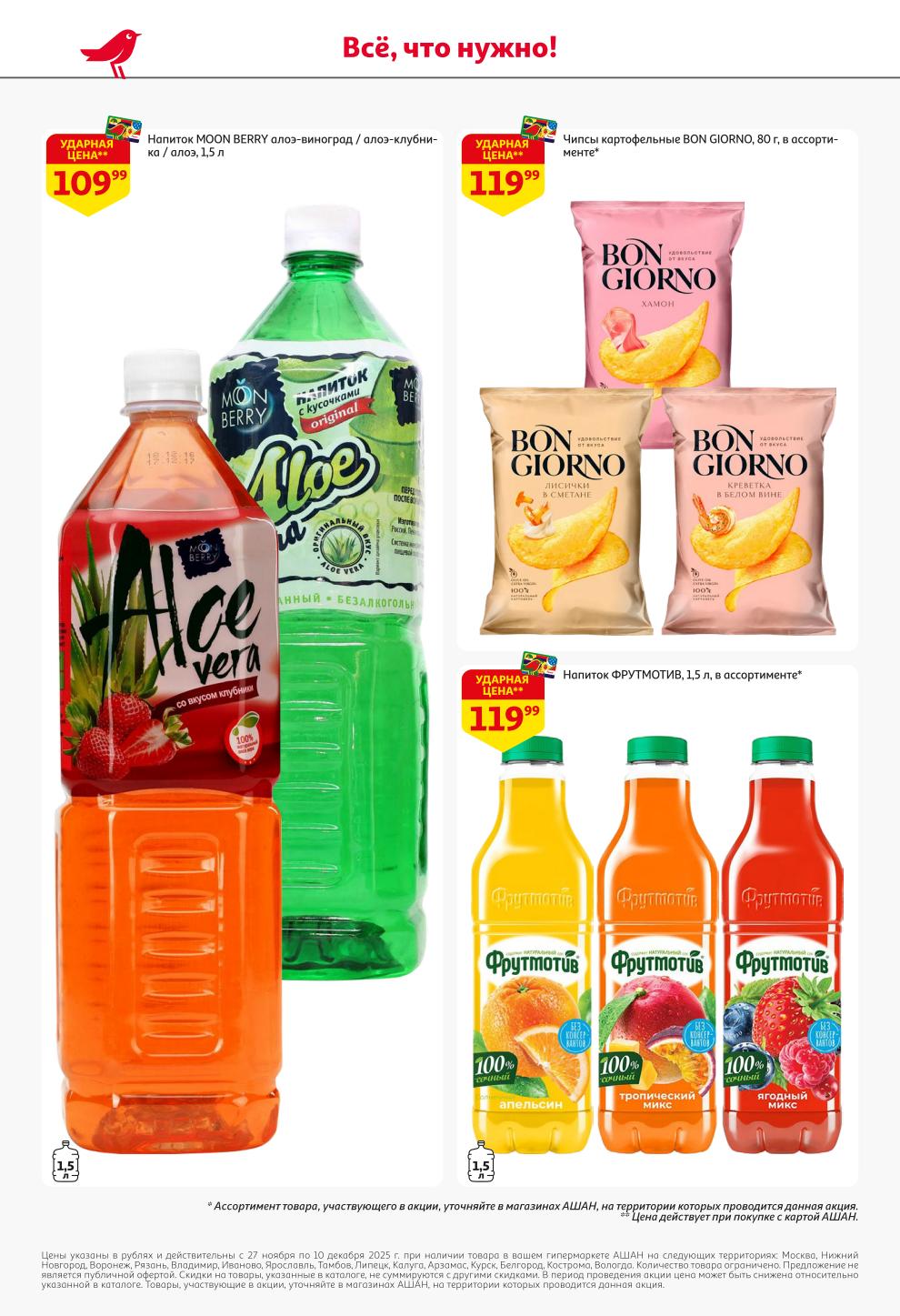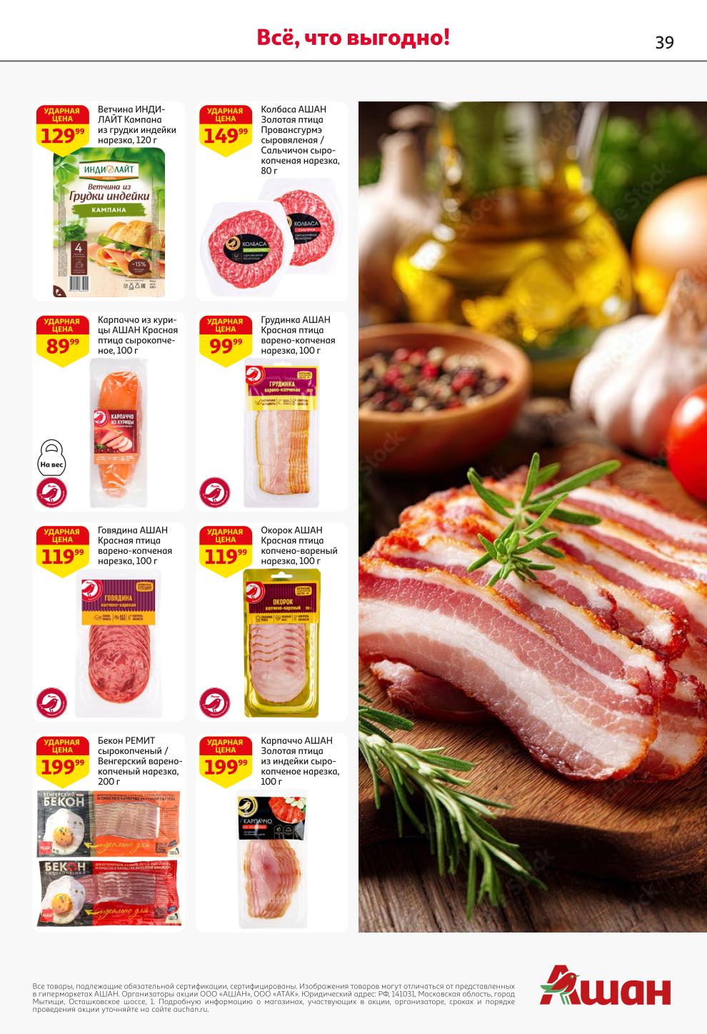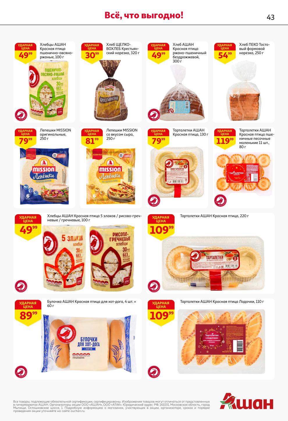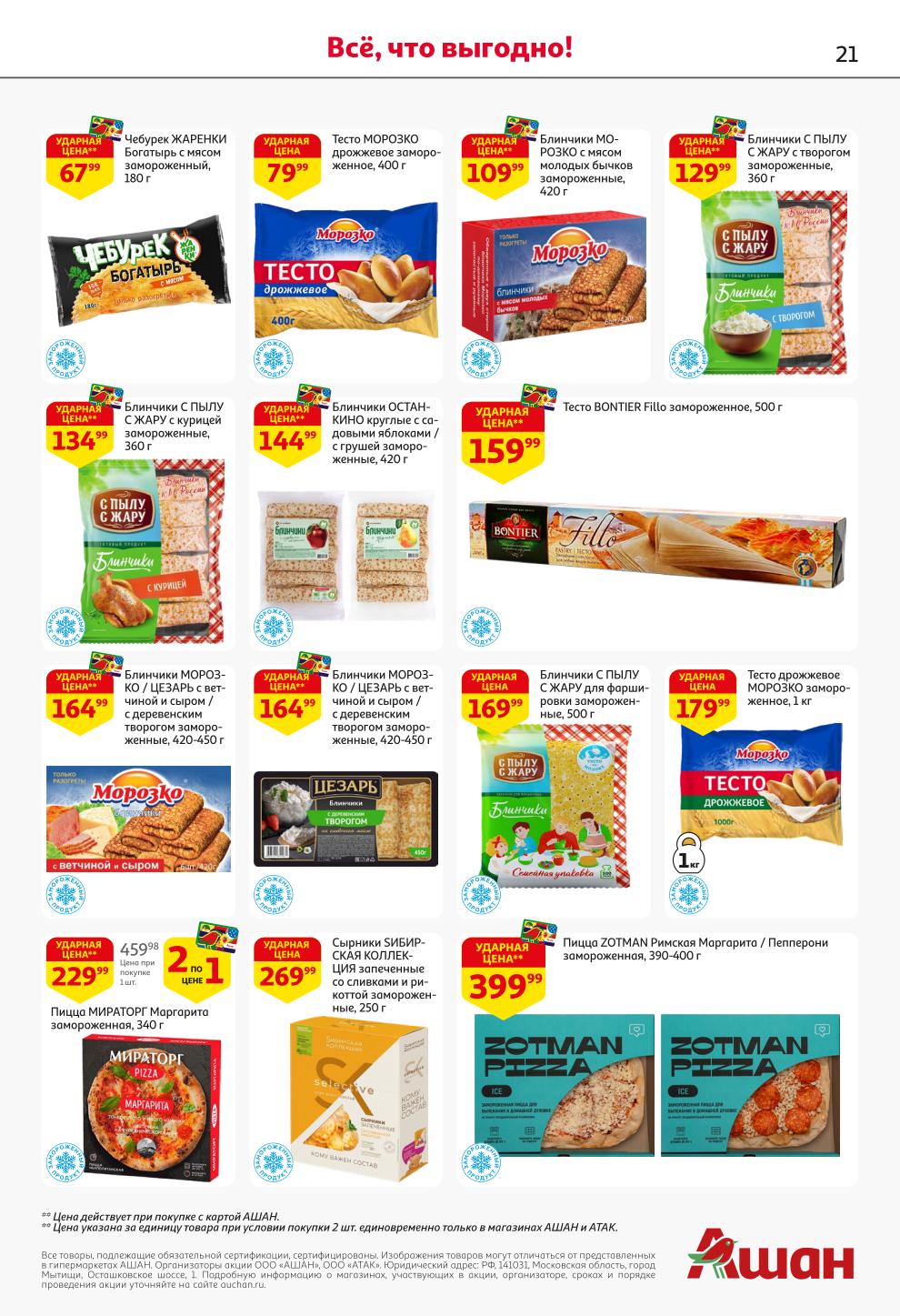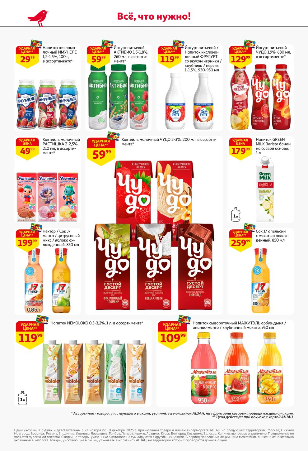 На страницах каталога Ашан вы найдете все свои любимые продукты, которые сейчас предлагаются в супермаркете. Не пропустите последние специальные предложения и сэкономьте на покупках. Предложение действительно при наличии товара на прилавках. Скидки на товары, указанные в каталоге, не суммируются с другими скидками. Изображения товаров могут незначительно отличаться от представленных на полках. Цены по акции Ашан действуют в городах: Москва. Балашиха. Химки. Подольск. Королев. Мытищи. Люберцы. Электросталь. Коломна. Одинцово. Железнодорожный, Серпухов, Орехово-Зуево. Красногорск, Щелково, Сергиев Посад, Пушкино. Жуковский, Ногинск, Раменское и многих других населенных пунктах Московского региона.