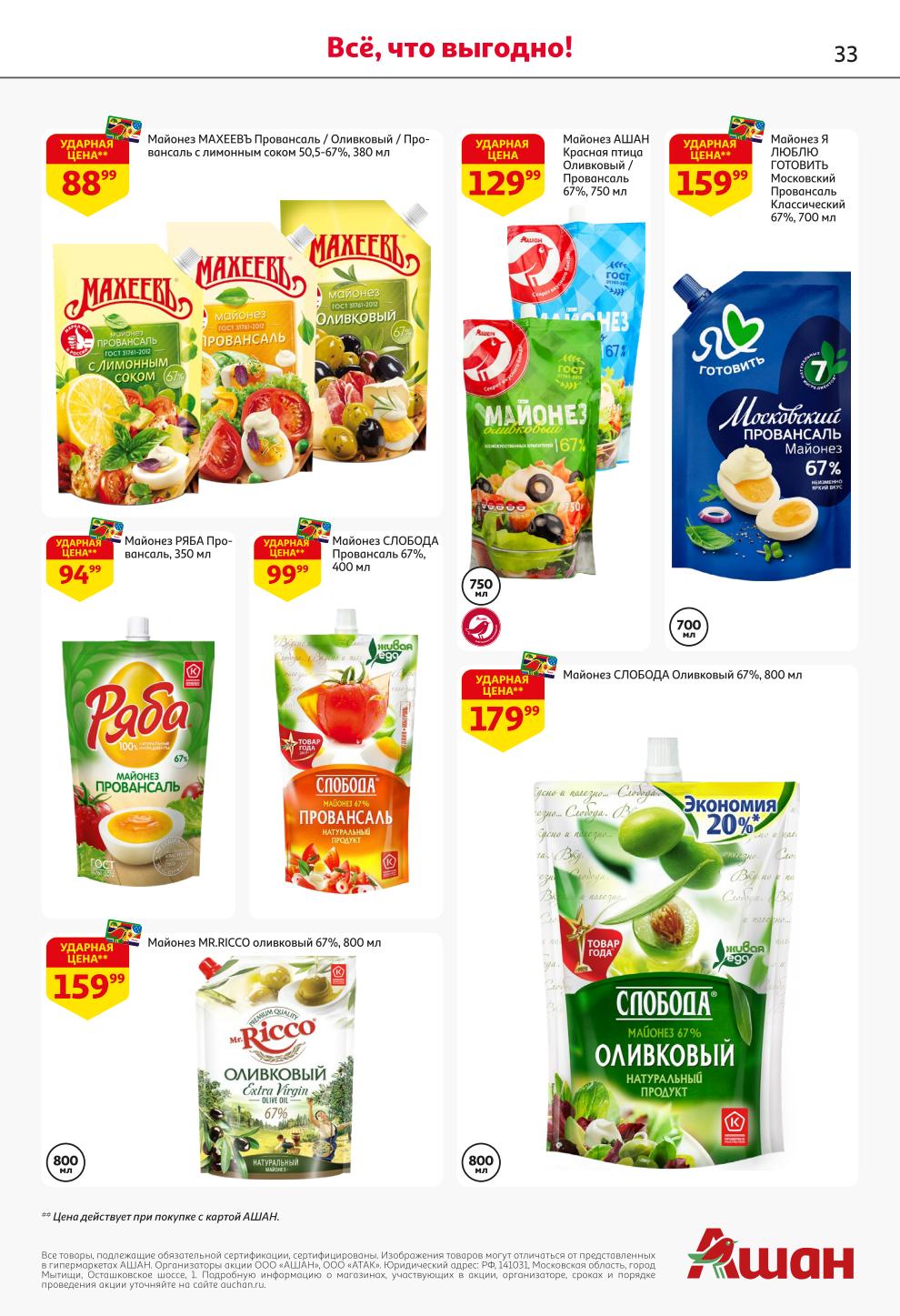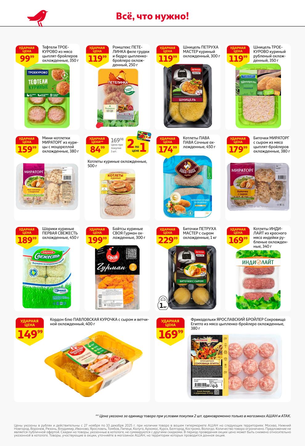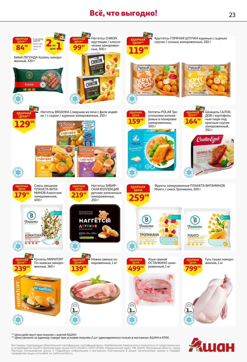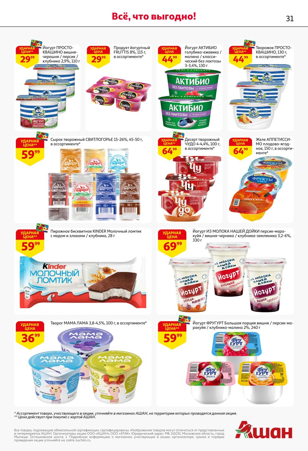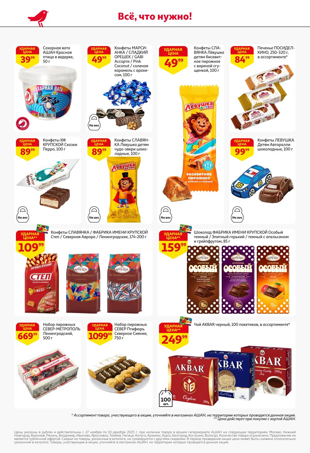 На страницах каталога Ашан вы найдете все свои любимые продукты, которые сейчас предлагаются в супермаркете. Не пропустите последние специальные предложения и сэкономьте на покупках. Предложение действительно при наличии товара на прилавках. Скидки на товары, указанные в каталоге, не суммируются с другими скидками. Изображения товаров могут незначительно отличаться от представленных на полках. Цены по акции Ашан действуют в городах: Москва. Балашиха. Химки. Подольск. Королев. Мытищи. Люберцы. Электросталь. Коломна. Одинцово. Железнодорожный, Серпухов, Орехово-Зуево. Красногорск, Щелково, Сергиев Посад, Пушкино. Жуковский, Ногинск, Раменское и многих других населенных пунктах Московского региона.