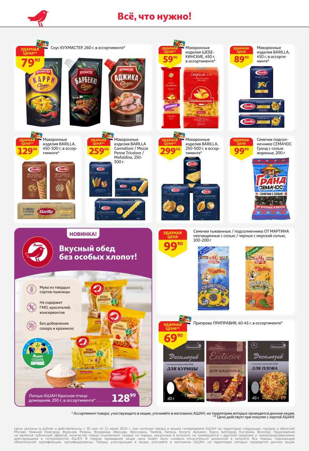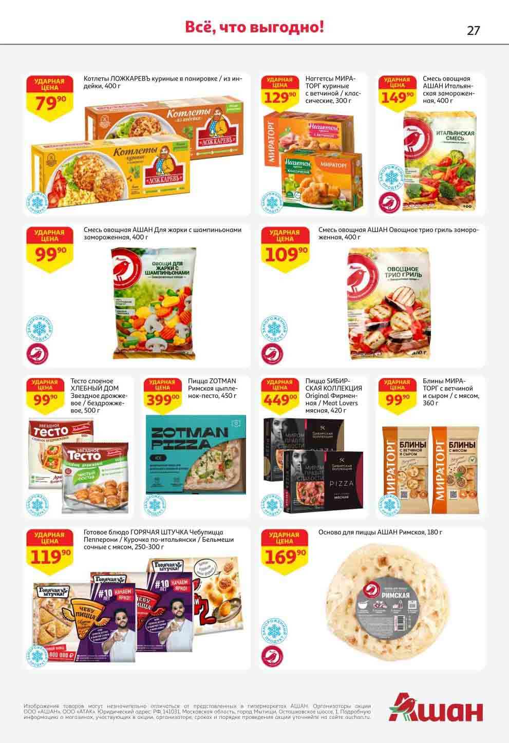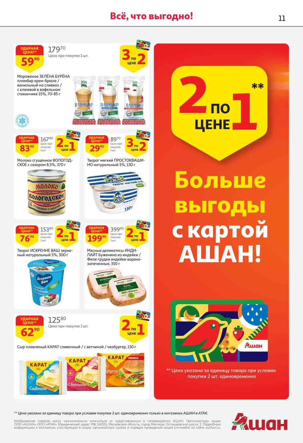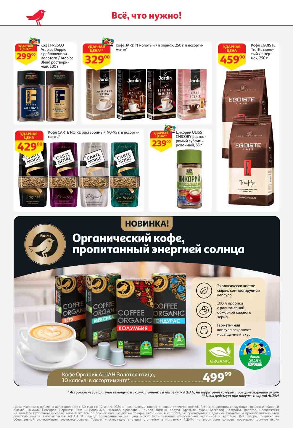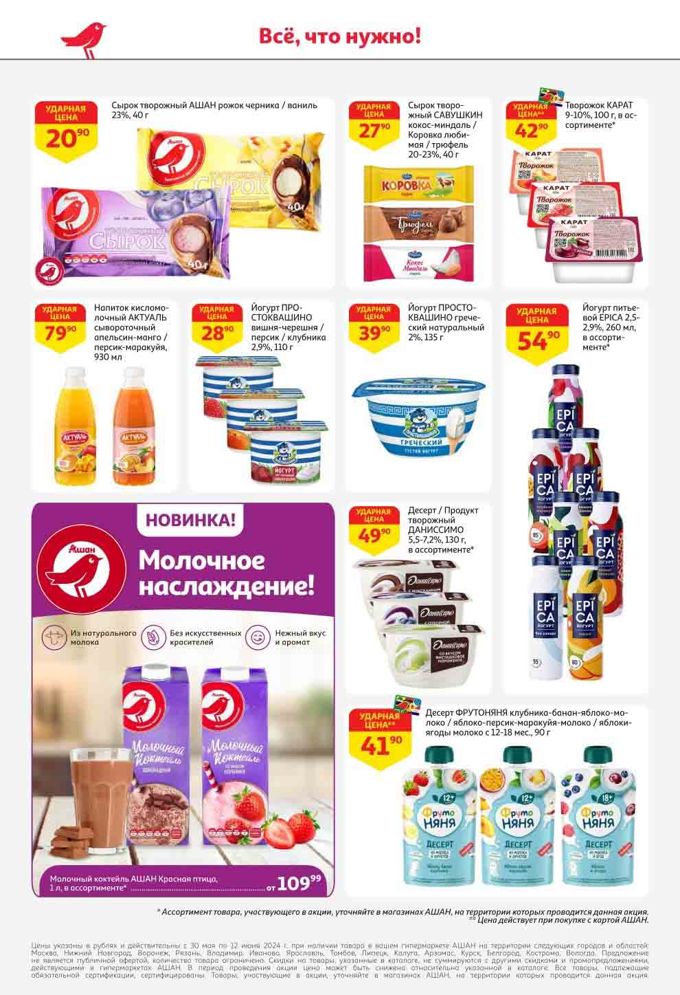 На страницах каталога Ашан вы найдете все свои любимые продукты, которые сейчас предлагаются в супермаркете. Не пропустите последние специальные предложения и сэкономьте на покупках. Предложение действительно при наличии товара на прилавках. Скидки на товары, указанные в каталоге, не суммируются с другими скидками. Изображения товаров могут незначительно отличаться от представленных на полках. Цены по акции Ашан действуют в городах: Москва. Балашиха. Химки. Подольск. Королев. Мытищи. Люберцы. Электросталь. Коломна. Одинцово. Железнодорожный, Серпухов, Орехово-Зуево. Красногорск, Щелково, Сергиев Посад, Пушкино. Жуковский, Ногинск, Раменское и многих других населенных пунктах Московского региона.