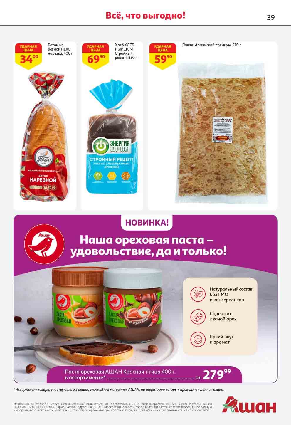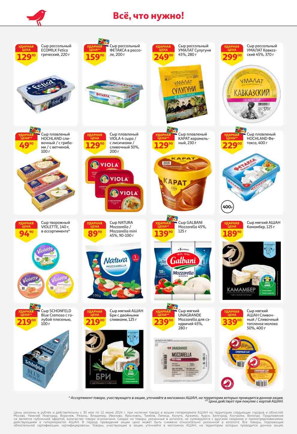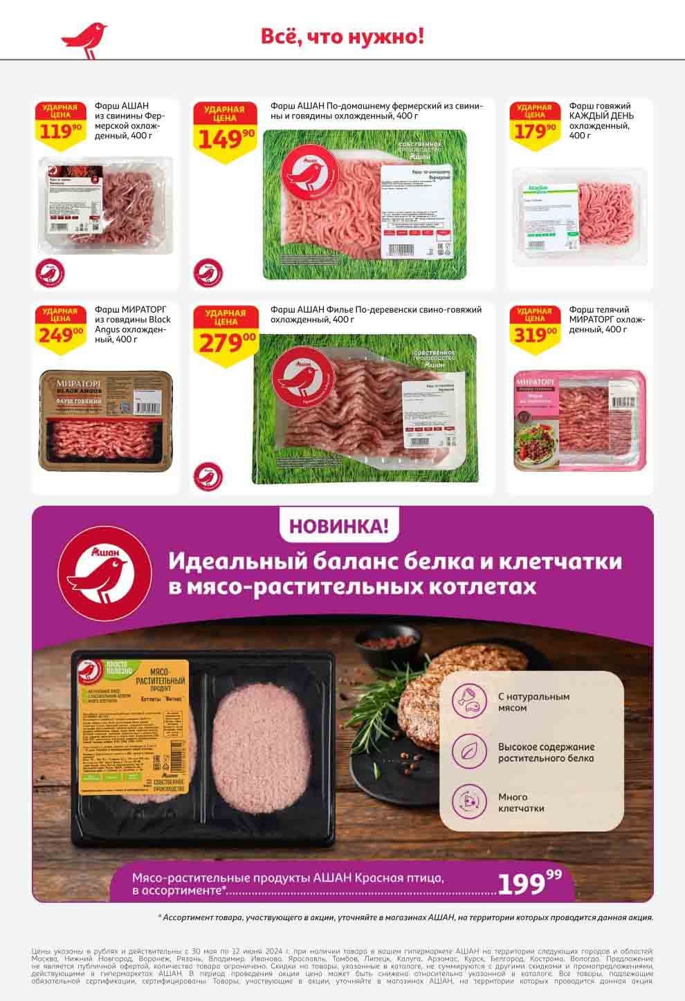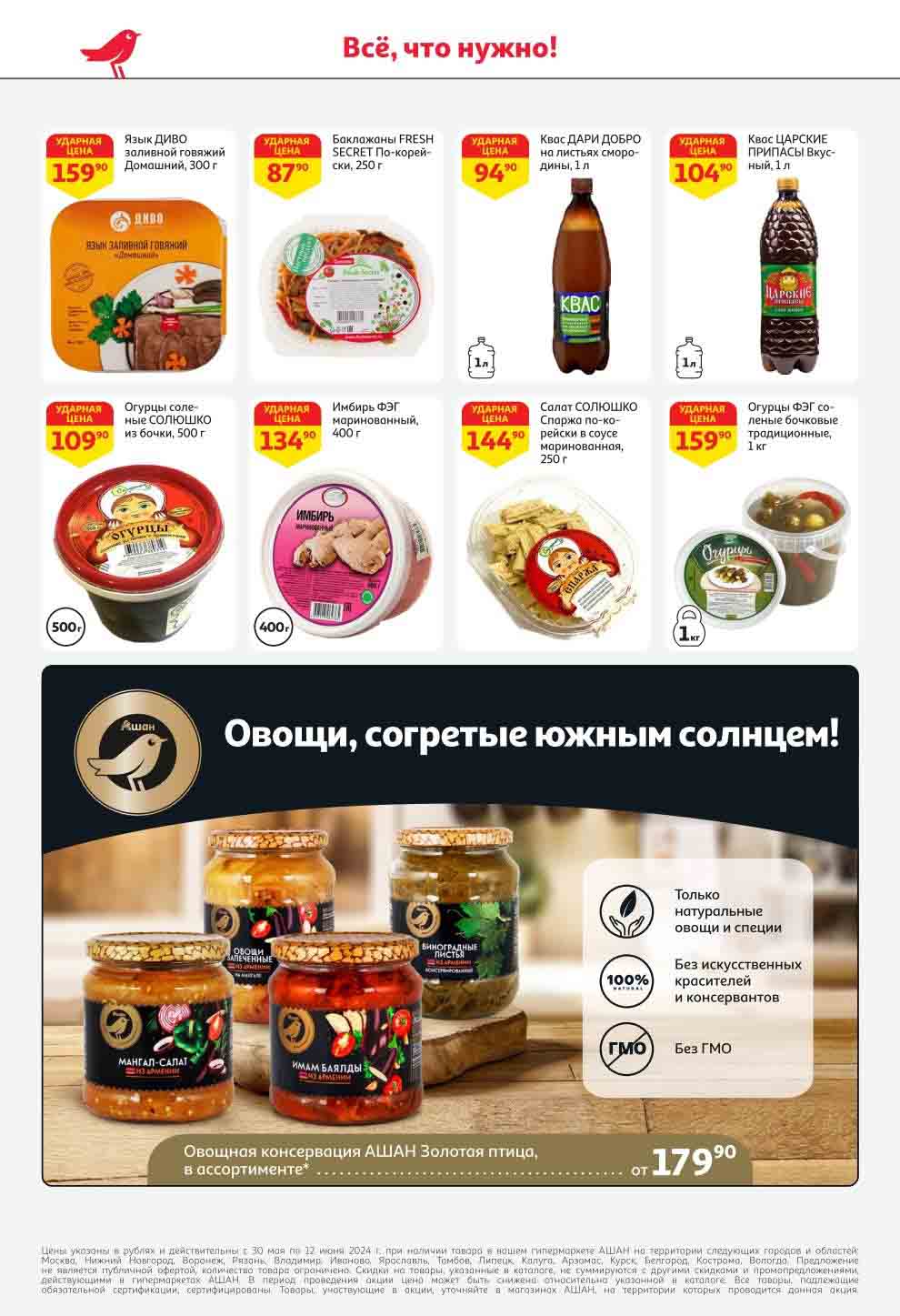На страницах каталога Ашан вы найдете все свои любимые продукты, которые сейчас предлагаются в супермаркете. Не пропустите последние специальные предложения и сэкономьте на покупках. Предложение действительно при наличии товара на прилавках. Скидки на товары, указанные в каталоге, не суммируются с другими скидками. Изображения товаров могут незначительно отличаться от представленных на полках. Цены по акции Ашан действуют в городах: Москва. Балашиха. Химки. Подольск. Королев. Мытищи. Люберцы. Электросталь. Коломна. Одинцово. Железнодорожный, Серпухов, Орехово-Зуево. Красногорск, Щелково, Сергиев Посад, Пушкино. Жуковский, Ногинск, Раменское и многих других населенных пунктах Московского региона.