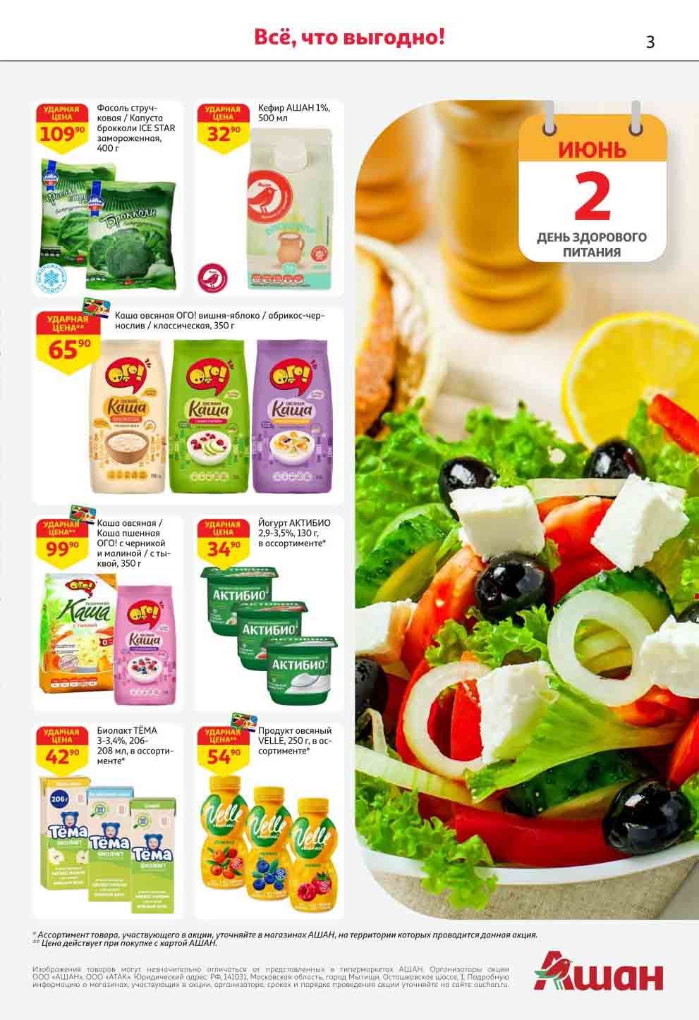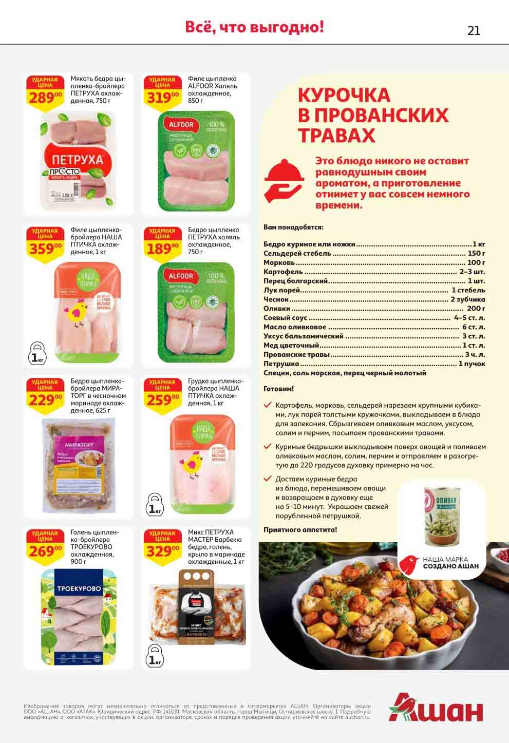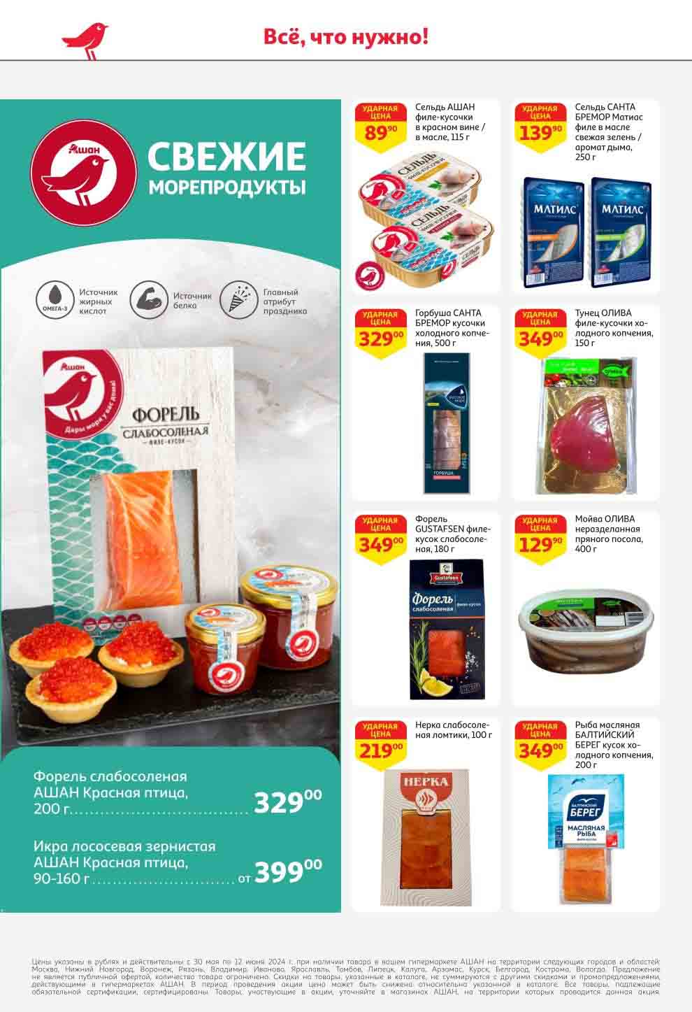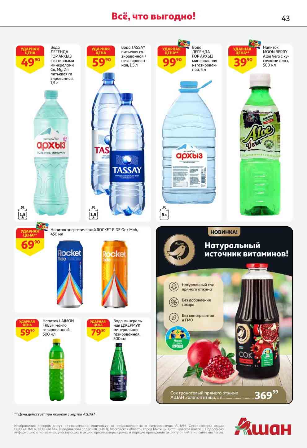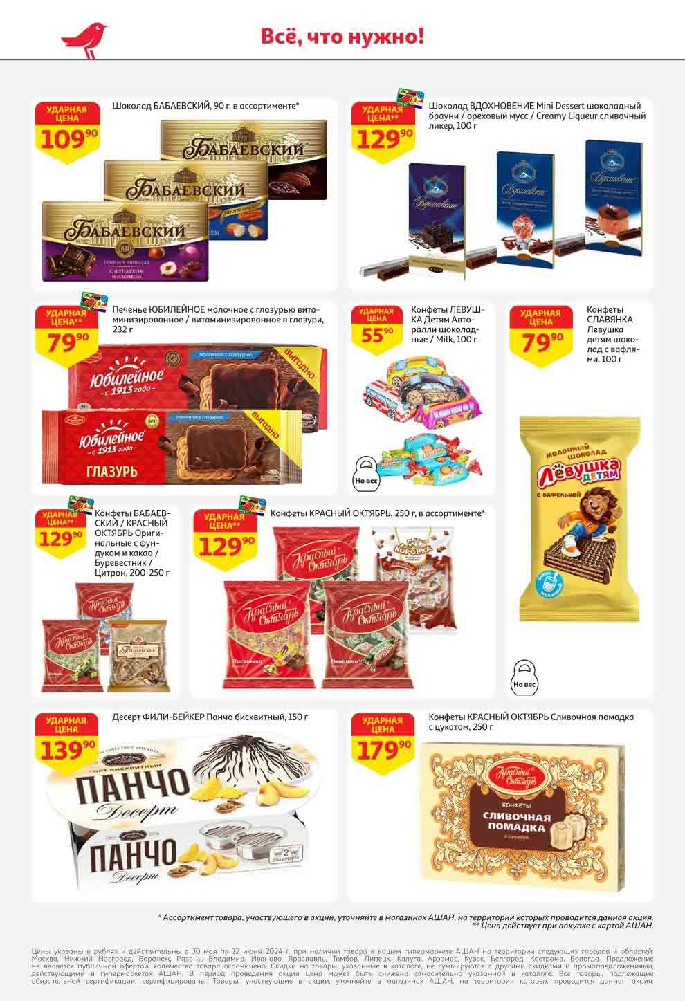 На страницах каталога Ашан вы найдете все свои любимые продукты, которые сейчас предлагаются в супермаркете. Не пропустите последние специальные предложения и сэкономьте на покупках. Предложение действительно при наличии товара на прилавках. Скидки на товары, указанные в каталоге, не суммируются с другими скидками. Изображения товаров могут незначительно отличаться от представленных на полках. Цены по акции Ашан действуют в городах: Москва. Балашиха. Химки. Подольск. Королев. Мытищи. Люберцы. Электросталь. Коломна. Одинцово. Железнодорожный, Серпухов, Орехово-Зуево. Красногорск, Щелково, Сергиев Посад, Пушкино. Жуковский, Ногинск, Раменское и многих других населенных пунктах Московского региона.
