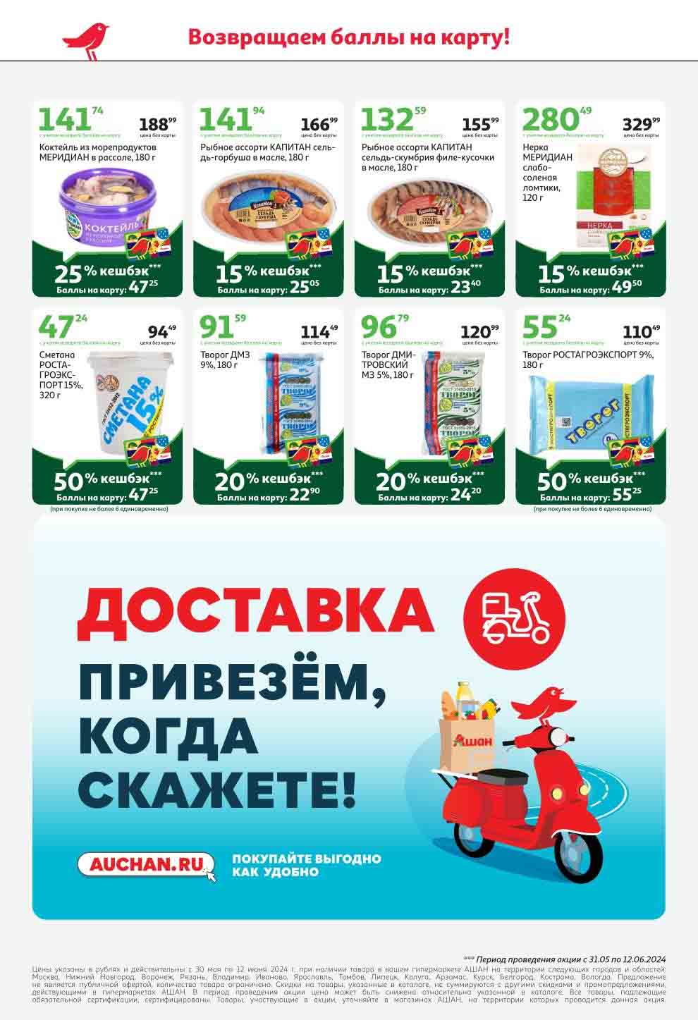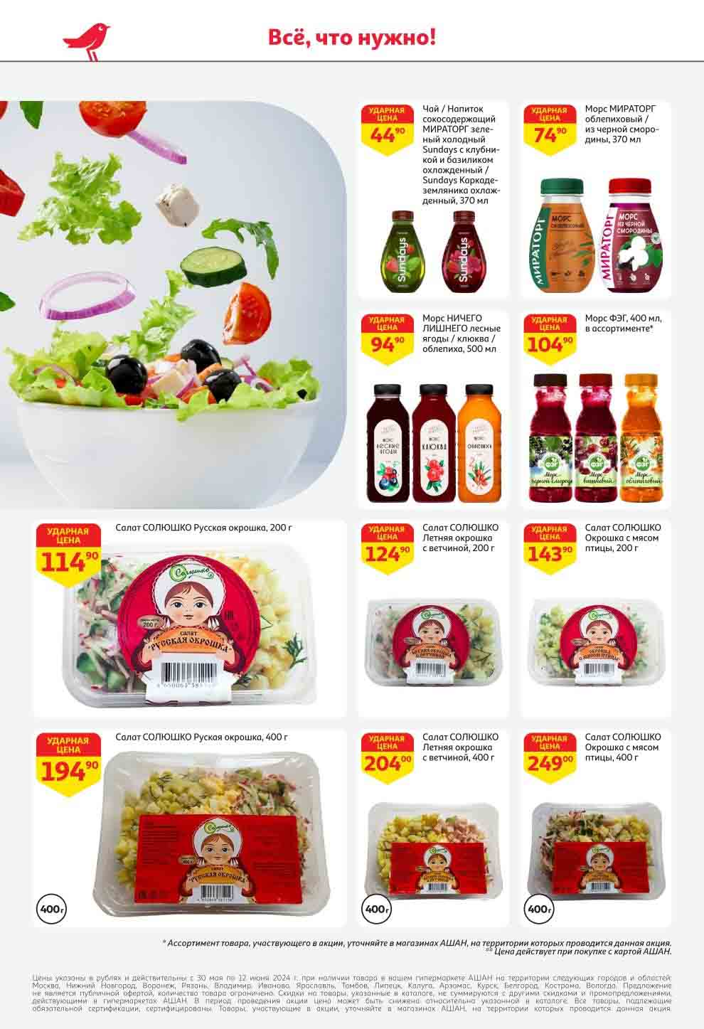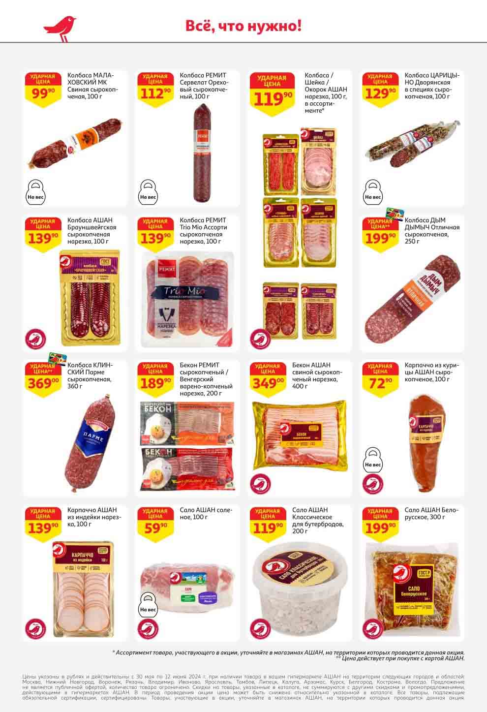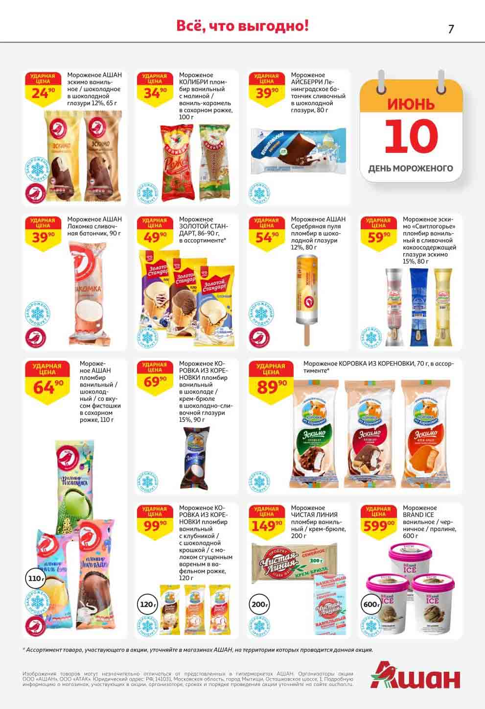 На страницах каталога Ашан вы найдете все свои любимые продукты, которые сейчас предлагаются в супермаркете. Не пропустите последние специальные предложения и сэкономьте на покупках. Предложение действительно при наличии товара на прилавках. Скидки на товары, указанные в каталоге, не суммируются с другими скидками. Изображения товаров могут незначительно отличаться от представленных на полках. Цены по акции Ашан действуют в городах: Москва. Балашиха. Химки. Подольск. Королев. Мытищи. Люберцы. Электросталь. Коломна. Одинцово. Железнодорожный, Серпухов, Орехово-Зуево. Красногорск, Щелково, Сергиев Посад, Пушкино. Жуковский, Ногинск, Раменское и многих других населенных пунктах Московского региона.