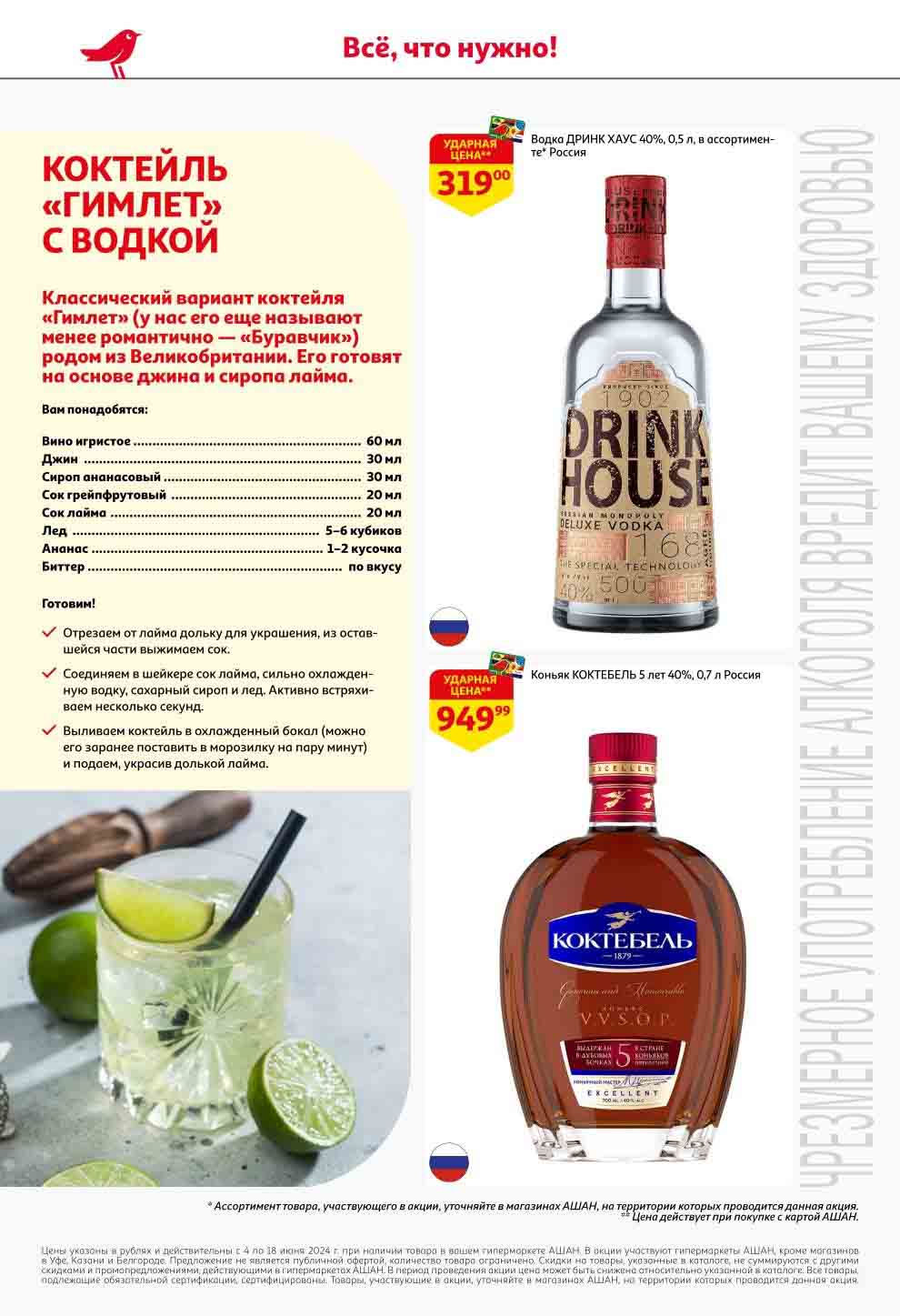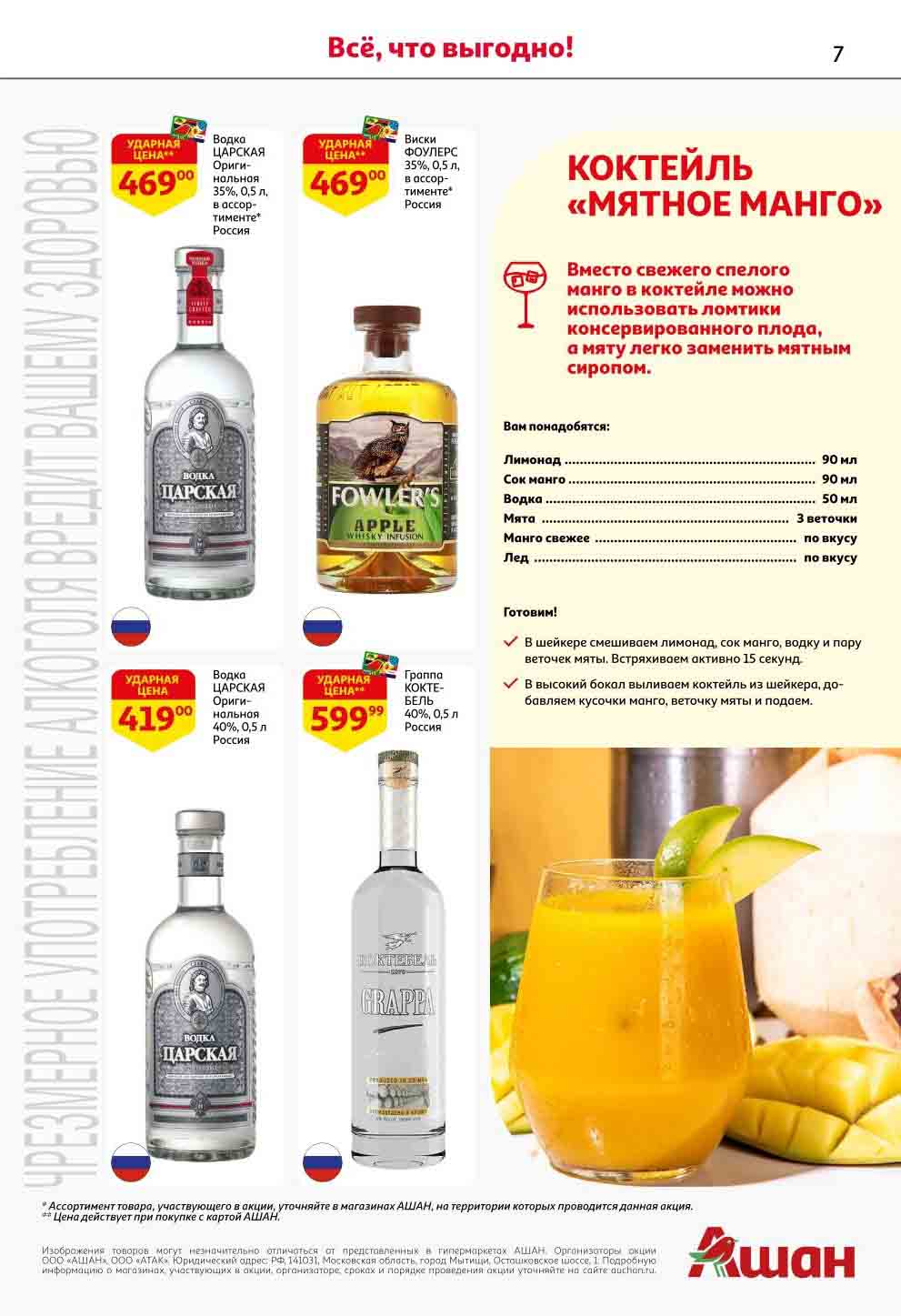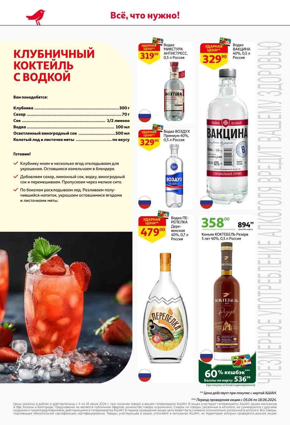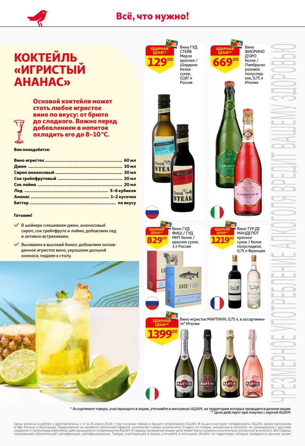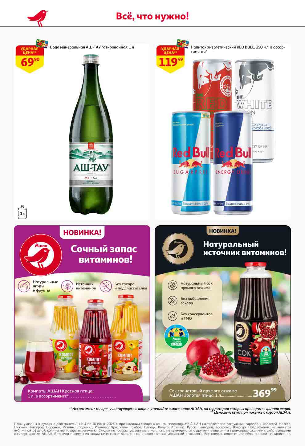 На страницах каталога Ашан вы найдете все свои любимые продукты, которые сейчас предлагаются в супермаркете. Не пропустите последние специальные предложения и сэкономьте на покупках. Предложение действительно при наличии товара на прилавках. Скидки на товары, указанные в каталоге, не суммируются с другими скидками. Изображения товаров могут незначительно отличаться от представленных на полках. Цены по акции Ашан действуют в городах: Москва. Балашиха. Химки. Подольск. Королев. Мытищи. Люберцы. Электросталь. Коломна. Одинцово. Железнодорожный, Серпухов, Орехово-Зуево. Красногорск, Щелково, Сергиев Посад, Пушкино. Жуковский, Ногинск, Раменское и многих других населенных пунктах Московского региона.
