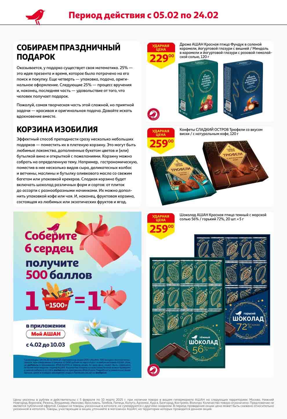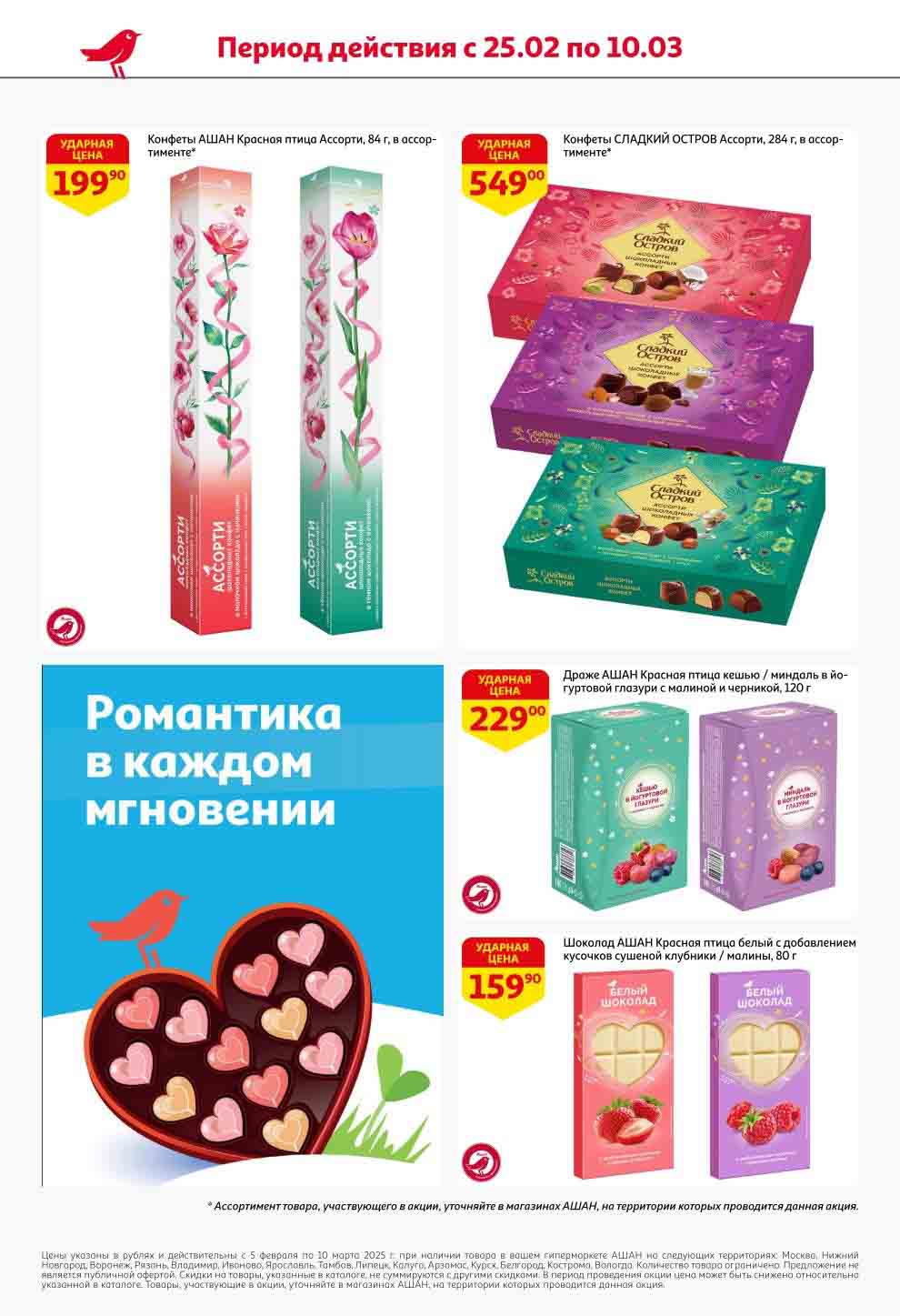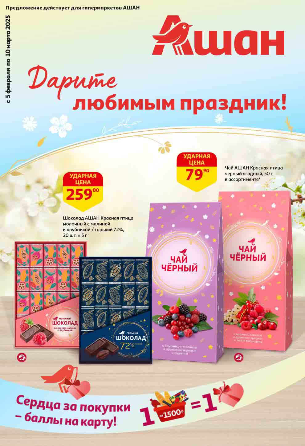 На страницах каталога Ашан вы найдете все свои любимые продукты, которые сейчас предлагаются в супермаркете. Не пропустите последние специальные предложения и сэкономьте на покупках. Предложение действительно при наличии товара на прилавках. Скидки на товары, указанные в каталоге, не суммируются с другими скидками. Изображения товаров могут незначительно отличаться от представленных на полках. Цены по акции Ашан действуют в городах: Москва. Балашиха. Химки. Подольск. Королев. Мытищи. Люберцы. Электросталь. Коломна. Одинцово. Железнодорожный, Серпухов, Орехово-Зуево. Красногорск, Щелково, Сергиев Посад, Пушкино. Жуковский, Ногинск, Раменское и многих других населенных пунктах Московского региона.