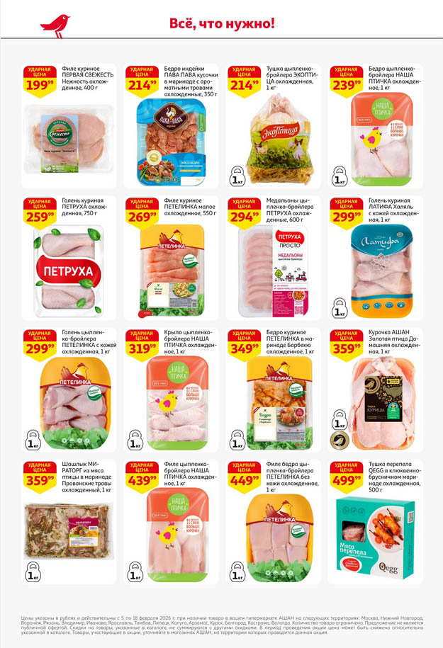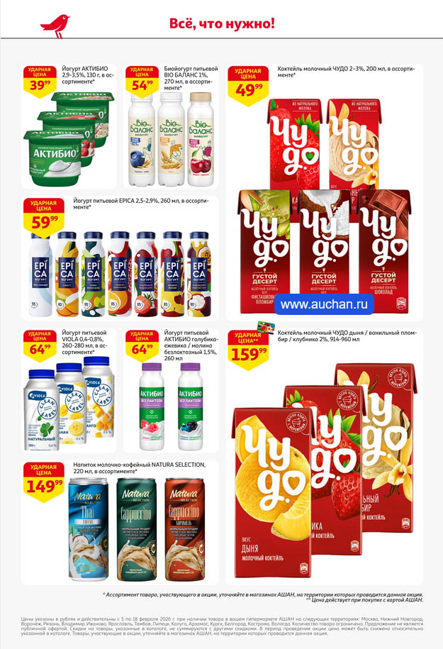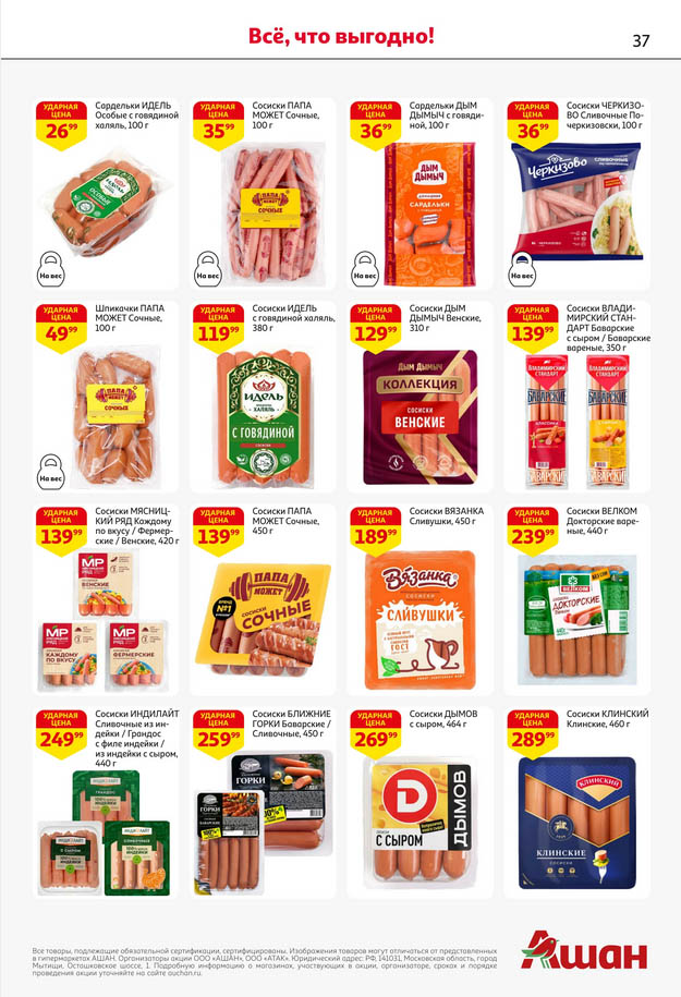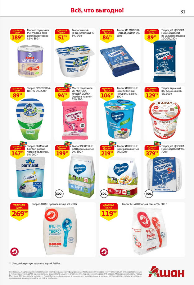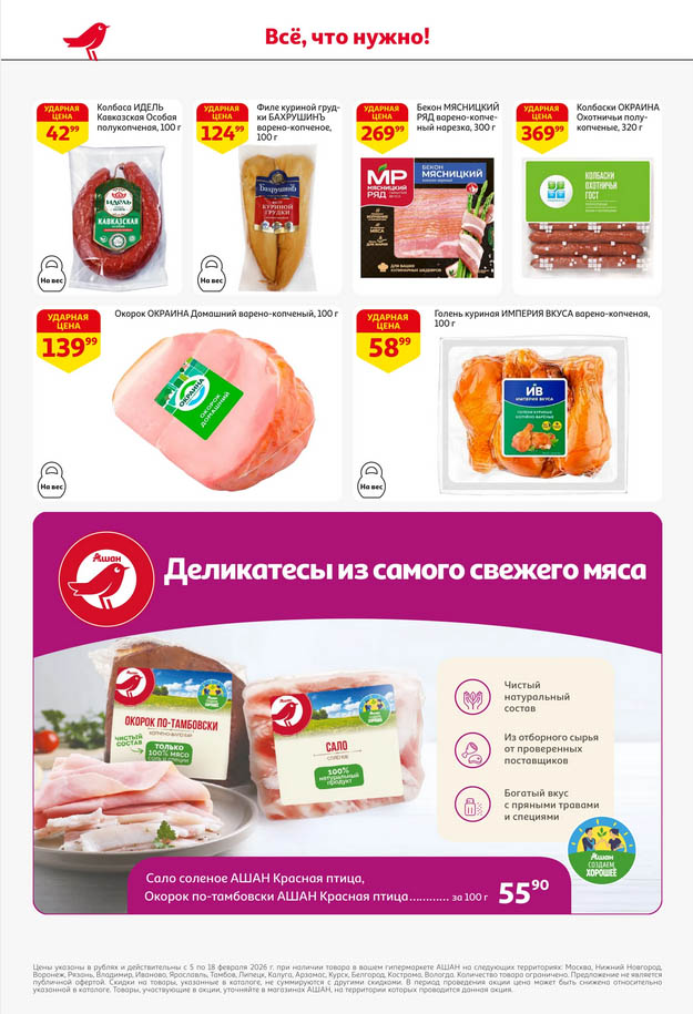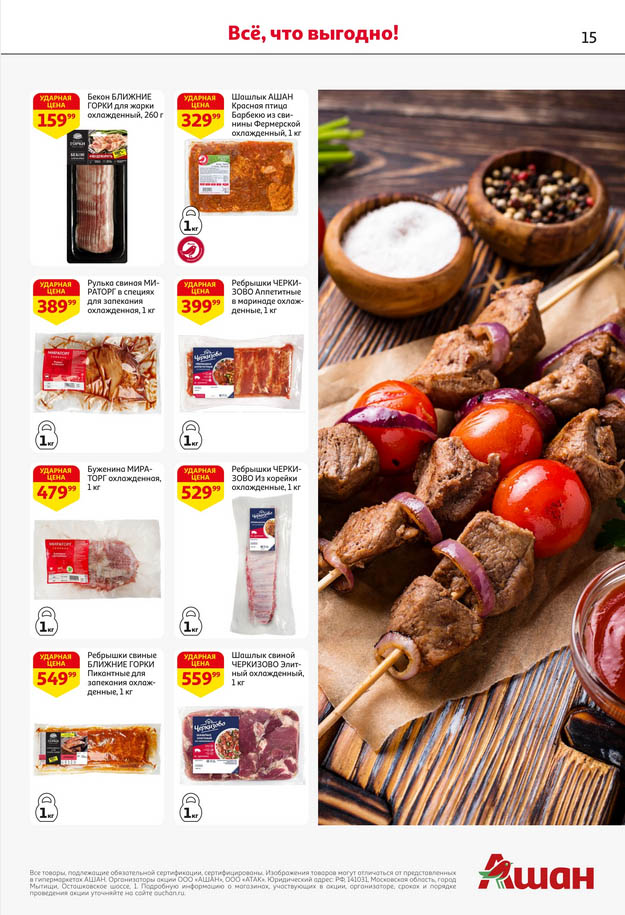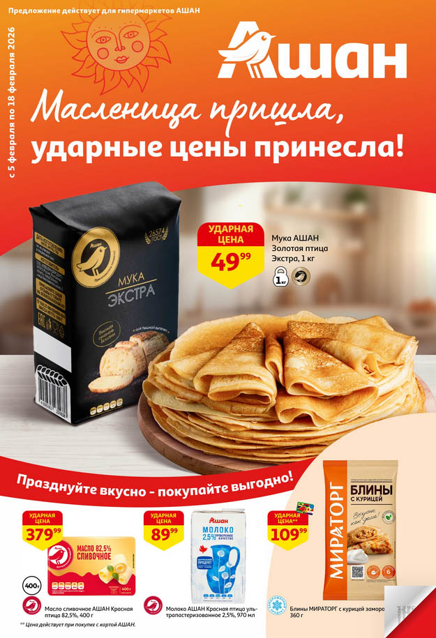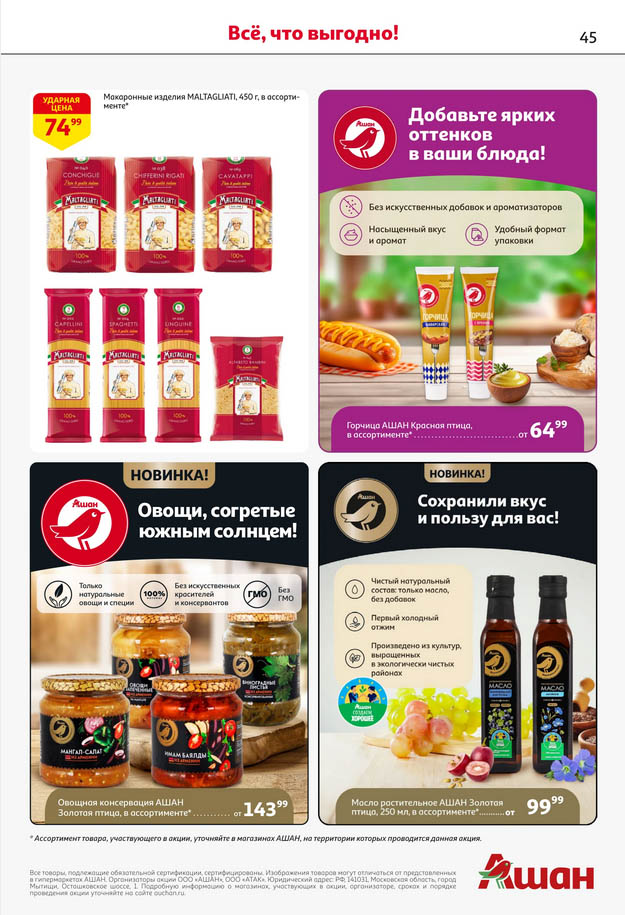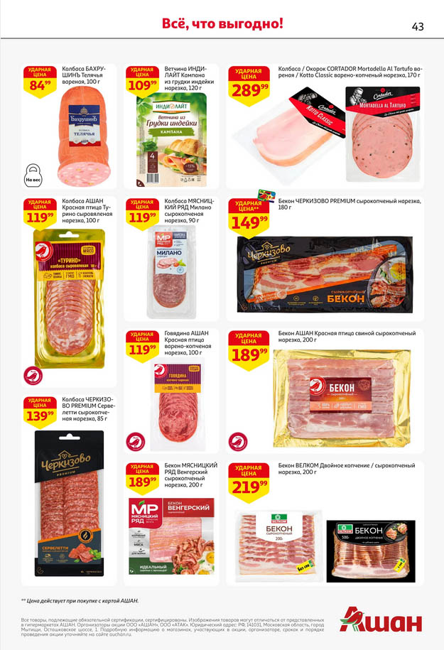 На страницах каталога Ашан вы найдете все свои любимые продукты, которые сейчас предлагаются в супермаркете. Не пропустите последние специальные предложения и сэкономьте на покупках. Предложение действительно при наличии товара на прилавках. Скидки на товары, указанные в каталоге, не суммируются с другими скидками. Изображения товаров могут незначительно отличаться от представленных на полках. Цены по акции Ашан действуют в городах: Москва. Балашиха. Химки. Подольск. Королев. Мытищи. Люберцы. Электросталь. Коломна. Одинцово. Железнодорожный, Серпухов, Орехово-Зуево. Красногорск, Щелково, Сергиев Посад, Пушкино. Жуковский, Ногинск, Раменское и многих других населенных пунктах Московского региона.