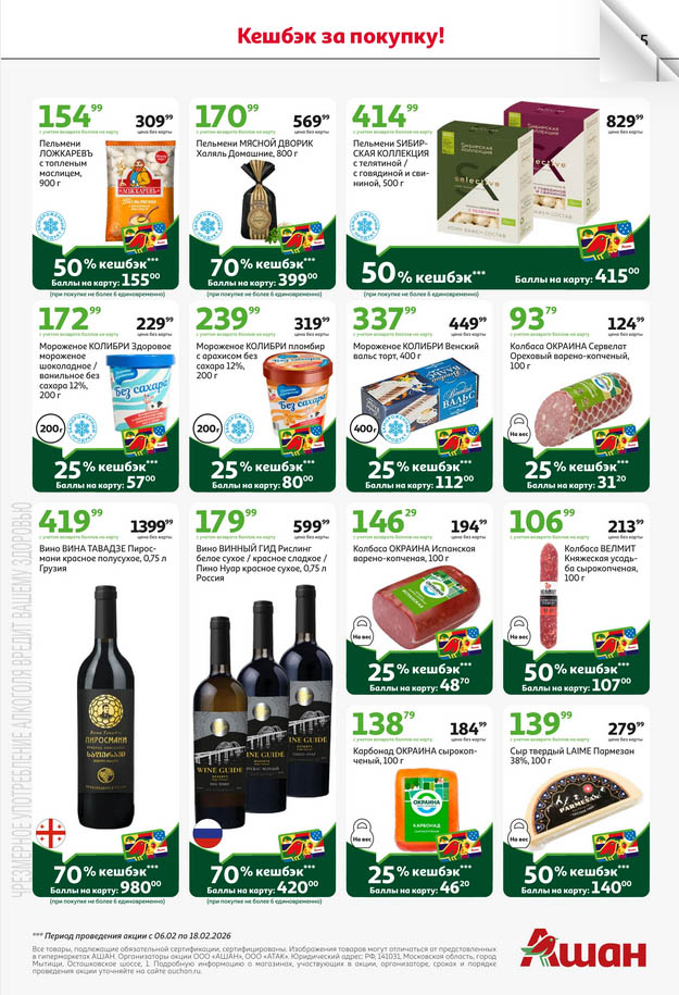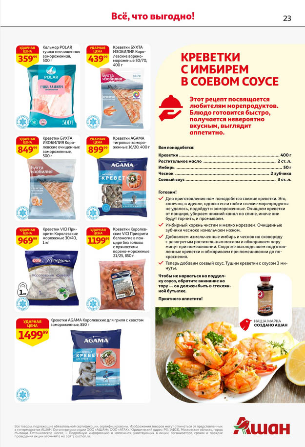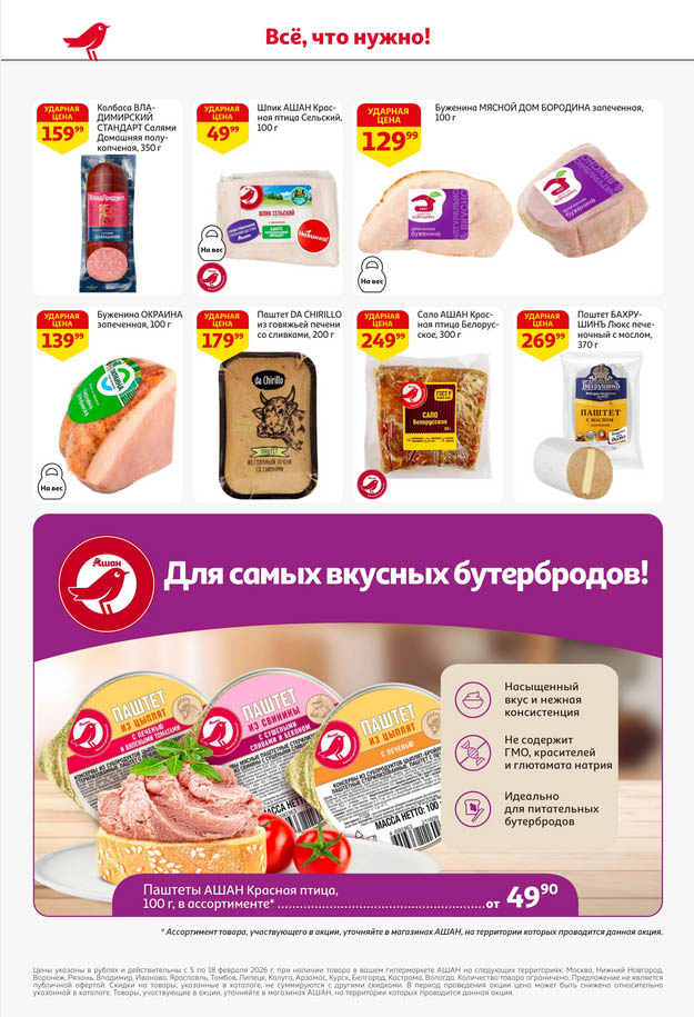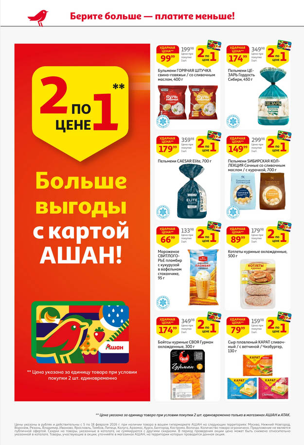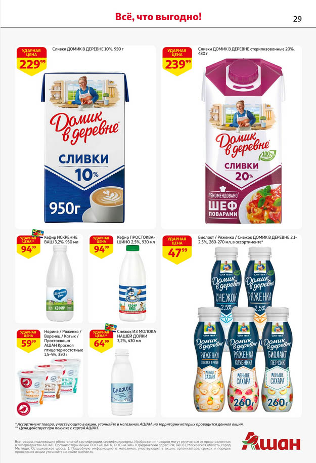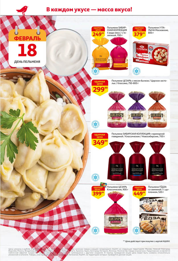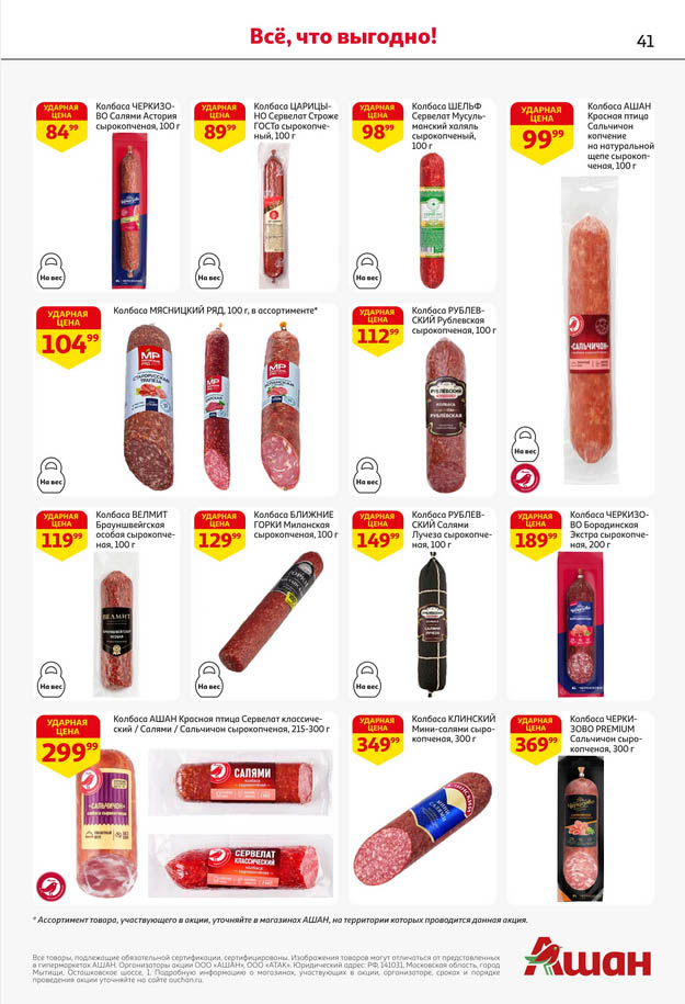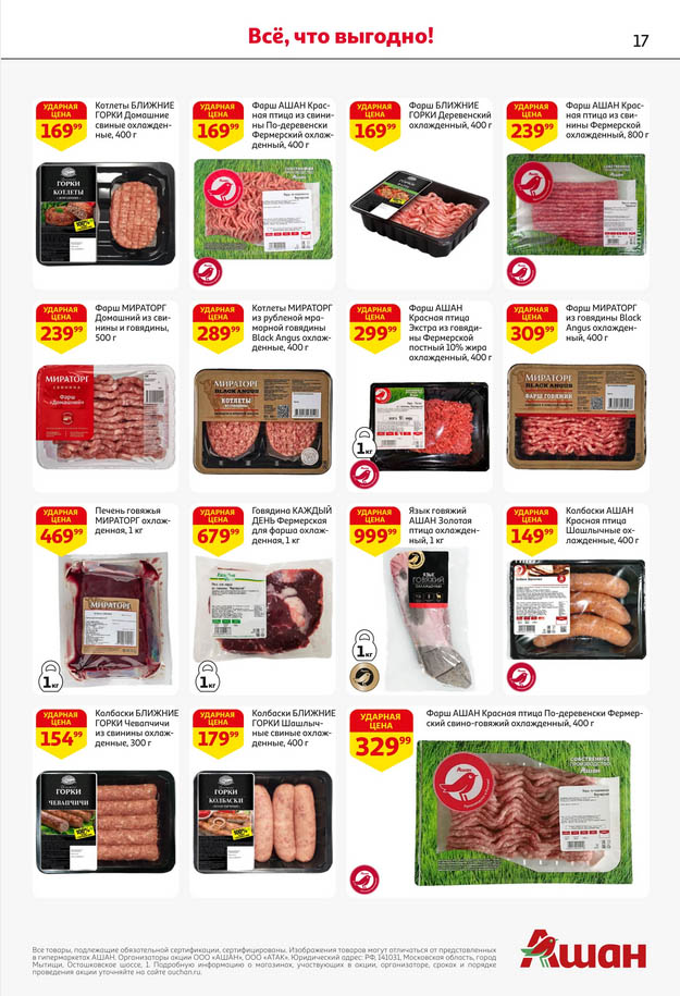 На страницах каталога Ашан вы найдете все свои любимые продукты, которые сейчас предлагаются в супермаркете. Не пропустите последние специальные предложения и сэкономьте на покупках. Предложение действительно при наличии товара на прилавках. Скидки на товары, указанные в каталоге, не суммируются с другими скидками. Изображения товаров могут незначительно отличаться от представленных на полках. Цены по акции Ашан действуют в городах: Москва. Балашиха. Химки. Подольск. Королев. Мытищи. Люберцы. Электросталь. Коломна. Одинцово. Железнодорожный, Серпухов, Орехово-Зуево. Красногорск, Щелково, Сергиев Посад, Пушкино. Жуковский, Ногинск, Раменское и многих других населенных пунктах Московского региона.