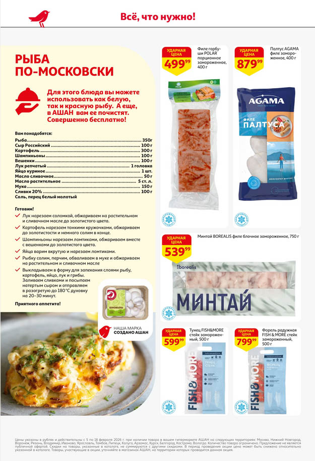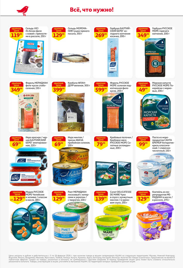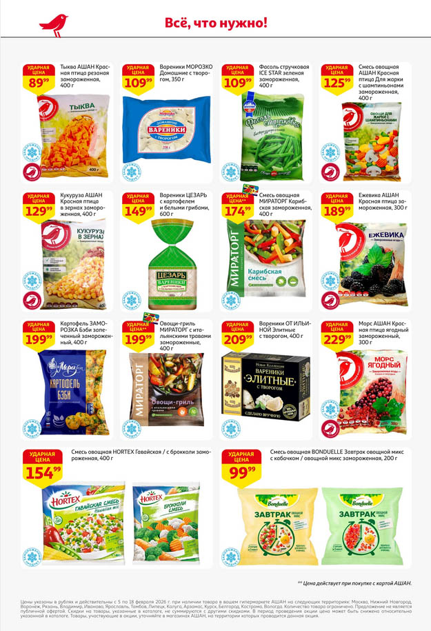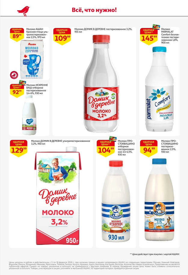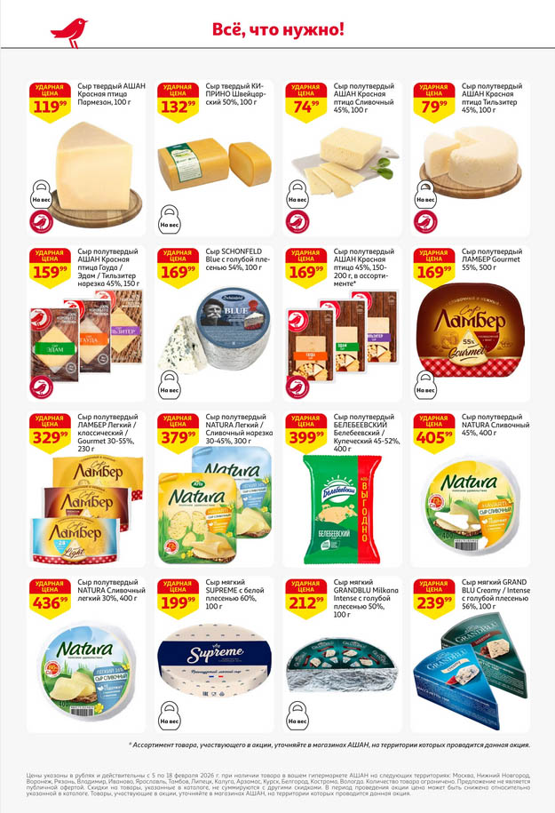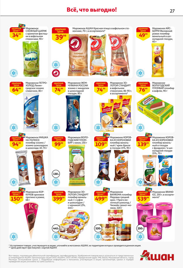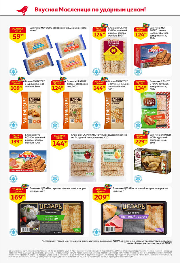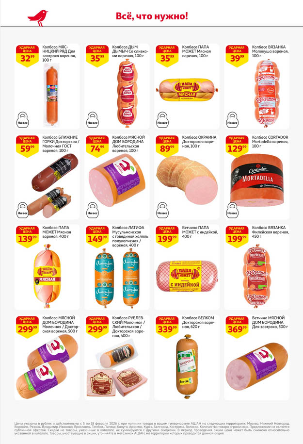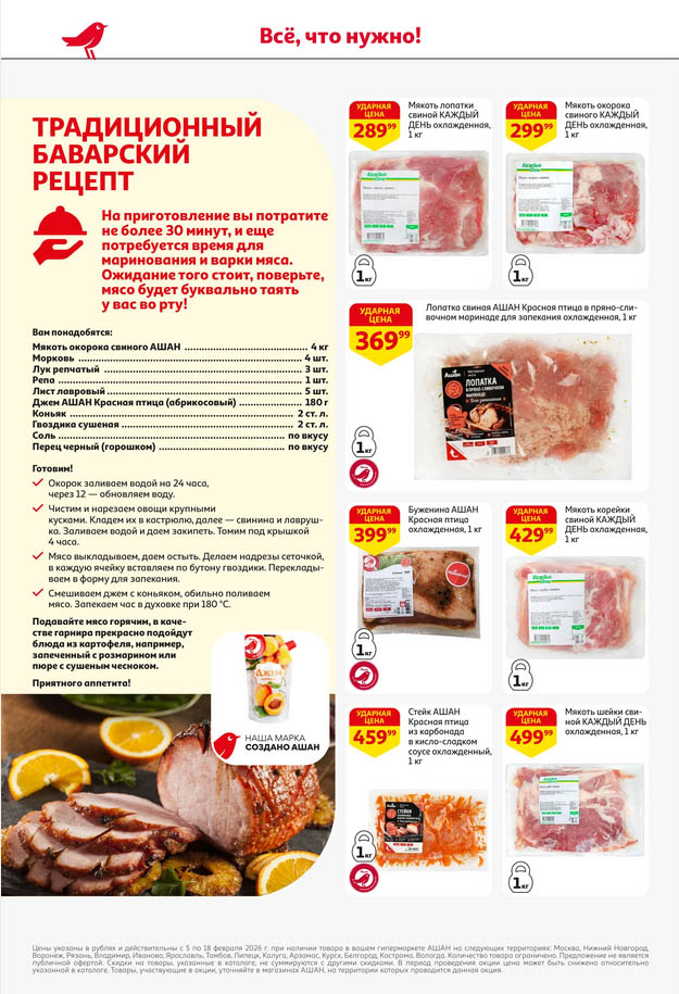 На страницах каталога Ашан вы найдете все свои любимые продукты, которые сейчас предлагаются в супермаркете. Не пропустите последние специальные предложения и сэкономьте на покупках. Предложение действительно при наличии товара на прилавках. Скидки на товары, указанные в каталоге, не суммируются с другими скидками. Изображения товаров могут незначительно отличаться от представленных на полках. Цены по акции Ашан действуют в городах: Москва. Балашиха. Химки. Подольск. Королев. Мытищи. Люберцы. Электросталь. Коломна. Одинцово. Железнодорожный, Серпухов, Орехово-Зуево. Красногорск, Щелково, Сергиев Посад, Пушкино. Жуковский, Ногинск, Раменское и многих других населенных пунктах Московского региона.