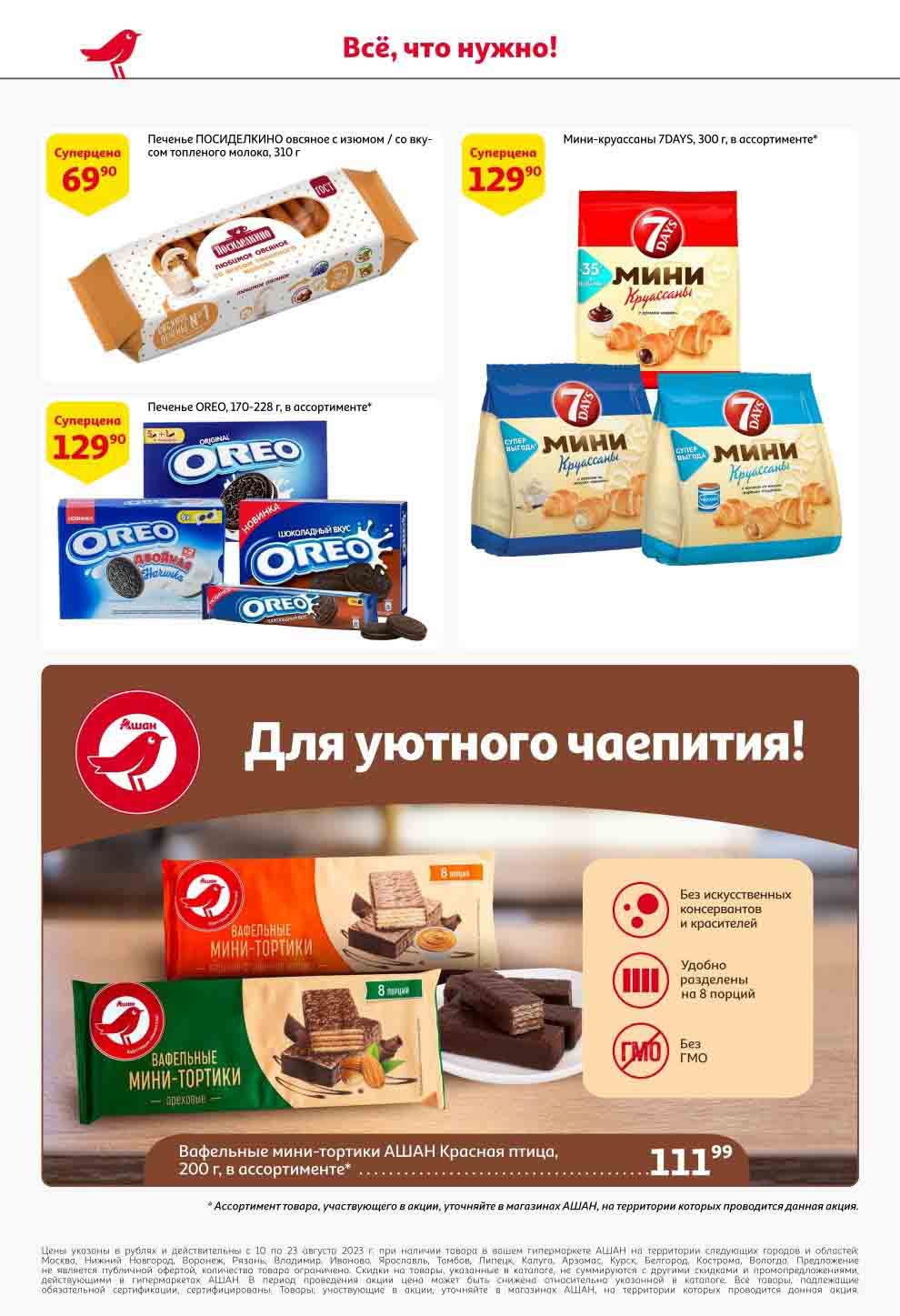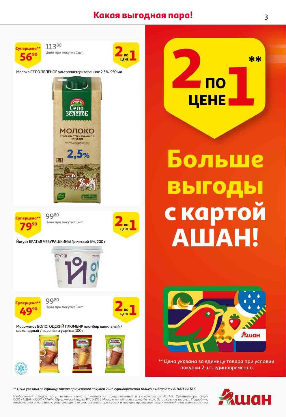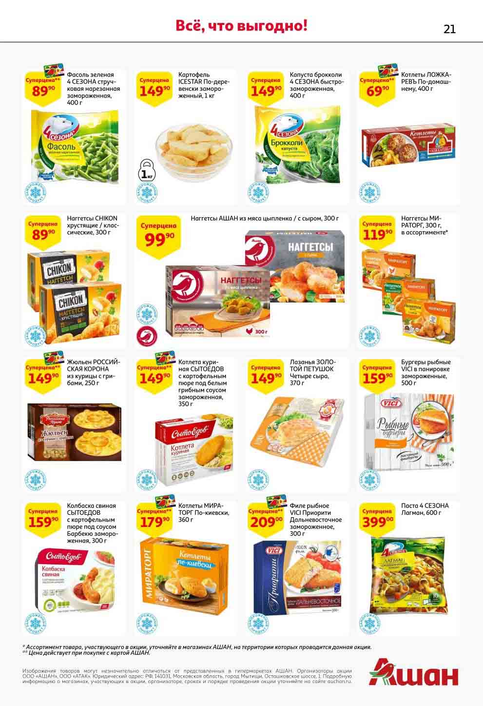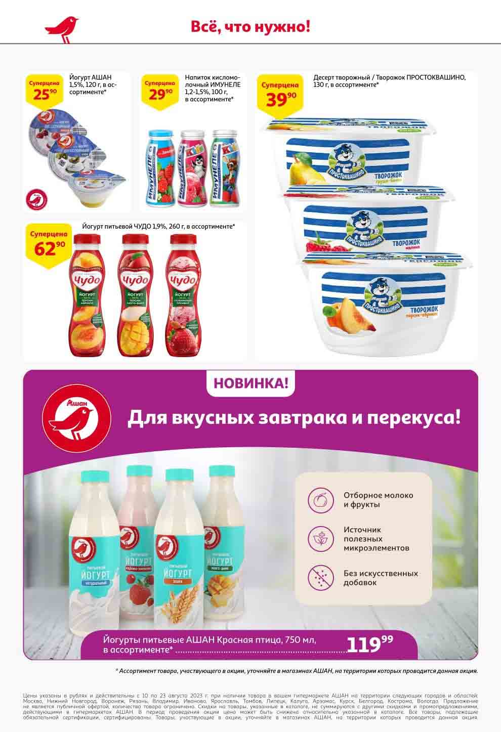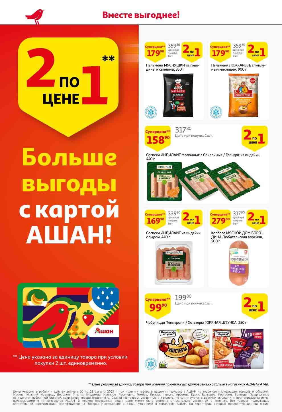 На страницах каталога Ашан вы найдете все свои любимые продукты, которые сейчас предлагаются в супермаркете. Не пропустите последние специальные предложения и сэкономьте на покупках. Предложение действительно при наличии товара на прилавках. Скидки на товары, указанные в каталоге, не суммируются с другими скидками. Изображения товаров могут незначительно отличаться от представленных на полках. Цены по акции Ашан действуют в городах: Москва. Балашиха. Химки. Подольск. Королев. Мытищи. Люберцы. Электросталь. Коломна. Одинцово. Железнодорожный, Серпухов, Орехово-Зуево. Красногорск, Щелково, Сергиев Посад, Пушкино. Жуковский, Ногинск, Раменское и многих других населенных пунктах Московского региона.