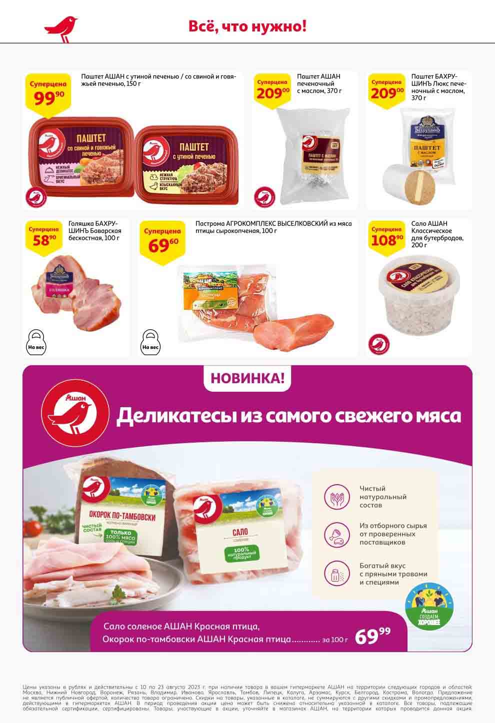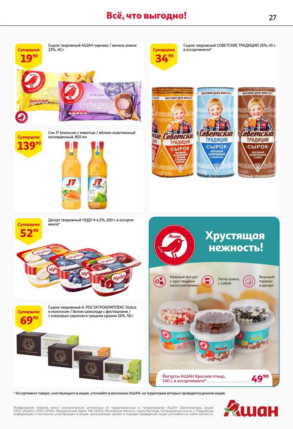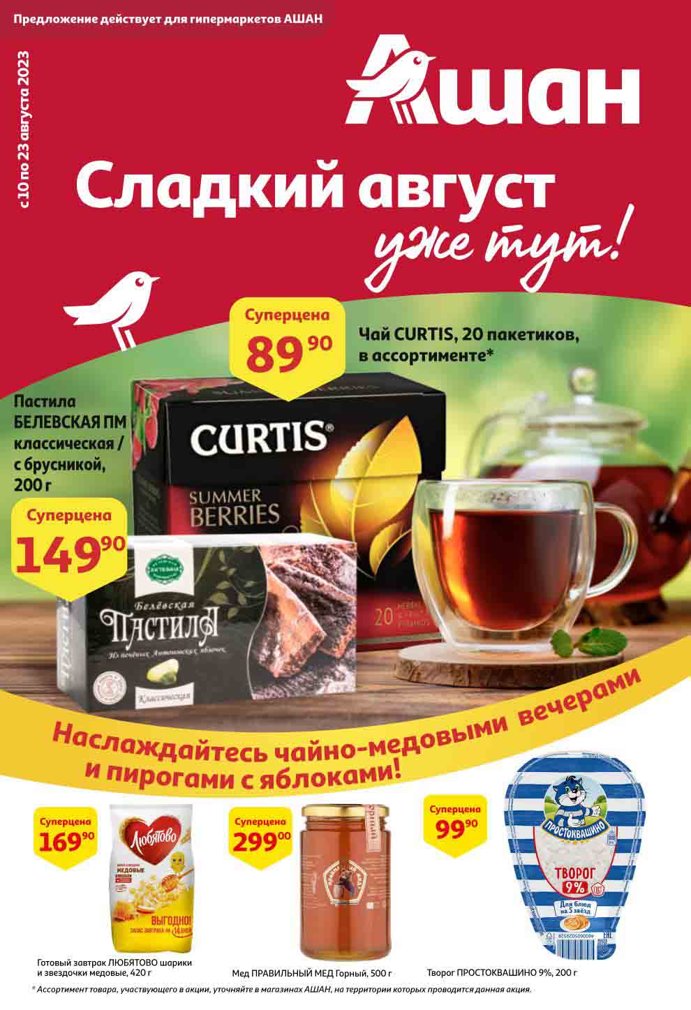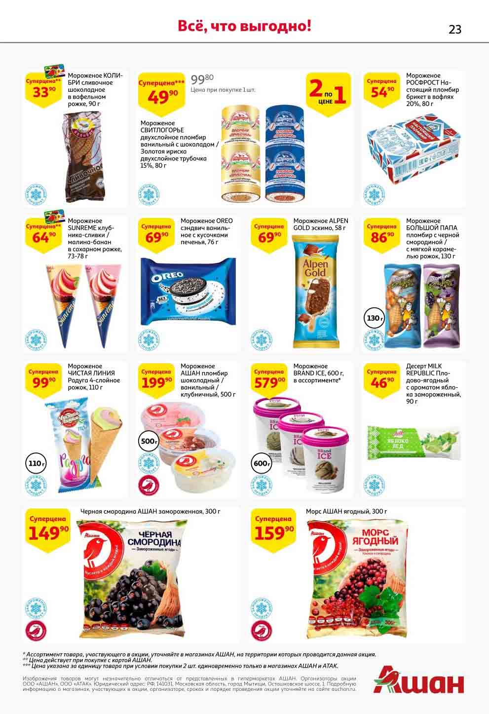 На страницах каталога Ашан вы найдете все свои любимые продукты, которые сейчас предлагаются в супермаркете. Не пропустите последние специальные предложения и сэкономьте на покупках. Предложение действительно при наличии товара на прилавках. Скидки на товары, указанные в каталоге, не суммируются с другими скидками. Изображения товаров могут незначительно отличаться от представленных на полках. Цены по акции Ашан действуют в городах: Москва. Балашиха. Химки. Подольск. Королев. Мытищи. Люберцы. Электросталь. Коломна. Одинцово. Железнодорожный, Серпухов, Орехово-Зуево. Красногорск, Щелково, Сергиев Посад, Пушкино. Жуковский, Ногинск, Раменское и многих других населенных пунктах Московского региона.