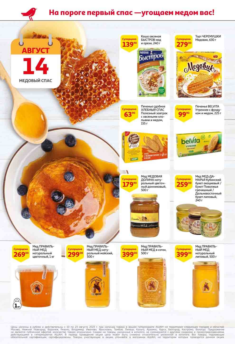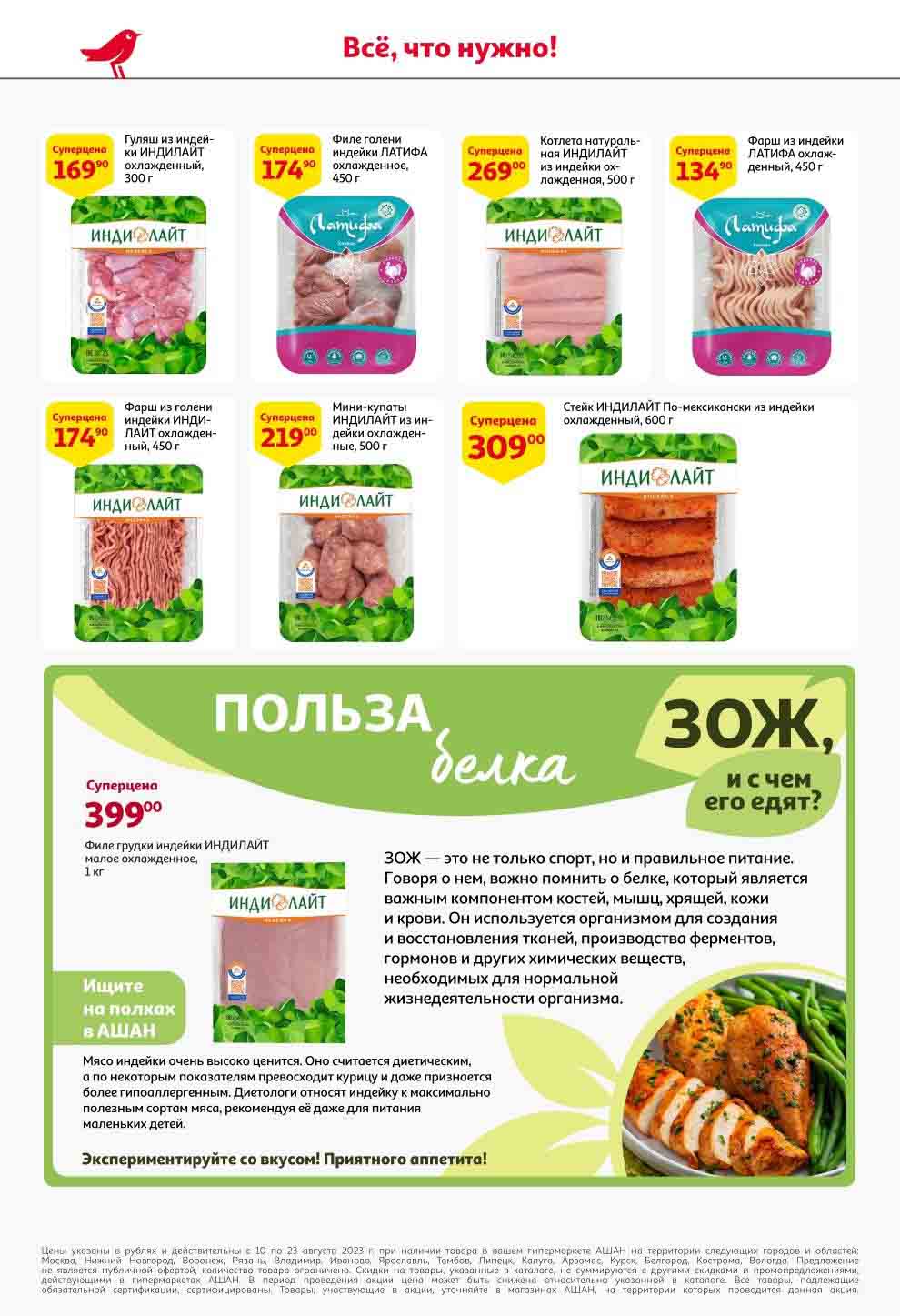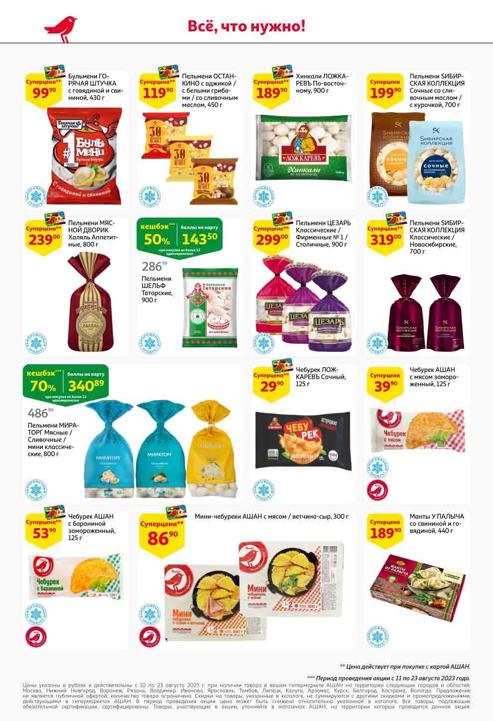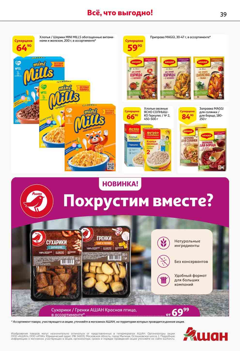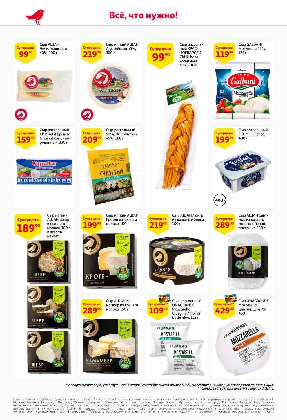 На страницах каталога Ашан вы найдете все свои любимые продукты, которые сейчас предлагаются в супермаркете. Не пропустите последние специальные предложения и сэкономьте на покупках. Предложение действительно при наличии товара на прилавках. Скидки на товары, указанные в каталоге, не суммируются с другими скидками. Изображения товаров могут незначительно отличаться от представленных на полках. Цены по акции Ашан действуют в городах: Москва. Балашиха. Химки. Подольск. Королев. Мытищи. Люберцы. Электросталь. Коломна. Одинцово. Железнодорожный, Серпухов, Орехово-Зуево. Красногорск, Щелково, Сергиев Посад, Пушкино. Жуковский, Ногинск, Раменское и многих других населенных пунктах Московского региона.