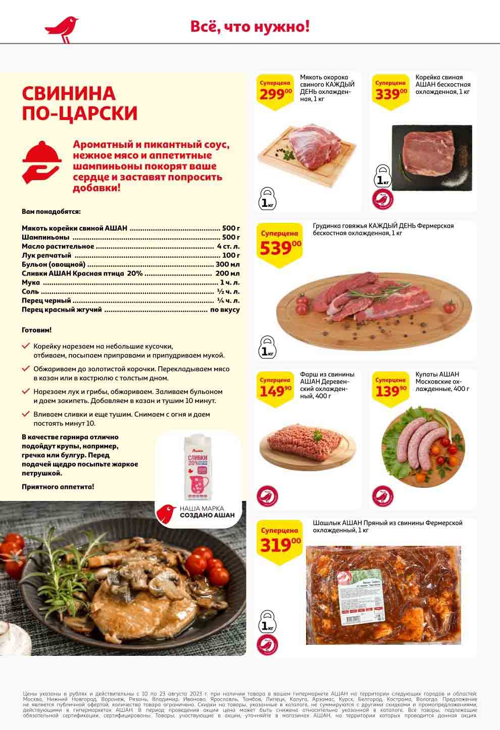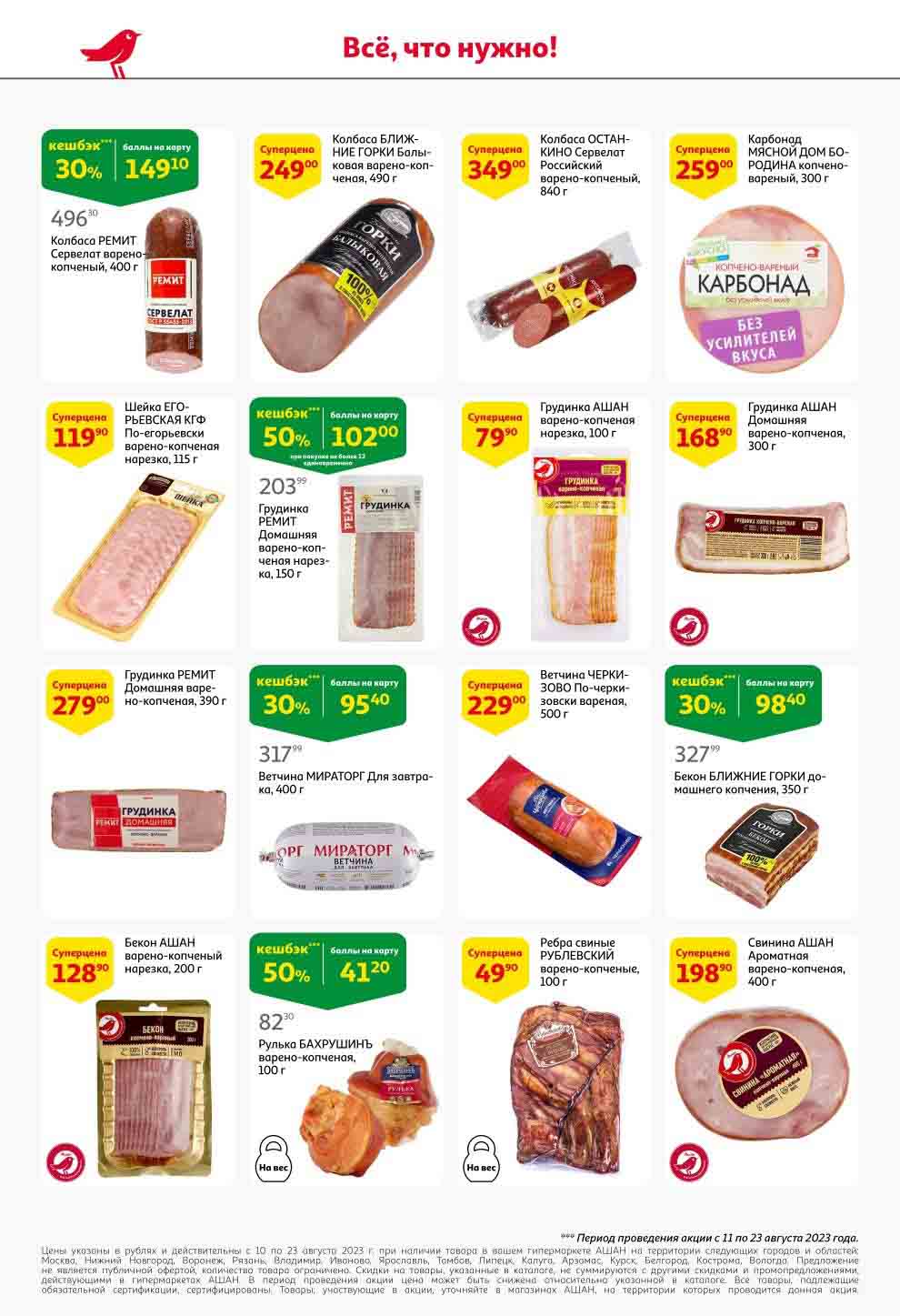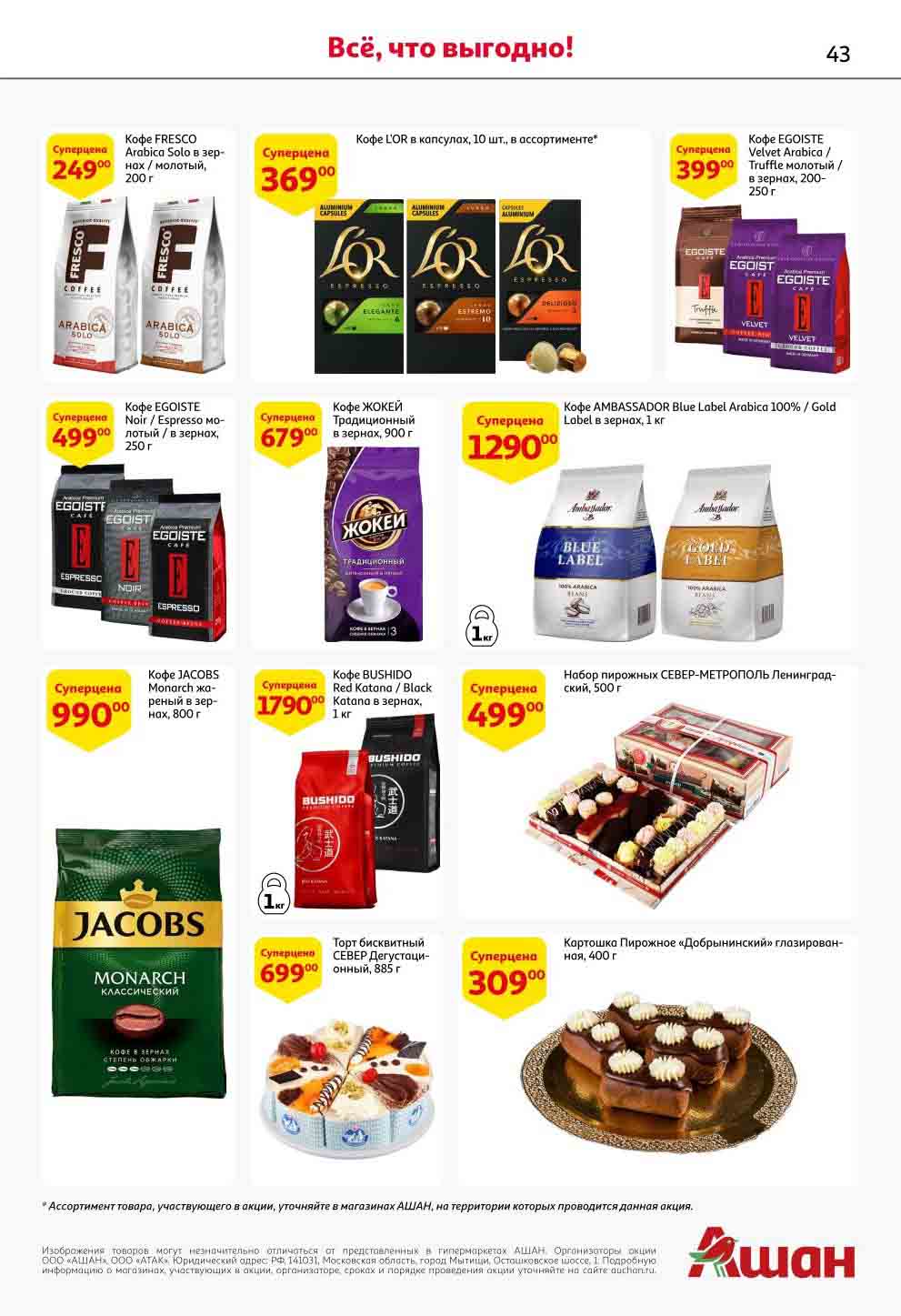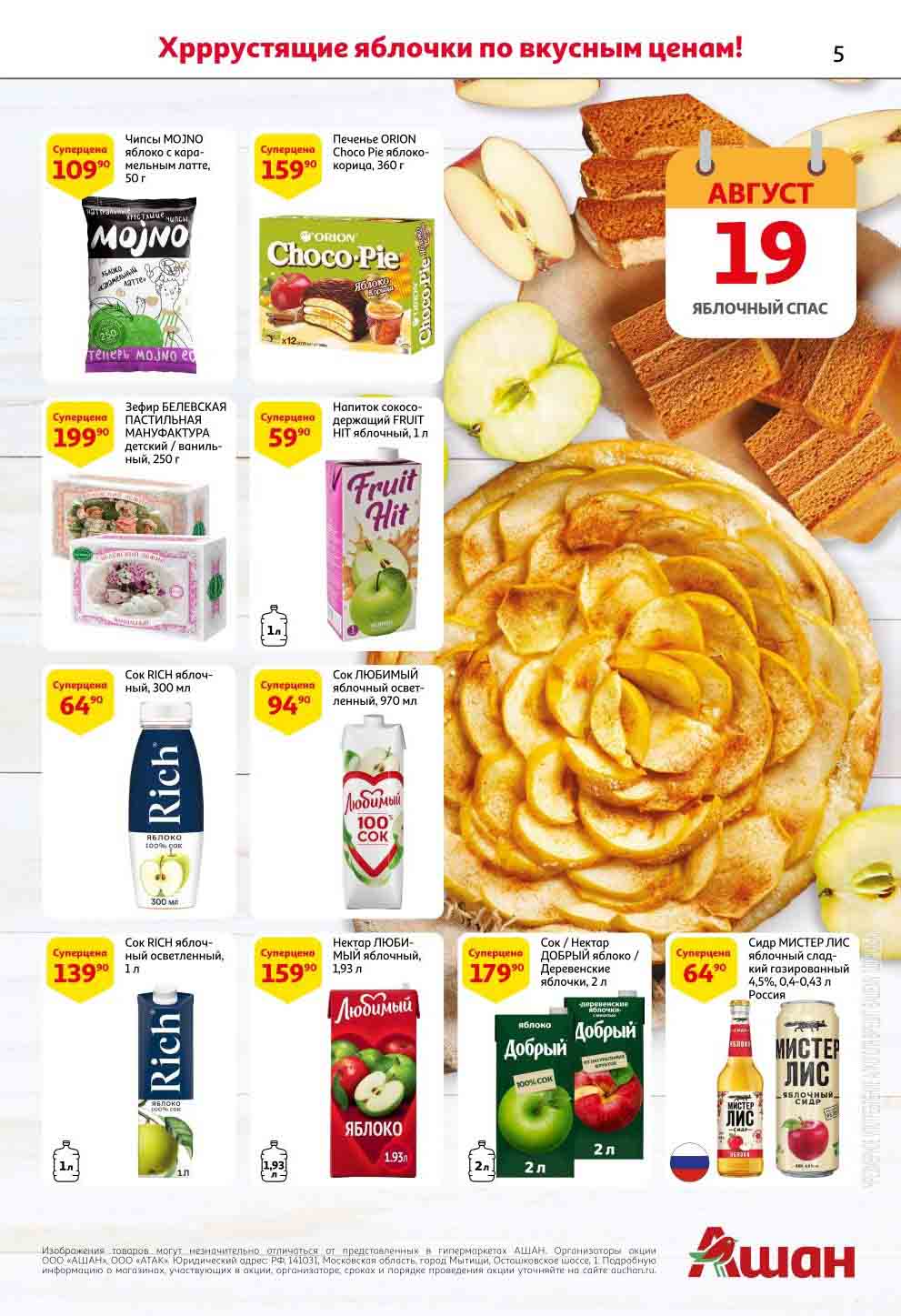 На страницах каталога Ашан вы найдете все свои любимые продукты, которые сейчас предлагаются в супермаркете. Не пропустите последние специальные предложения и сэкономьте на покупках. Предложение действительно при наличии товара на прилавках. Скидки на товары, указанные в каталоге, не суммируются с другими скидками. Изображения товаров могут незначительно отличаться от представленных на полках. Цены по акции Ашан действуют в городах: Москва. Балашиха. Химки. Подольск. Королев. Мытищи. Люберцы. Электросталь. Коломна. Одинцово. Железнодорожный, Серпухов, Орехово-Зуево. Красногорск, Щелково, Сергиев Посад, Пушкино. Жуковский, Ногинск, Раменское и многих других населенных пунктах Московского региона.