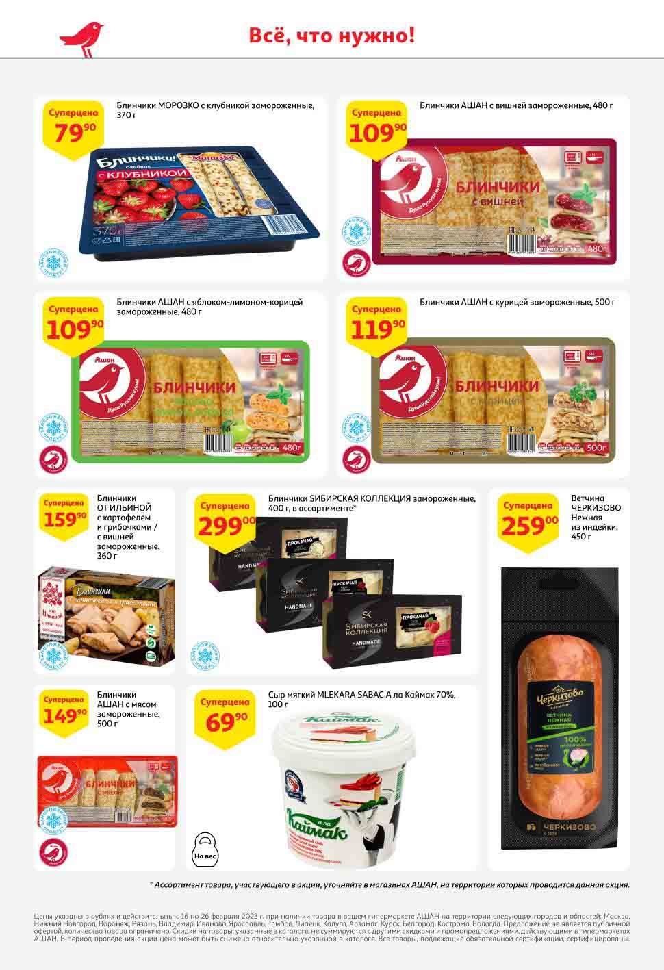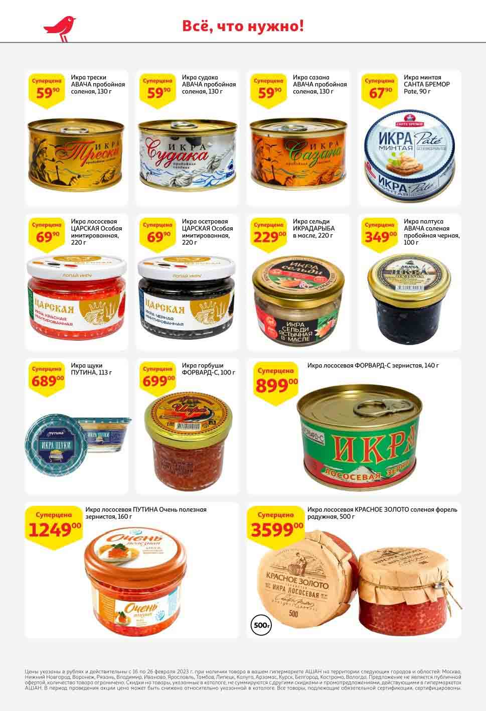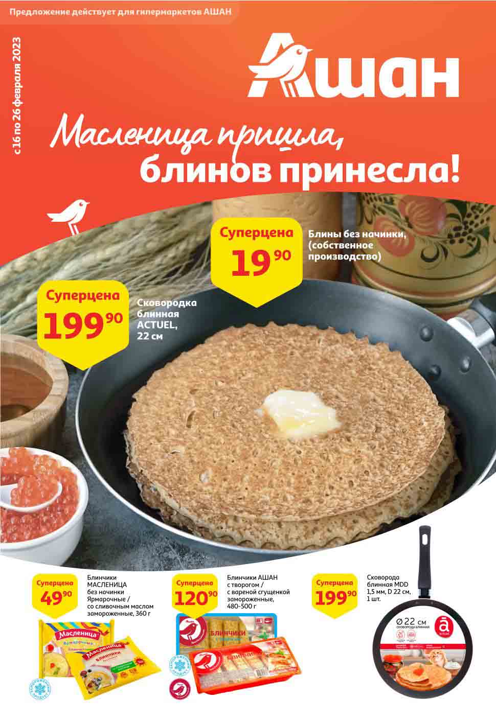На страницах каталога Ашан вы найдете все свои любимые продукты, которые сейчас предлагаются в супермаркете. Не пропустите последние специальные предложения и сэкономьте на покупках. Предложение действительно при наличии товара на прилавках. Скидки на товары, указанные в каталоге, не суммируются с другими скидками. Изображения товаров могут незначительно отличаться от представленных на полках. Цены по акции Ашан действуют в городах: Москва. Балашиха. Химки. Подольск. Королев. Мытищи. Люберцы. Электросталь. Коломна. Одинцово. Железнодорожный, Серпухов, Орехово-Зуево. Красногорск, Щелково, Сергиев Посад, Пушкино. Жуковский, Ногинск, Раменское и многих других населенных пунктах Московского региона.