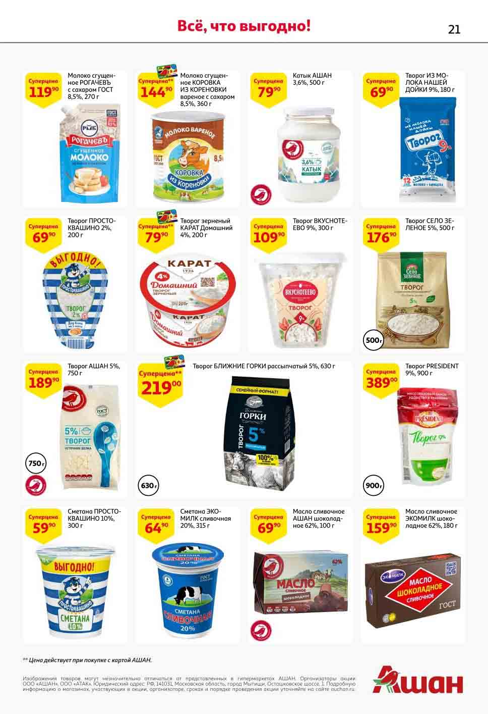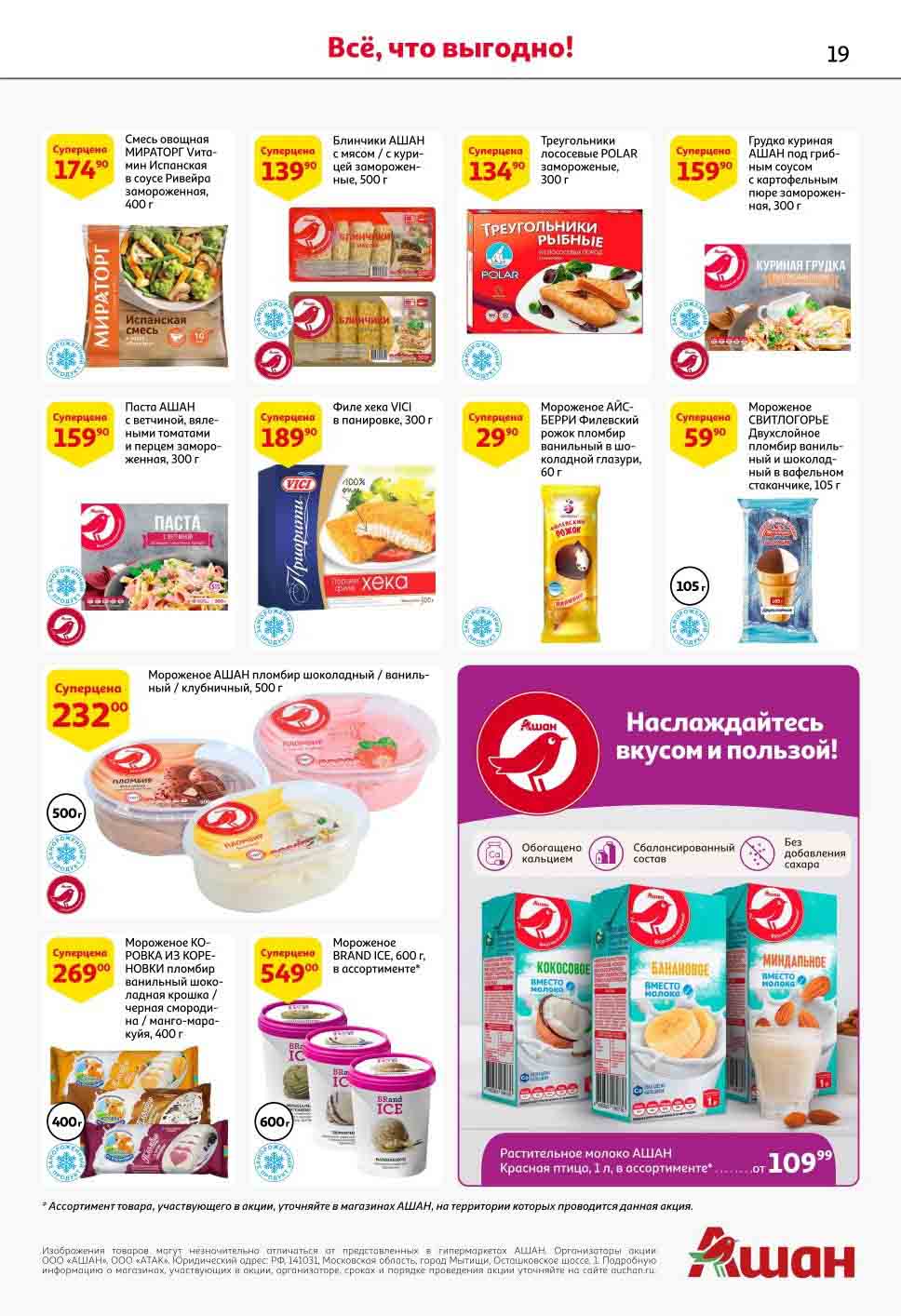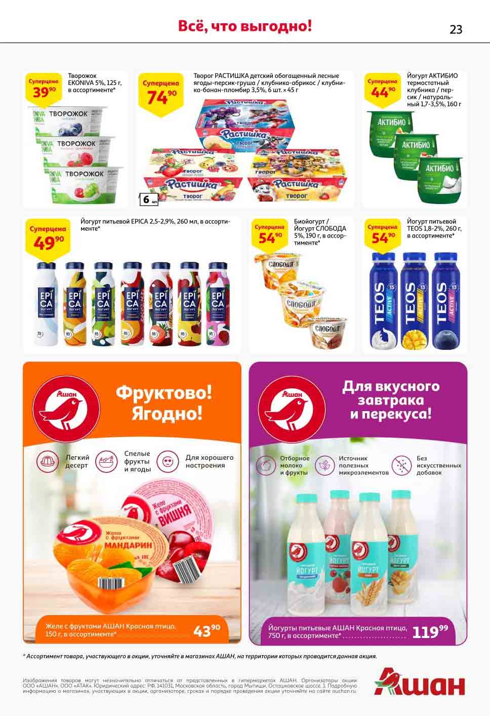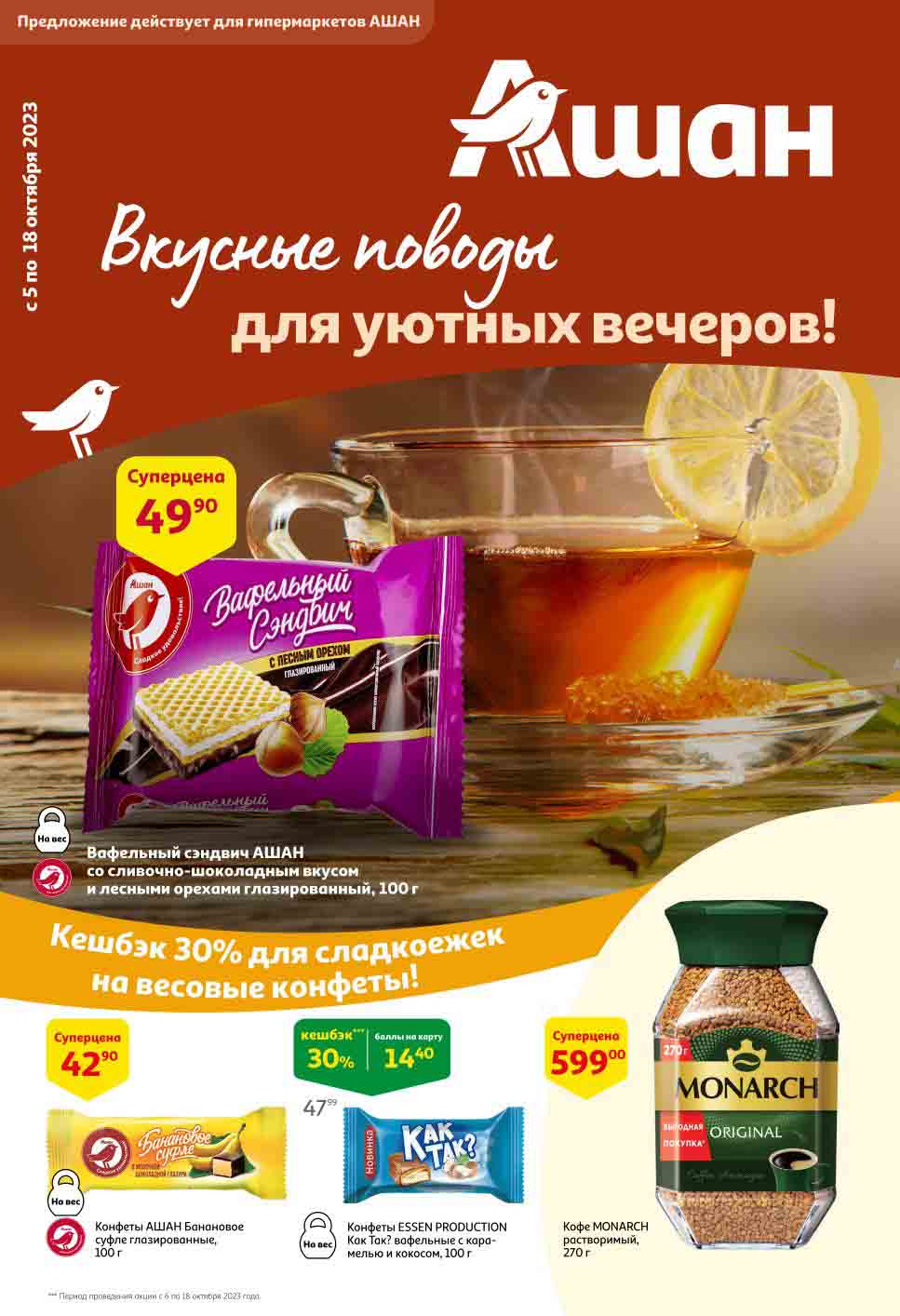 На страницах каталога Ашан вы найдете все свои любимые продукты, которые сейчас предлагаются в супермаркете. Не пропустите последние специальные предложения и сэкономьте на покупках. Предложение действительно при наличии товара на прилавках. Скидки на товары, указанные в каталоге, не суммируются с другими скидками. Изображения товаров могут незначительно отличаться от представленных на полках. Цены по акции Ашан действуют в городах: Москва. Балашиха. Химки. Подольск. Королев. Мытищи. Люберцы. Электросталь. Коломна. Одинцово. Железнодорожный, Серпухов, Орехово-Зуево. Красногорск, Щелково, Сергиев Посад, Пушкино. Жуковский, Ногинск, Раменское и многих других населенных пунктах Московского региона.