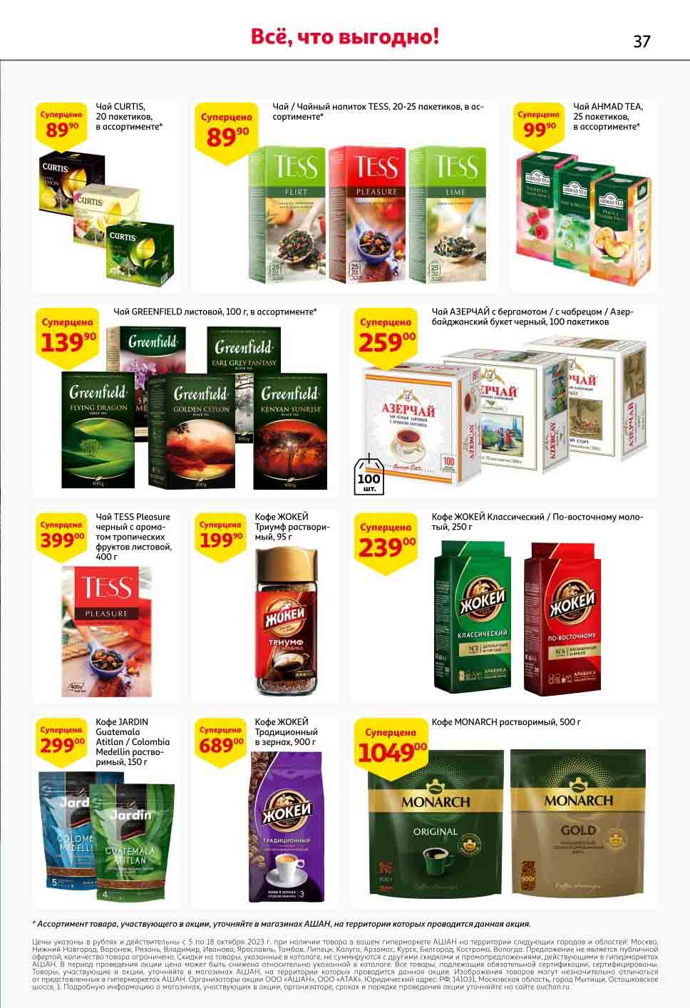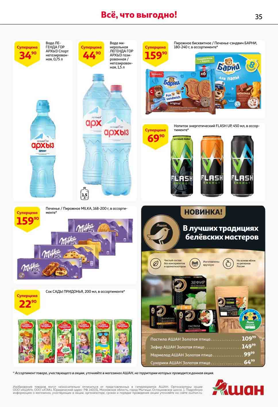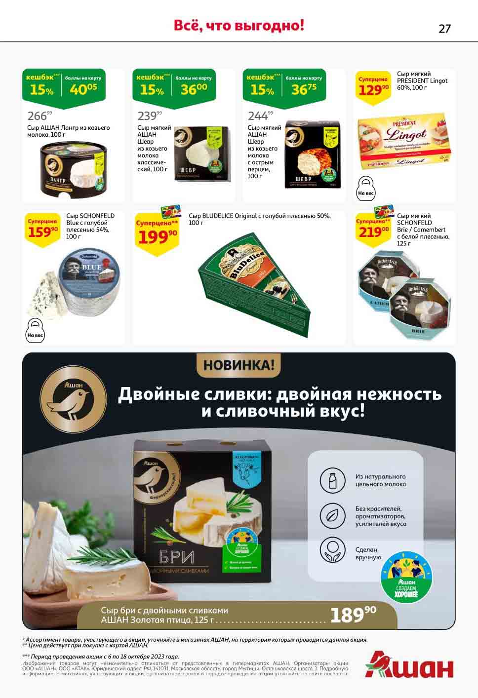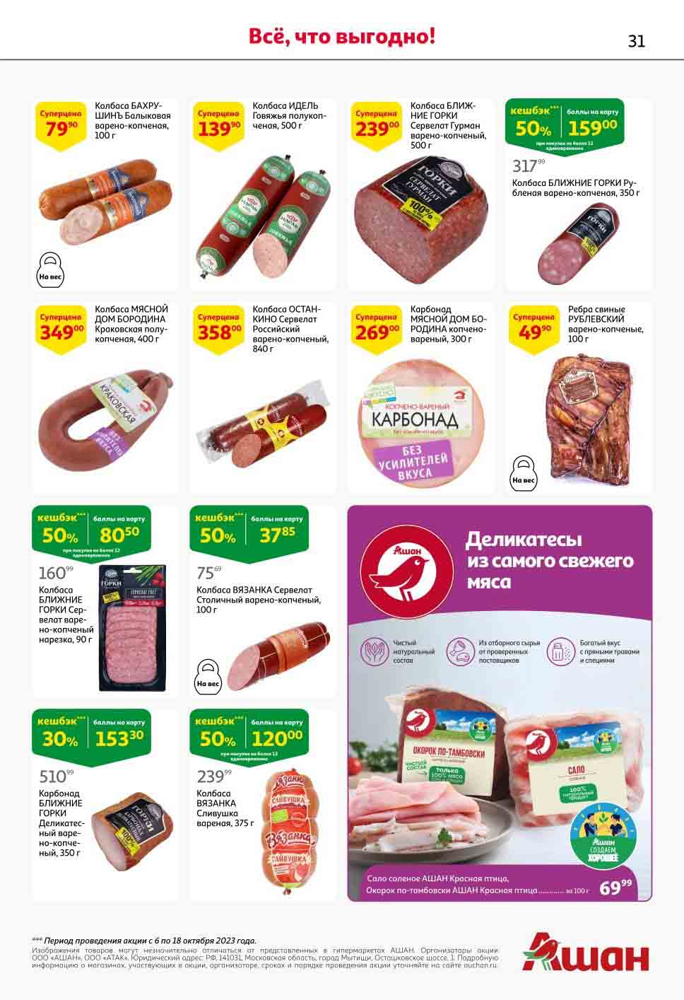 На страницах каталога Ашан вы найдете все свои любимые продукты, которые сейчас предлагаются в супермаркете. Не пропустите последние специальные предложения и сэкономьте на покупках. Предложение действительно при наличии товара на прилавках. Скидки на товары, указанные в каталоге, не суммируются с другими скидками. Изображения товаров могут незначительно отличаться от представленных на полках. Цены по акции Ашан действуют в городах: Москва. Балашиха. Химки. Подольск. Королев. Мытищи. Люберцы. Электросталь. Коломна. Одинцово. Железнодорожный, Серпухов, Орехово-Зуево. Красногорск, Щелково, Сергиев Посад, Пушкино. Жуковский, Ногинск, Раменское и многих других населенных пунктах Московского региона.
