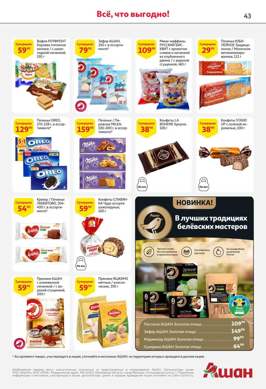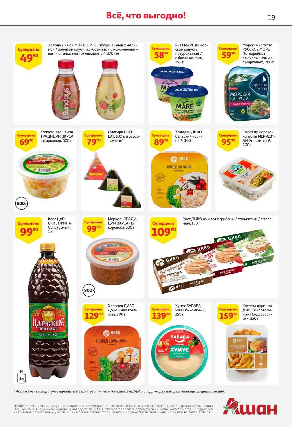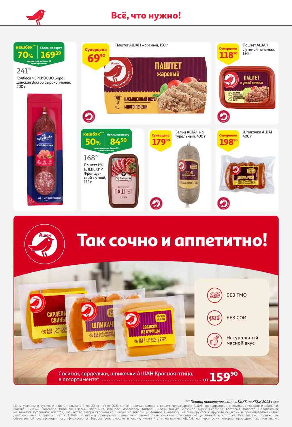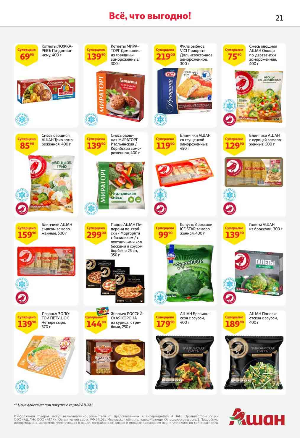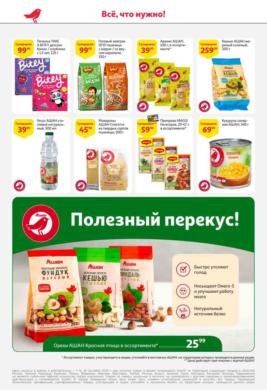 На страницах каталога Ашан вы найдете все свои любимые продукты, которые сейчас предлагаются в супермаркете. Не пропустите последние специальные предложения и сэкономьте на покупках. Предложение действительно при наличии товара на прилавках. Скидки на товары, указанные в каталоге, не суммируются с другими скидками. Изображения товаров могут незначительно отличаться от представленных на полках. Цены по акции Ашан действуют в городах: Москва. Балашиха. Химки. Подольск. Королев. Мытищи. Люберцы. Электросталь. Коломна. Одинцово. Железнодорожный, Серпухов, Орехово-Зуево. Красногорск, Щелково, Сергиев Посад, Пушкино. Жуковский, Ногинск, Раменское и многих других населенных пунктах Московского региона.