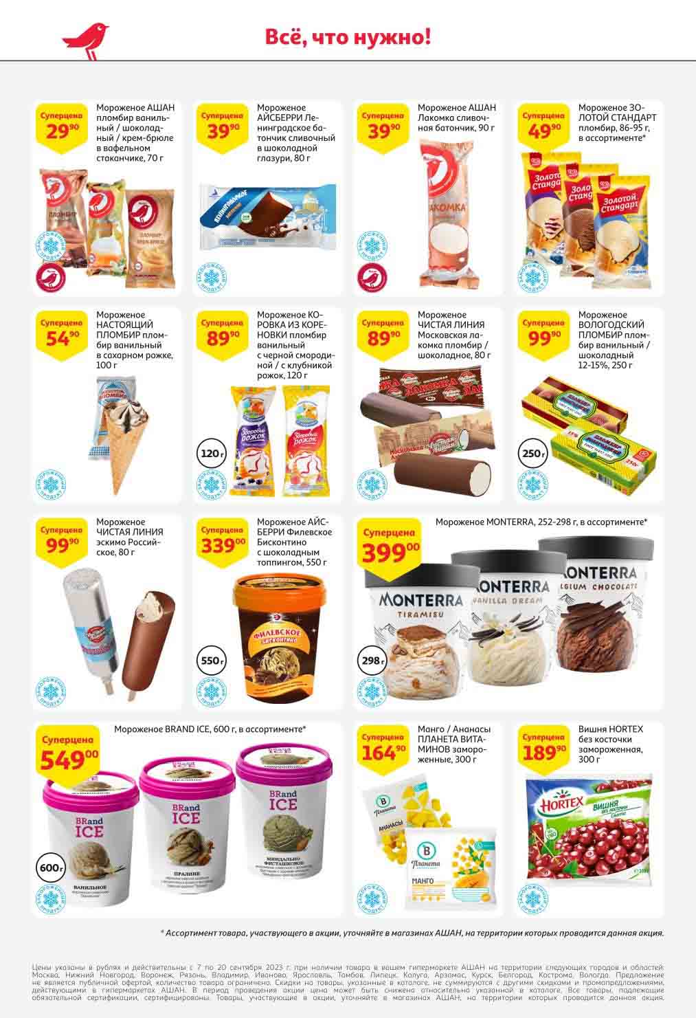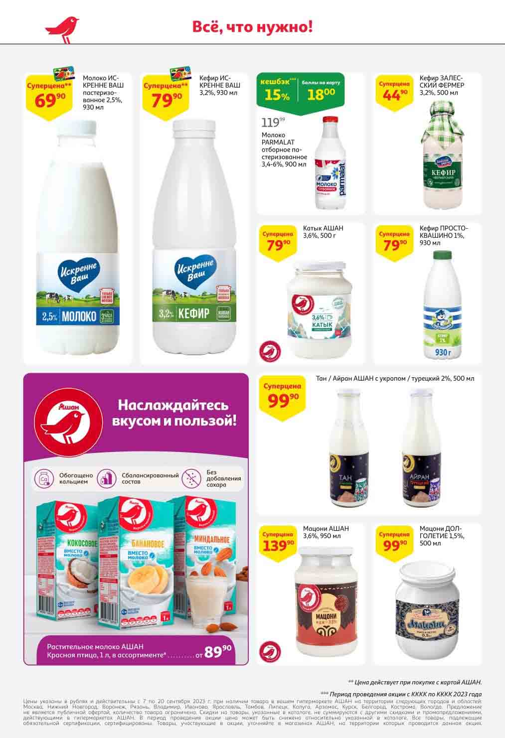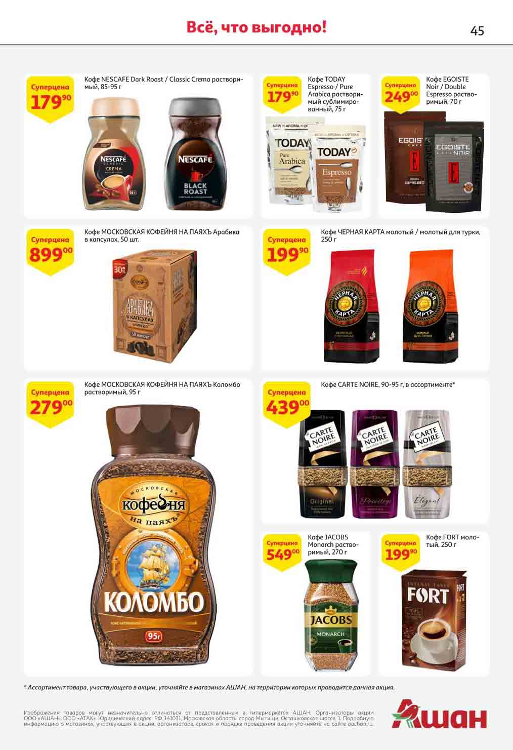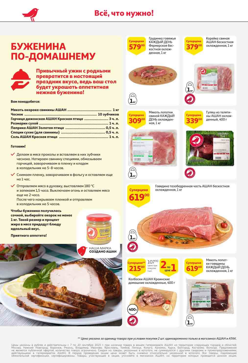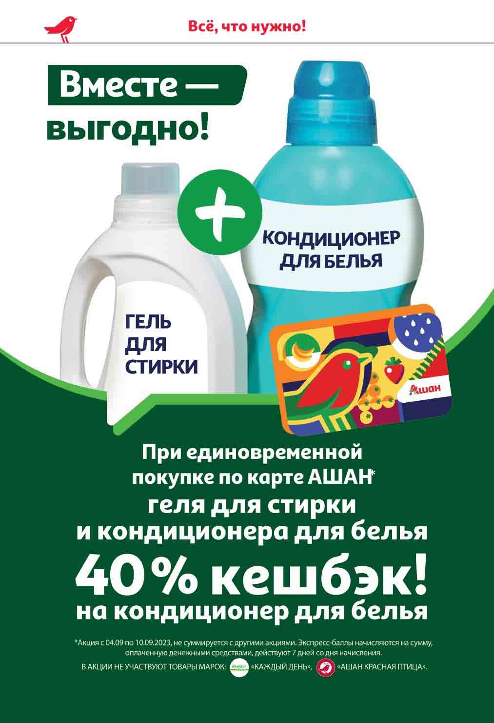 На страницах каталога Ашан вы найдете все свои любимые продукты, которые сейчас предлагаются в супермаркете. Не пропустите последние специальные предложения и сэкономьте на покупках. Предложение действительно при наличии товара на прилавках. Скидки на товары, указанные в каталоге, не суммируются с другими скидками. Изображения товаров могут незначительно отличаться от представленных на полках. Цены по акции Ашан действуют в городах: Москва. Балашиха. Химки. Подольск. Королев. Мытищи. Люберцы. Электросталь. Коломна. Одинцово. Железнодорожный, Серпухов, Орехово-Зуево. Красногорск, Щелково, Сергиев Посад, Пушкино. Жуковский, Ногинск, Раменское и многих других населенных пунктах Московского региона.