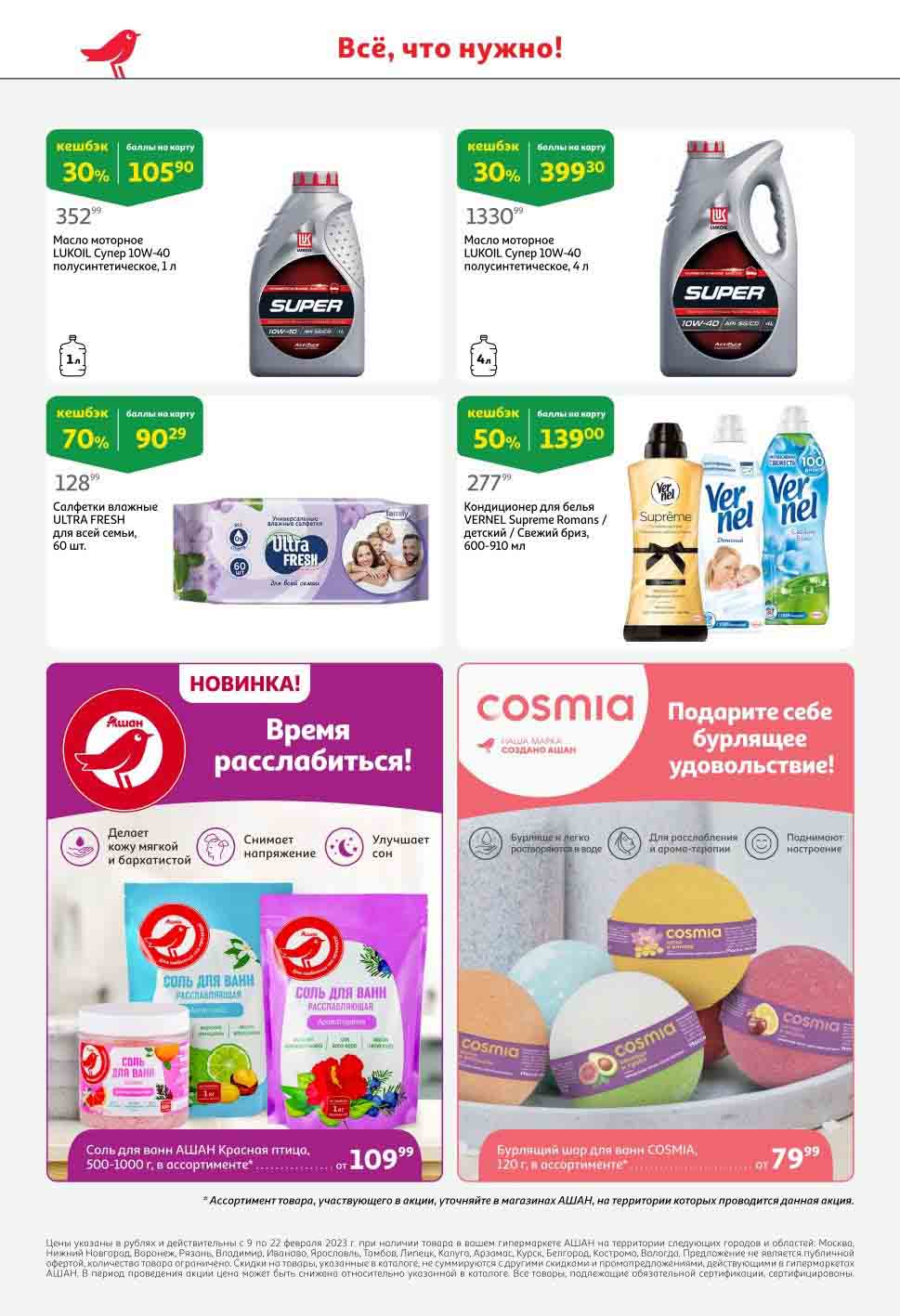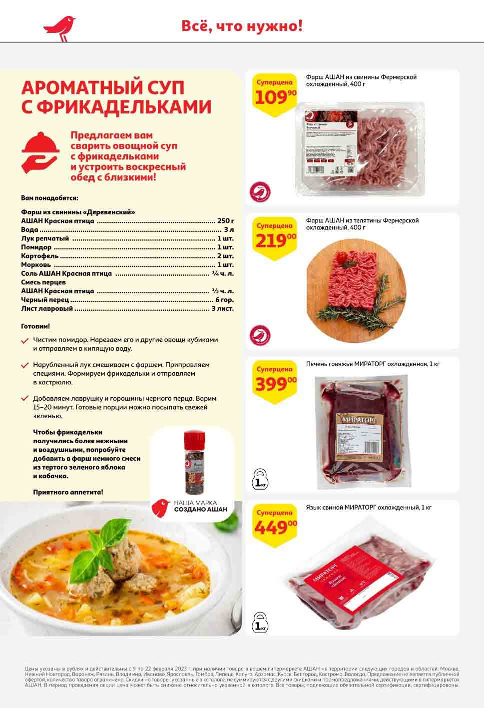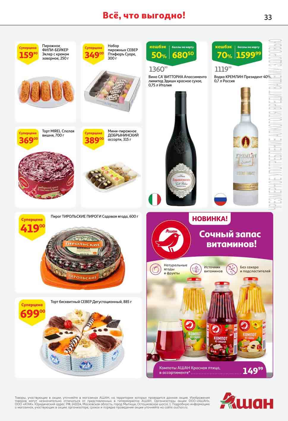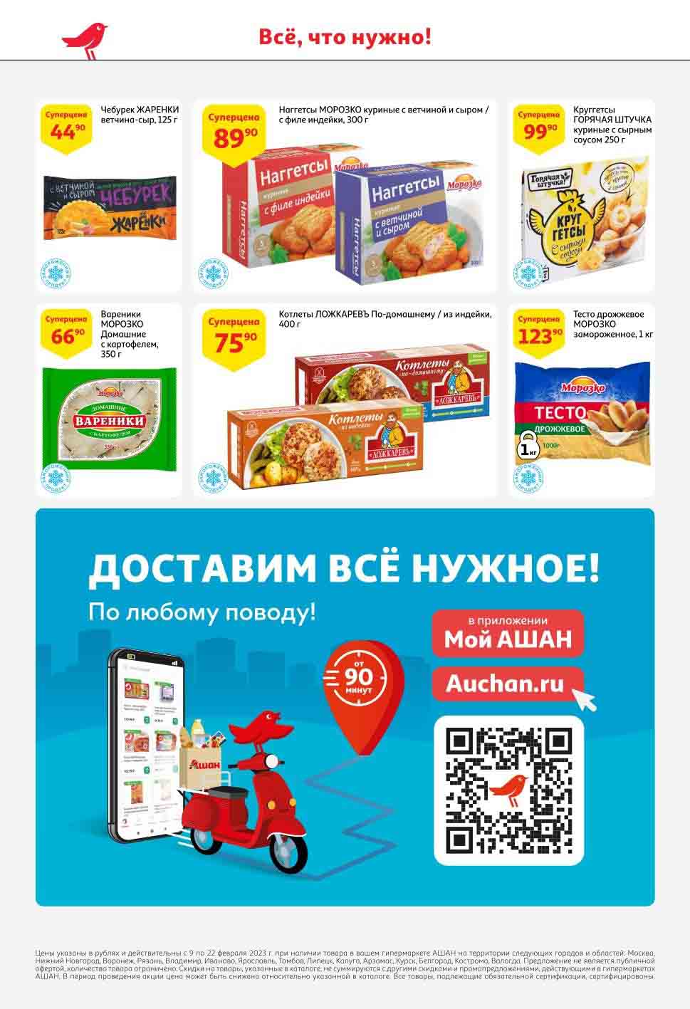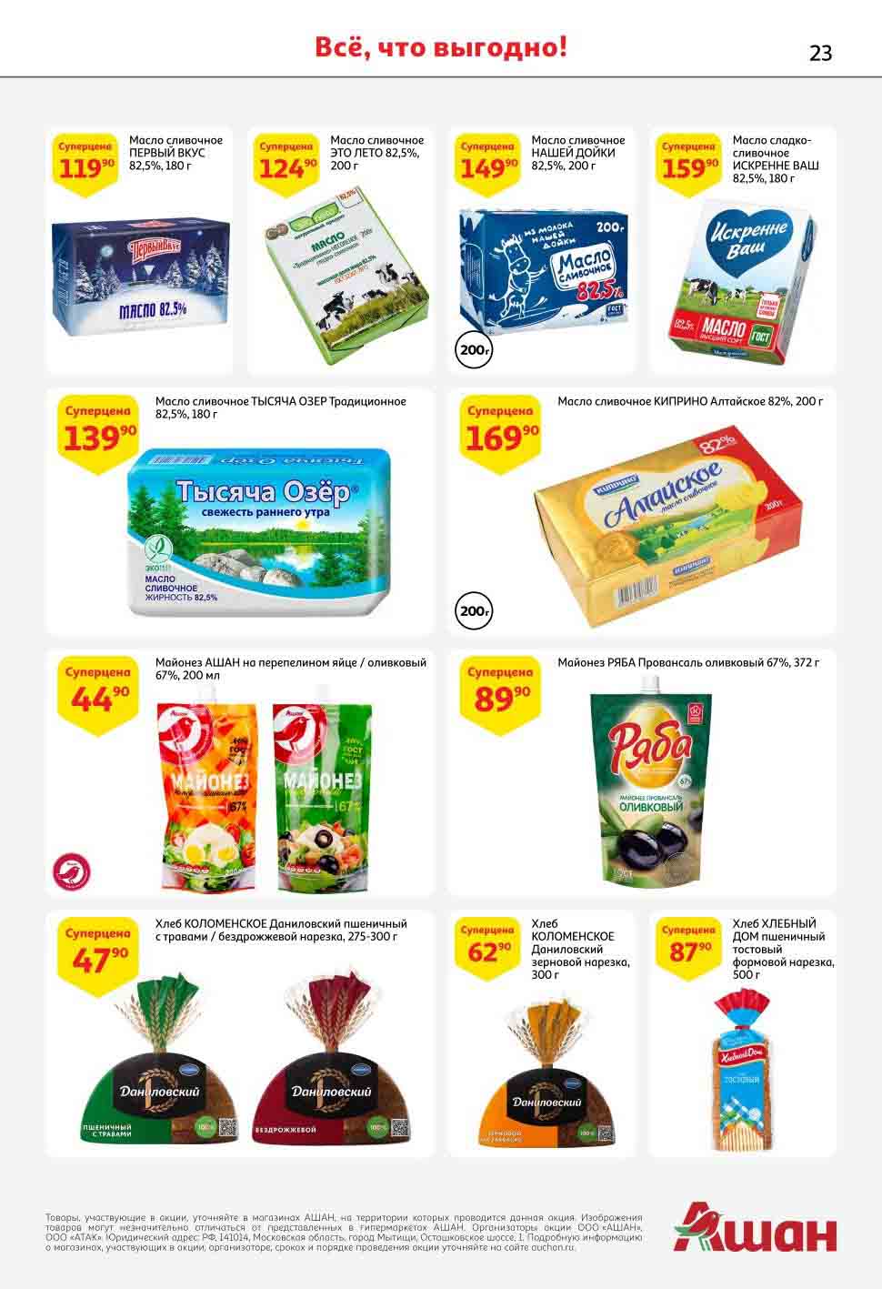 На страницах каталога Ашан вы найдете все свои любимые продукты, которые сейчас предлагаются в супермаркете. Не пропустите последние специальные предложения и сэкономьте на покупках. Предложение действительно при наличии товара на прилавках. Скидки на товары, указанные в каталоге, не суммируются с другими скидками. Изображения товаров могут незначительно отличаться от представленных на полках. Цены по акции Ашан действуют в городах: Москва. Балашиха. Химки. Подольск. Королев. Мытищи. Люберцы. Электросталь. Коломна. Одинцово. Железнодорожный, Серпухов, Орехово-Зуево. Красногорск, Щелково, Сергиев Посад, Пушкино. Жуковский, Ногинск, Раменское и многих других населенных пунктах Московского региона.