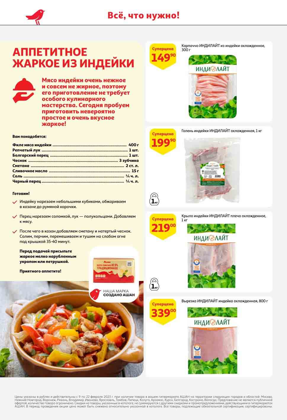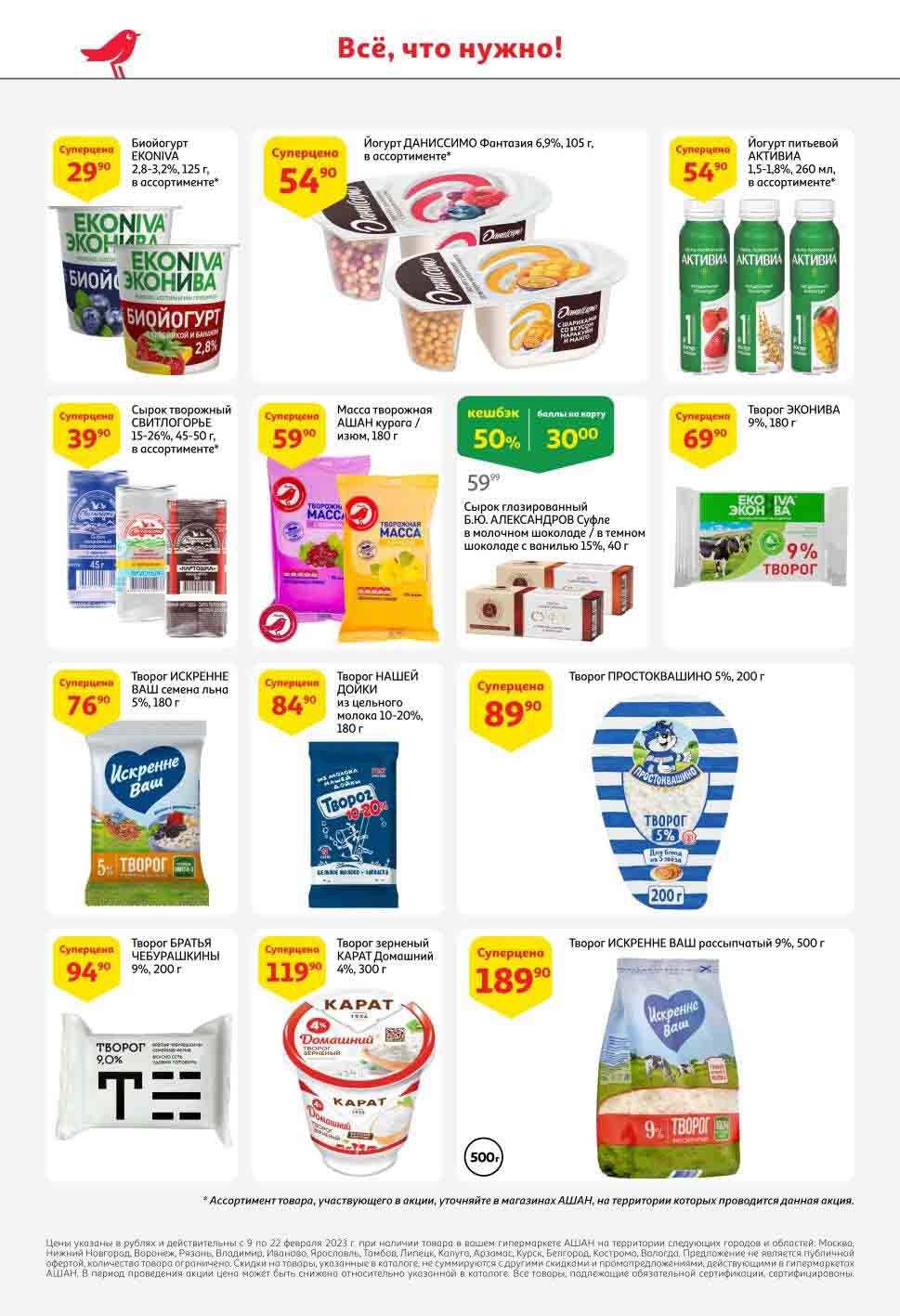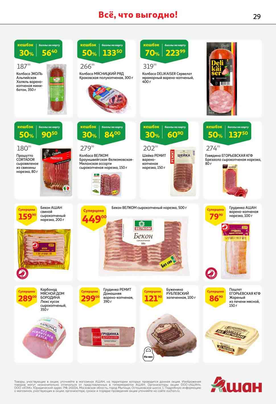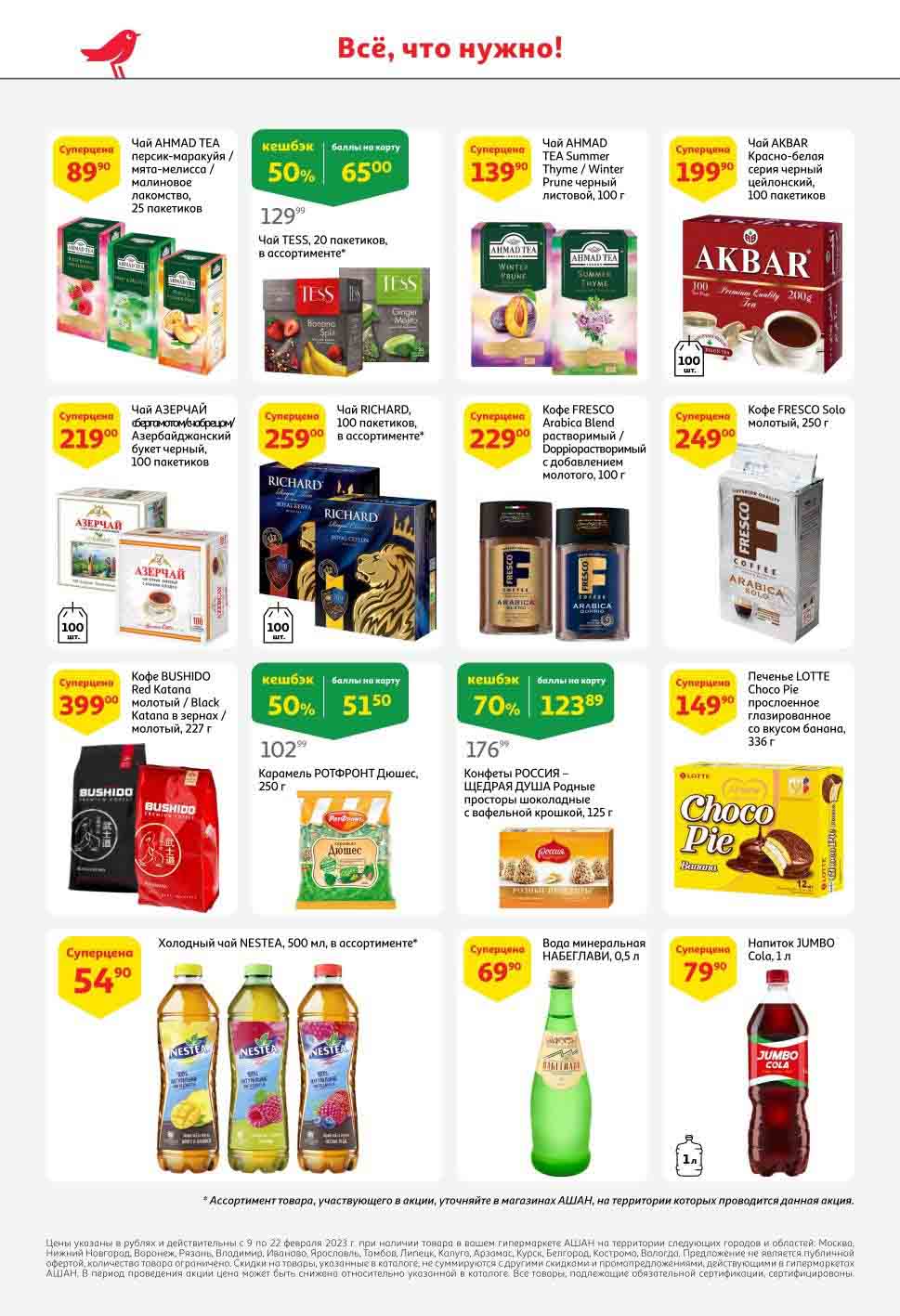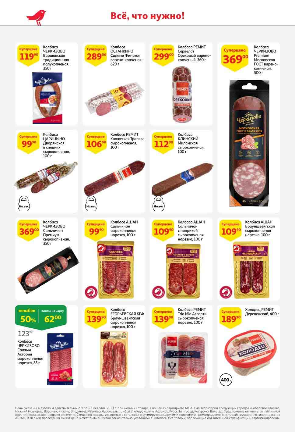 На страницах каталога Ашан вы найдете все свои любимые продукты, которые сейчас предлагаются в супермаркете. Не пропустите последние специальные предложения и сэкономьте на покупках. Предложение действительно при наличии товара на прилавках. Скидки на товары, указанные в каталоге, не суммируются с другими скидками. Изображения товаров могут незначительно отличаться от представленных на полках. Цены по акции Ашан действуют в городах: Москва. Балашиха. Химки. Подольск. Королев. Мытищи. Люберцы. Электросталь. Коломна. Одинцово. Железнодорожный, Серпухов, Орехово-Зуево. Красногорск, Щелково, Сергиев Посад, Пушкино. Жуковский, Ногинск, Раменское и многих других населенных пунктах Московского региона.
