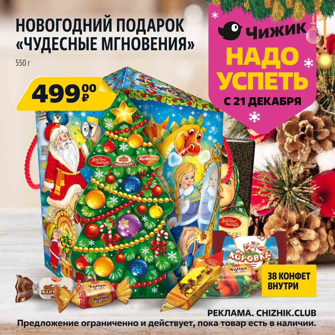 Новогодний подарок (350гр), 28 конфет внутри за 219 руб.Набор кастрюль (три штуки) за 1999 рублейПлед за 1199 руб. и столик журнальный за 799 руб.Термос с датчиком температуры (480мл) за 349 рублейНовогодний подарок (550гр), 38 конфет внутри за 499 руб.Швейная машинка(мини) за 799 рублейФутболка и брюки мужские по 399 рублейНабор разделочных досок (4шт) за 599 рублейНоски шерстяные 1 пара за 149 рублей