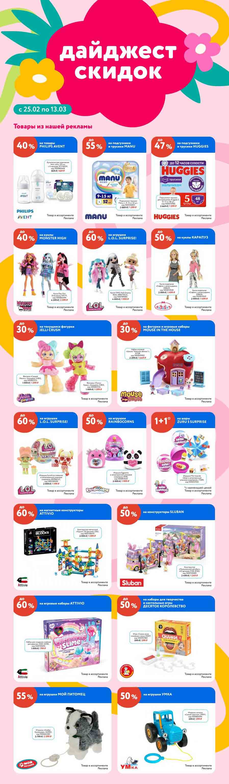 В акционном буклете предложены выгодные цены на различные товары для детей, например такие, как 40% скидка на бутылки Philips Avent Feeding, подгузники Ману за 1299 руб., подгузники Huggies имеют скидку до 47% по цене 1399 руб., и многие другие. Выгода на ассортимент до 60%.