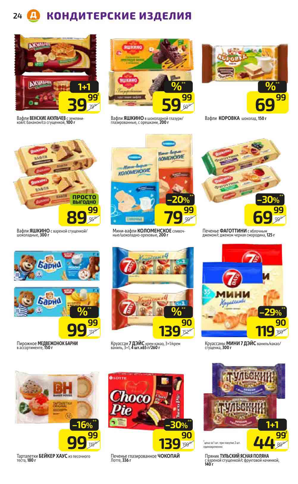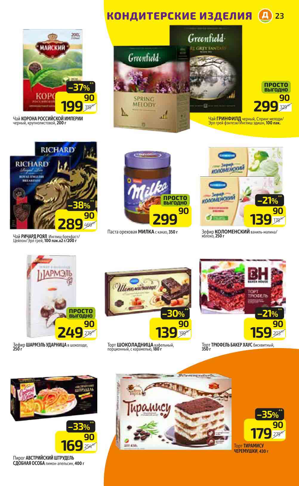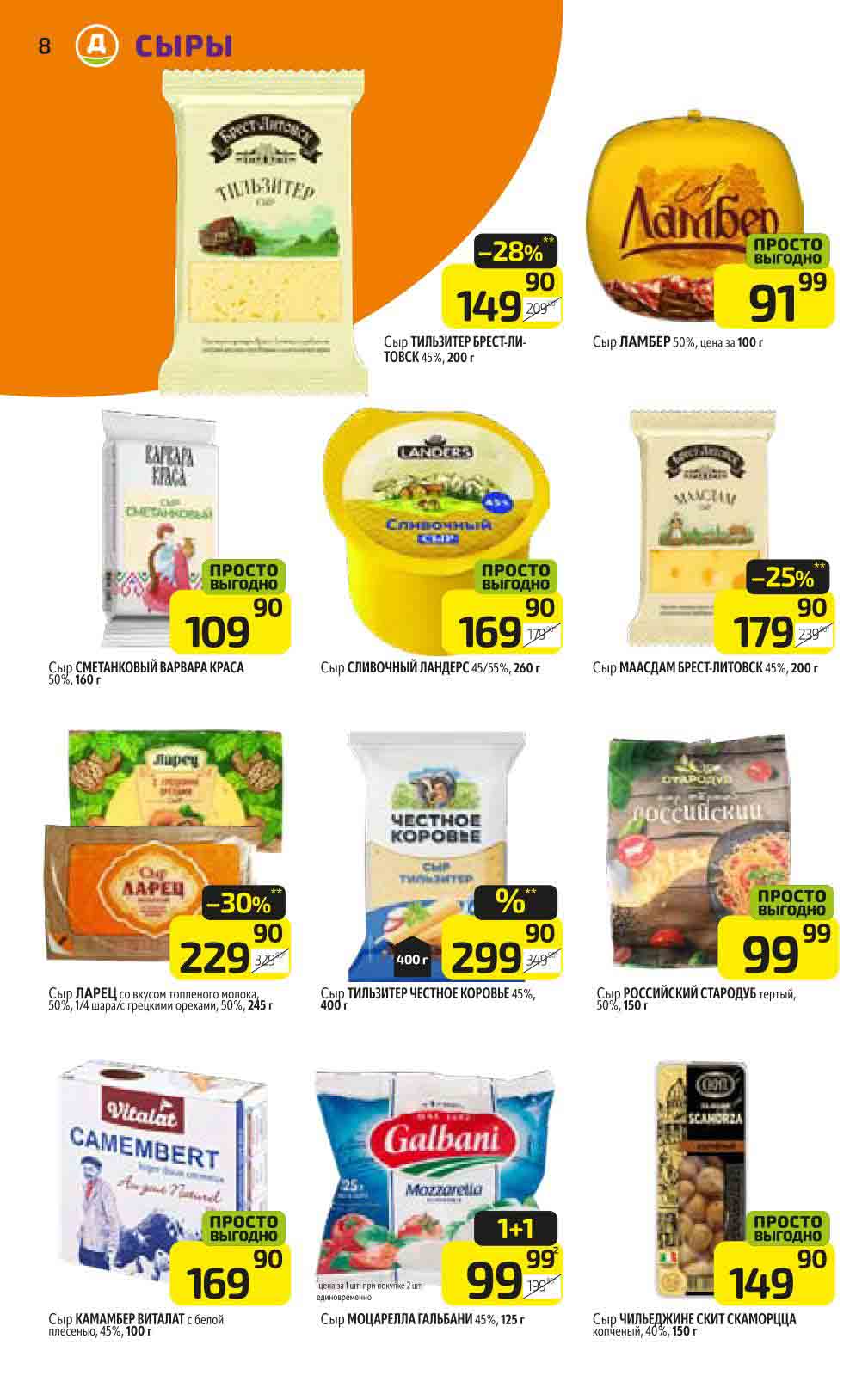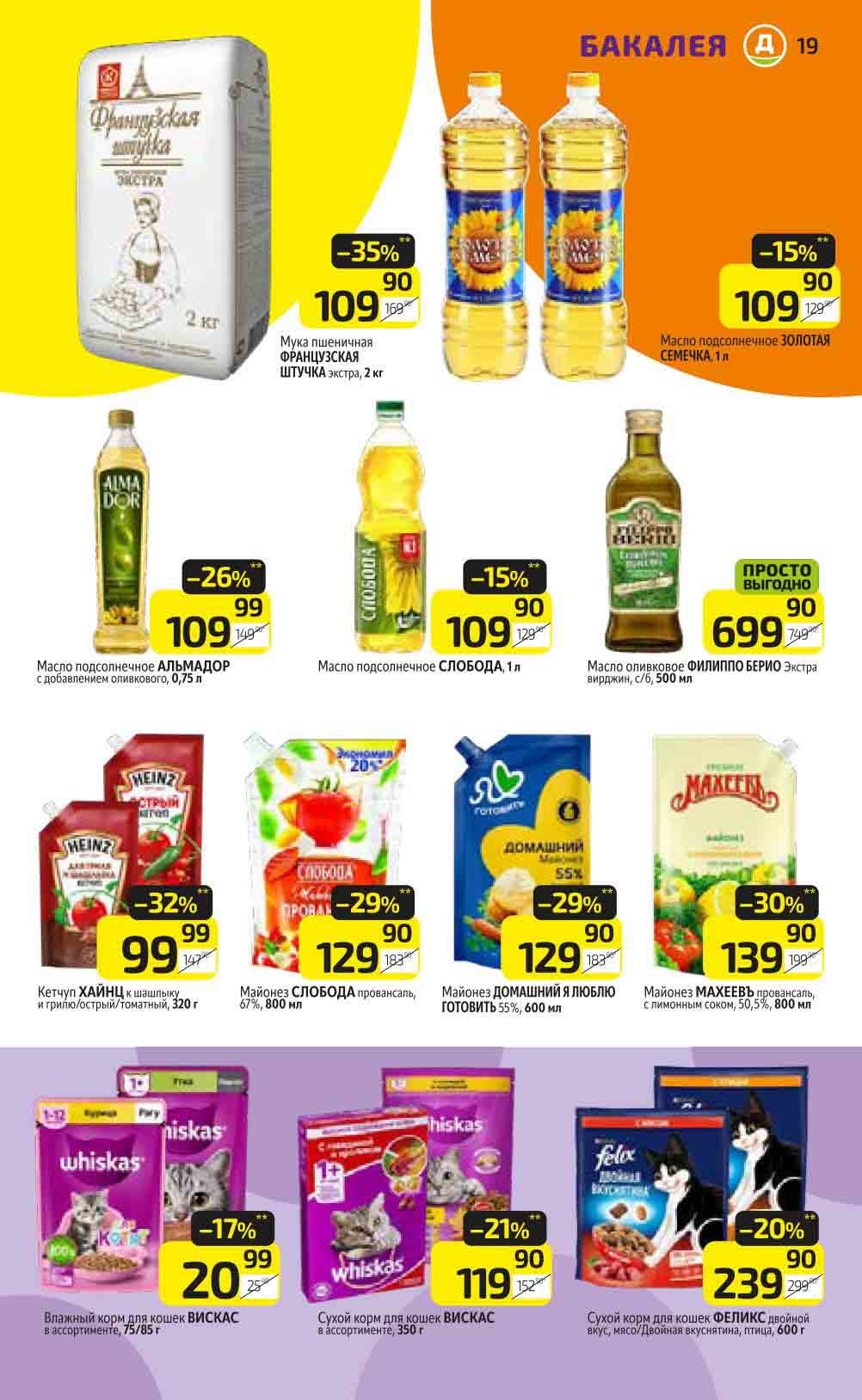 Буклет магазина включает в себя различные акции на продукты, предлагая скидки на яблоки, сыр, яйца, свинина, форель, масло, колбасу, торт и шоколад и многое другое. Есть так же дополнительные выгоды, такие как акция «1+1», где покупка одного товара дает вам другой бесплатно.