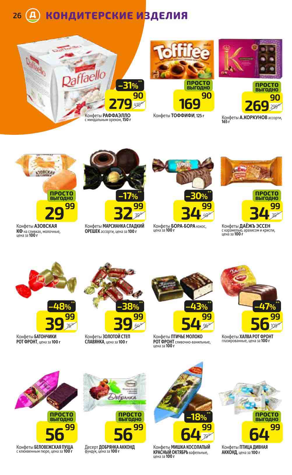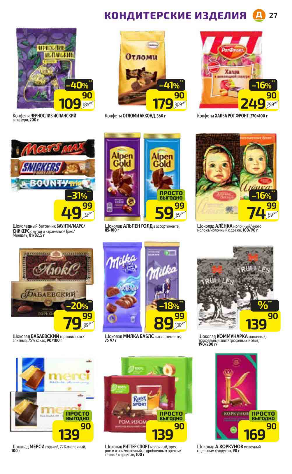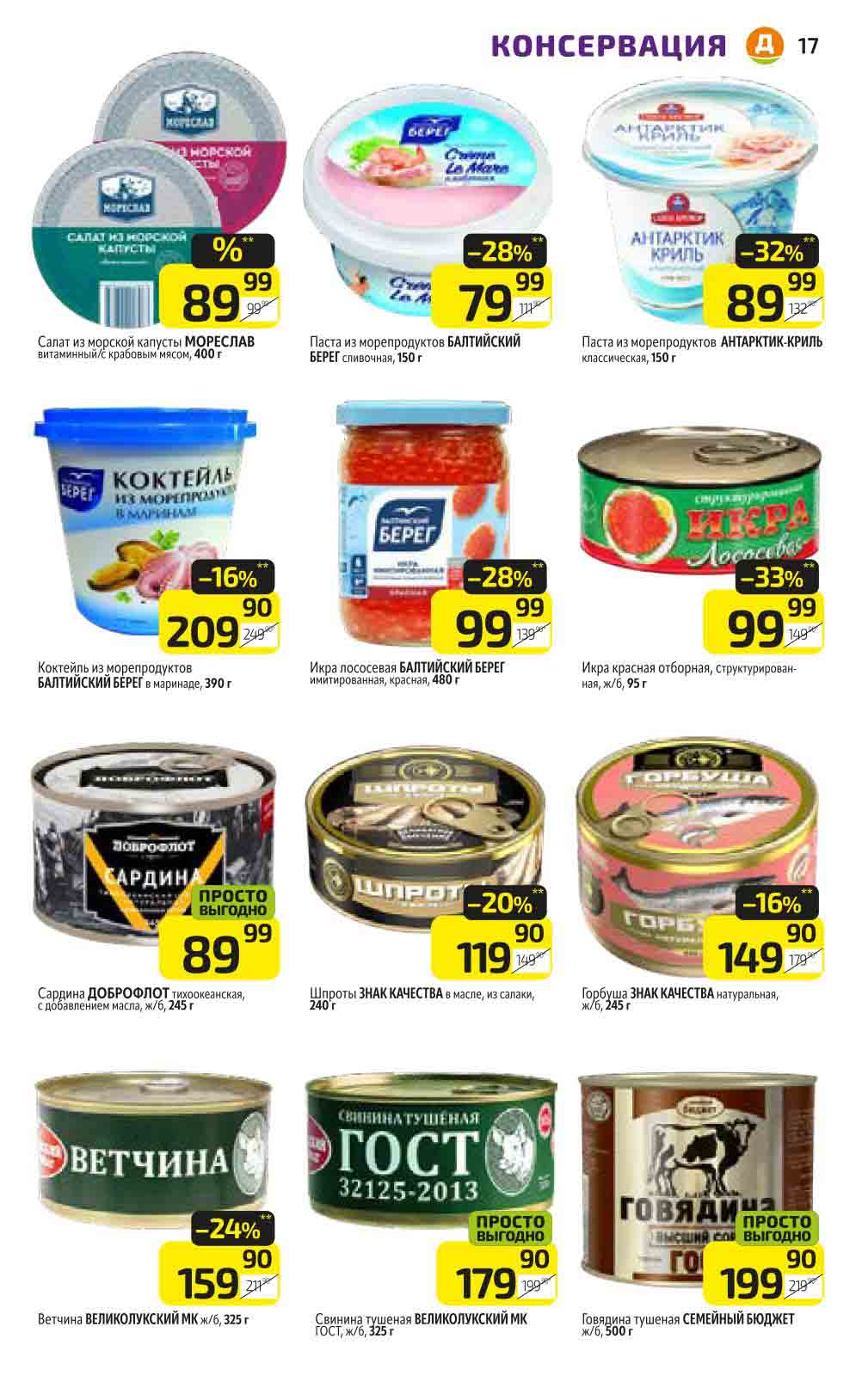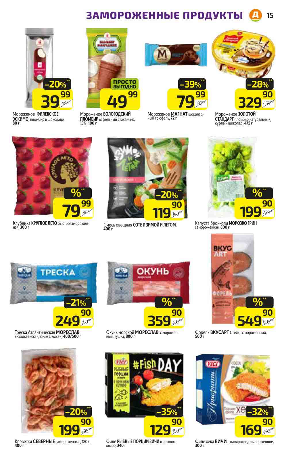Буклет магазина включает в себя различные акции на продукты, предлагая скидки на яблоки, сыр, яйца, свинина, форель, масло, колбасу, торт и шоколад и многое другое. Есть так же дополнительные выгоды, такие как акция «1+1», где покупка одного товара дает вам другой бесплатно.