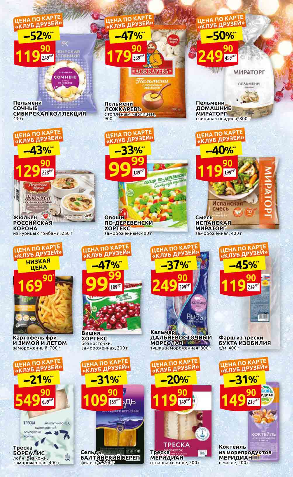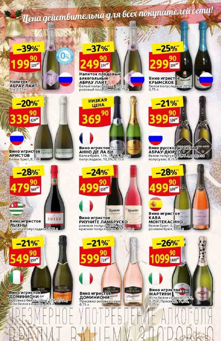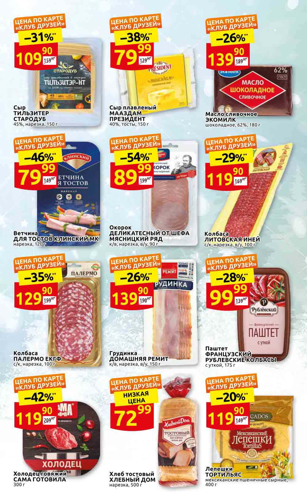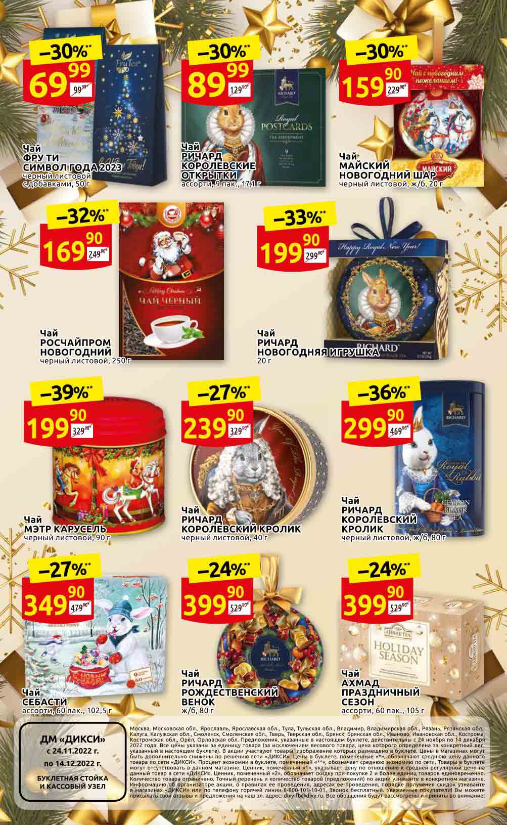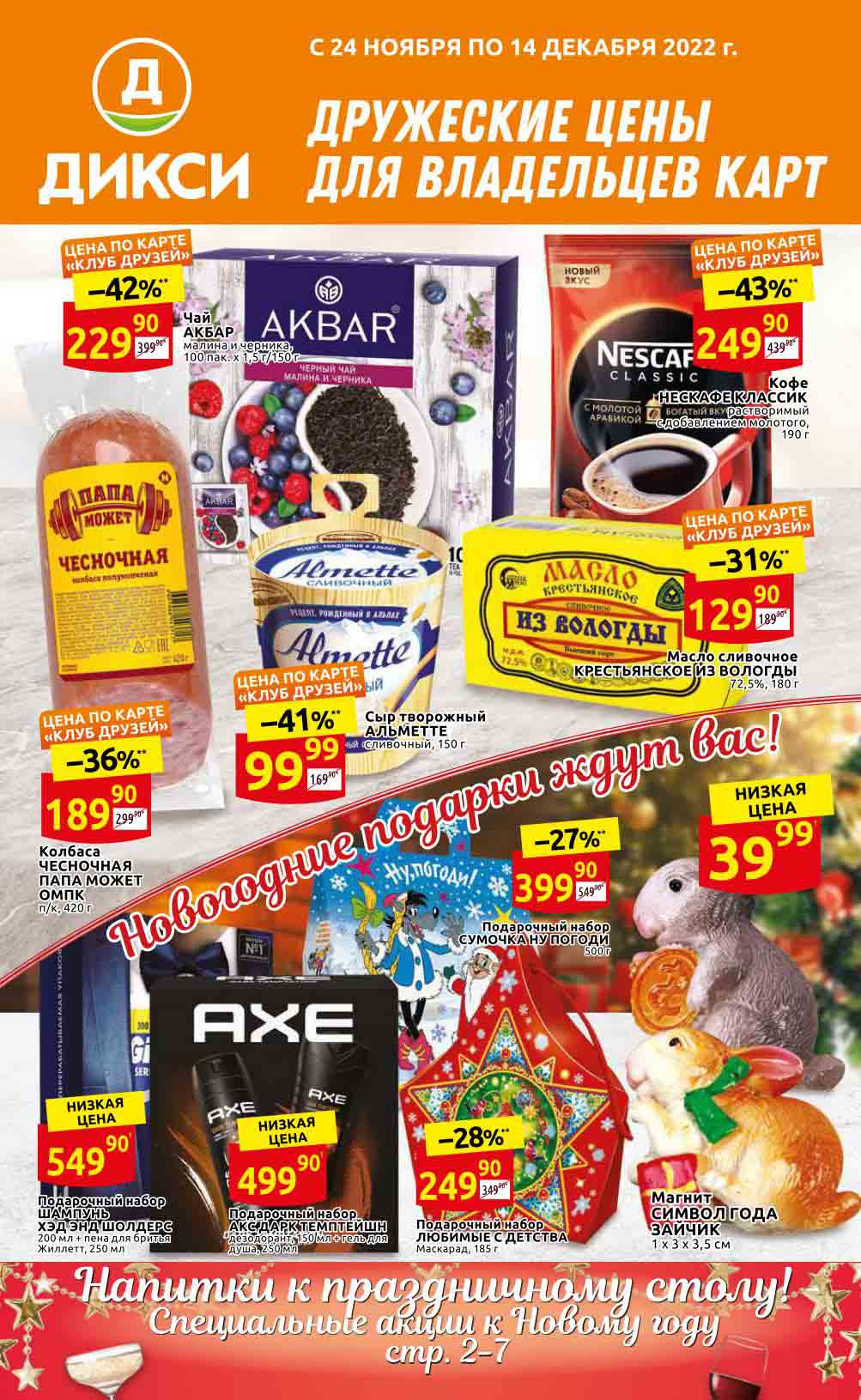 Акции «ДИКСИ» для Москва, Московская обл., Ярославль, Ярославская обл., Тула, Тульская обл., Владимир, Владимирская обл., Рязань, Рязанская обл., Калуга, Калужская обл., Смоленск, Смоленская обл., Тверь, Тверская обл., Брянск, Брянская обл., Иваново, Ивановская обл., Кострома, Костромская обл., Орёл, Орловская обл. Предложения, указанные в настоящем буклете, действительны с 24 ноября по 14 декабря 2022 года. Все цены указаны за единицу товара (за исключением весового товара, цена которого определена за конкретный вес, указанный в настоящем буклете). В акции участвуют товары, изображение которых размещено в буклете. Цены в магазинах могут быть дополнительно снижены по решению сети. Цены в буклете, помеченные «», обозначают среднюю цену данного товара по сети «ДИКСИ». Процент экономии в буклете, помеченный «*», обозначает среднюю экономию по сети. Товары в буклете могут отсутствовать в данном магазине. Ценник, помеченный «1», указывает цену по отношению к средней регулярной цене на данный товар в сети «ДИКСИ». Ценник, помеченный «2», обозначает скидку при покупке 2 и более единиц товаров единовременно. Количество товара ограничено. Точный перечень и количество товаров (предложений) по акции узнавайте в конкретном магазине. Информацию об организаторе акции, о правилах ее проведения, адресах ее проведения, порядке получения скидок узнавайте в магазинах «ДИКСИ» или по телефону горячей линии 8-800-101-10-01. Звонок бесплатный. Вы можете присылать свои отзывы и предложения на эл. адрес: dixy-fb@dixy.ru.
