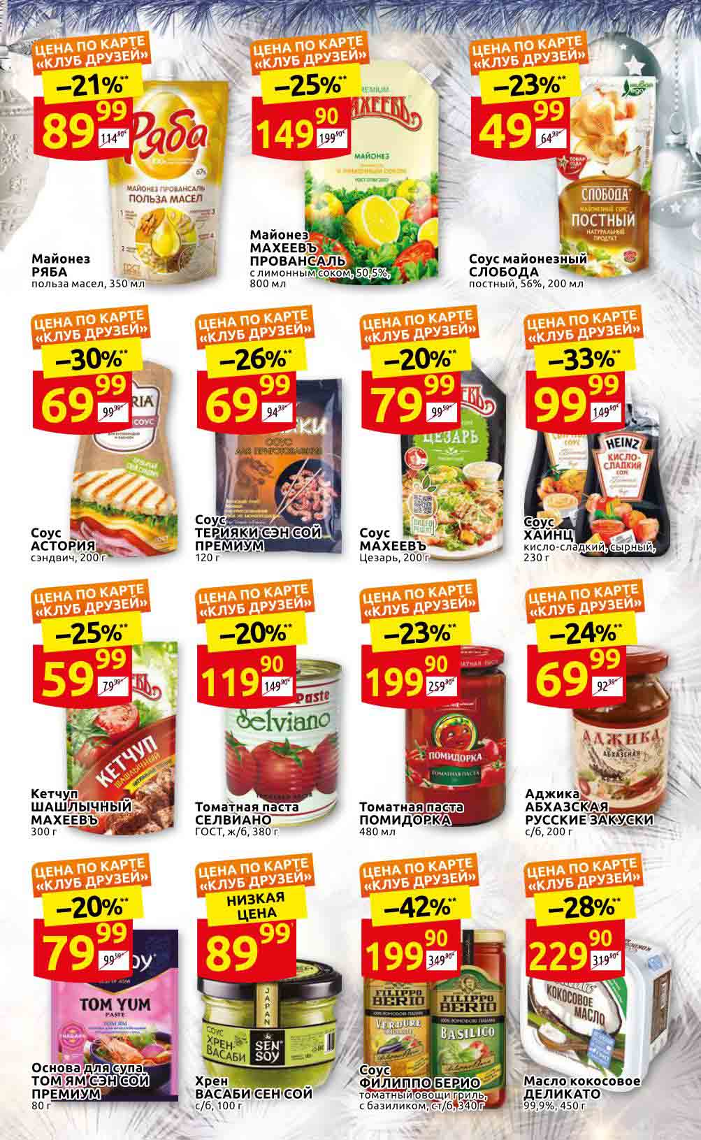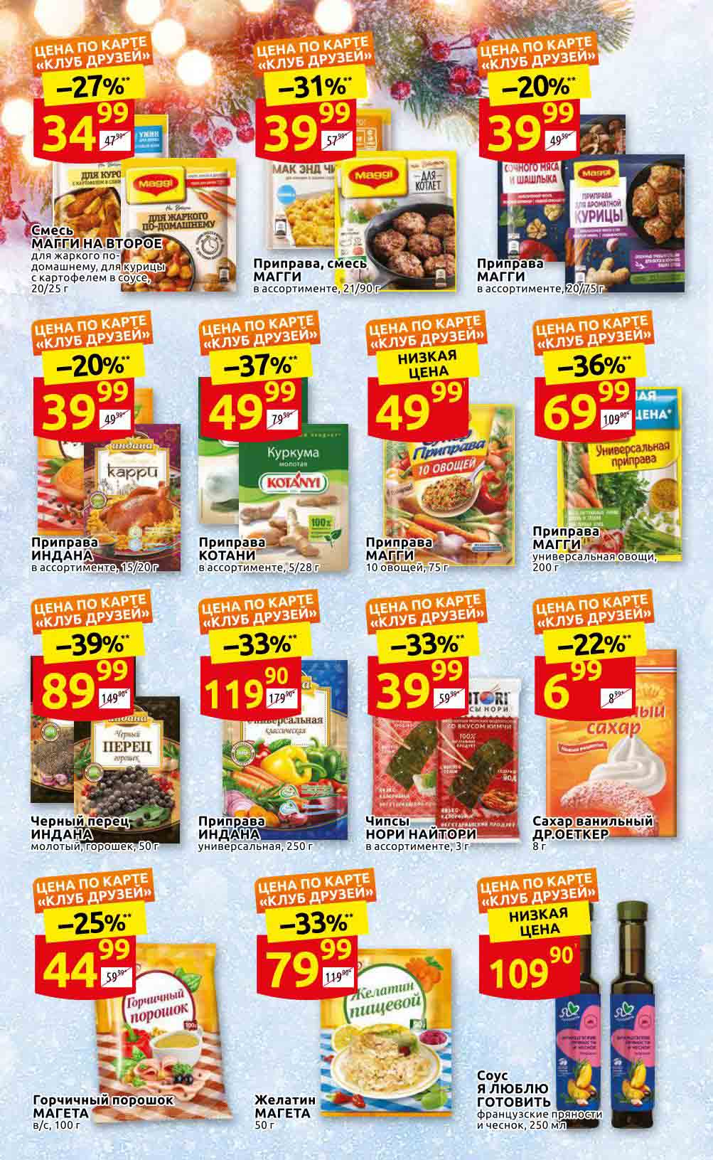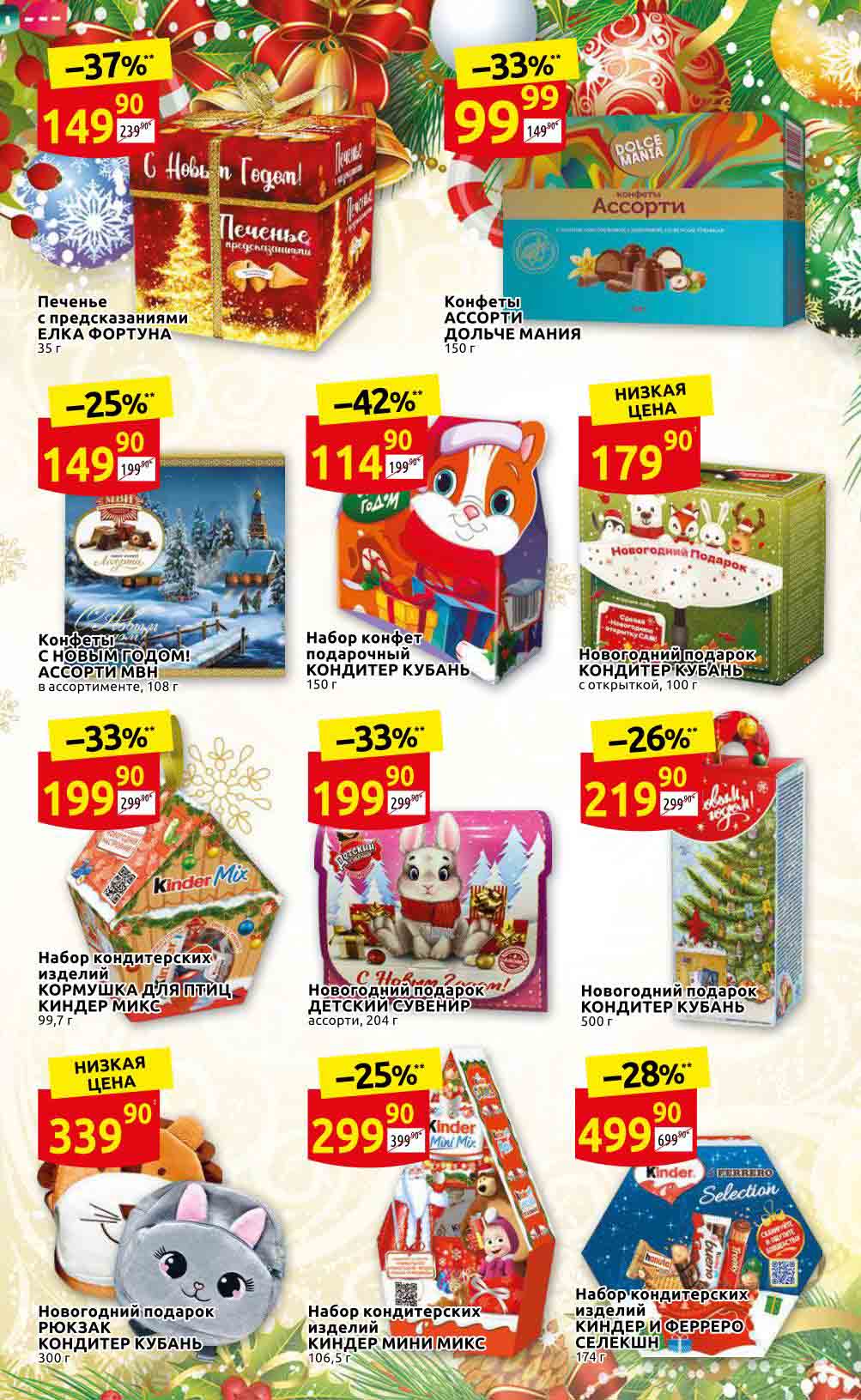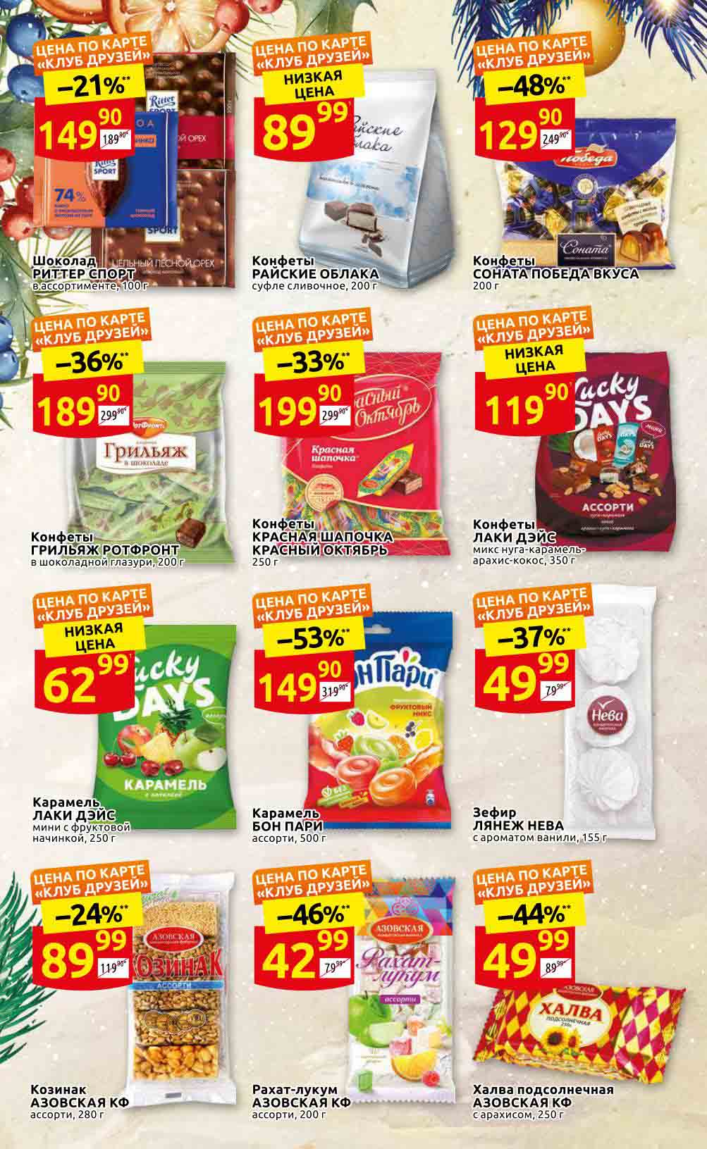 Акции «ДИКСИ» для Москва, Московская обл., Ярославль, Ярославская обл., Тула, Тульская обл., Владимир, Владимирская обл., Рязань, Рязанская обл., Калуга, Калужская обл., Смоленск, Смоленская обл., Тверь, Тверская обл., Брянск, Брянская обл., Иваново, Ивановская обл., Кострома, Костромская обл., Орёл, Орловская обл. Предложения, указанные в настоящем буклете, действительны с 24 ноября по 14 декабря 2022 года. Все цены указаны за единицу товара (за исключением весового товара, цена которого определена за конкретный вес, указанный в настоящем буклете). В акции участвуют товары, изображение которых размещено в буклете. Цены в магазинах могут быть дополнительно снижены по решению сети. Цены в буклете, помеченные «», обозначают среднюю цену данного товара по сети «ДИКСИ». Процент экономии в буклете, помеченный «*», обозначает среднюю экономию по сети. Товары в буклете могут отсутствовать в данном магазине. Ценник, помеченный «1», указывает цену по отношению к средней регулярной цене на данный товар в сети «ДИКСИ». Ценник, помеченный «2», обозначает скидку при покупке 2 и более единиц товаров единовременно. Количество товара ограничено. Точный перечень и количество товаров (предложений) по акции узнавайте в конкретном магазине. Информацию об организаторе акции, о правилах ее проведения, адресах ее проведения, порядке получения скидок узнавайте в магазинах «ДИКСИ» или по телефону горячей линии 8-800-101-10-01. Звонок бесплатный. Вы можете присылать свои отзывы и предложения на эл. адрес: dixy-fb@dixy.ru.