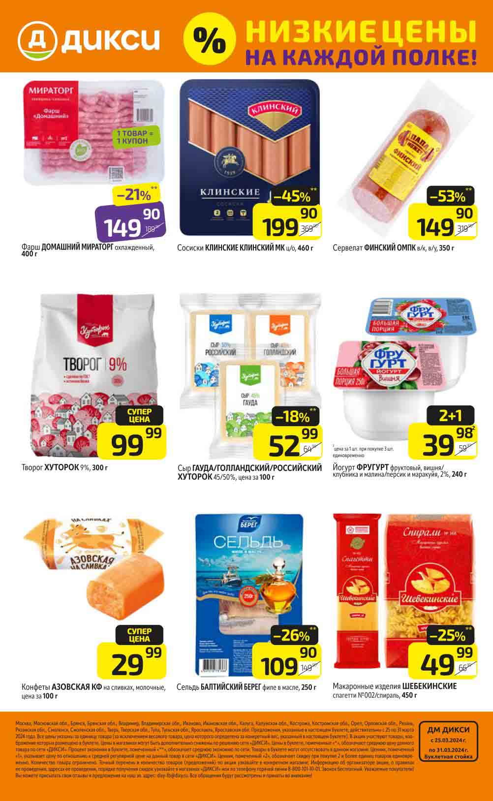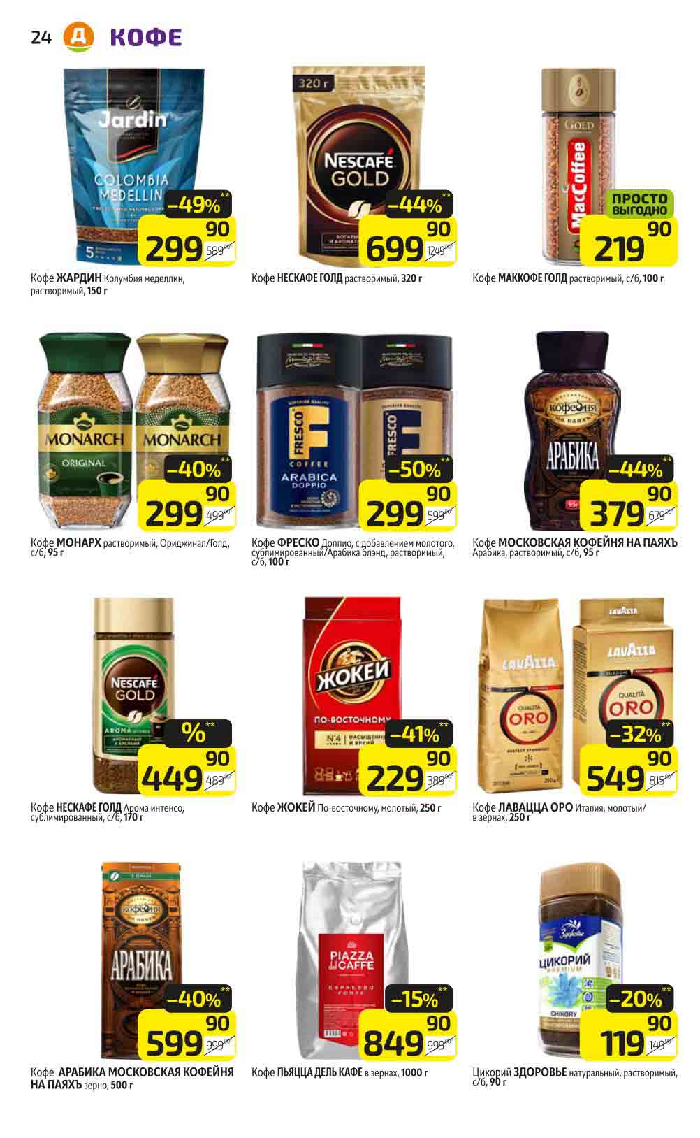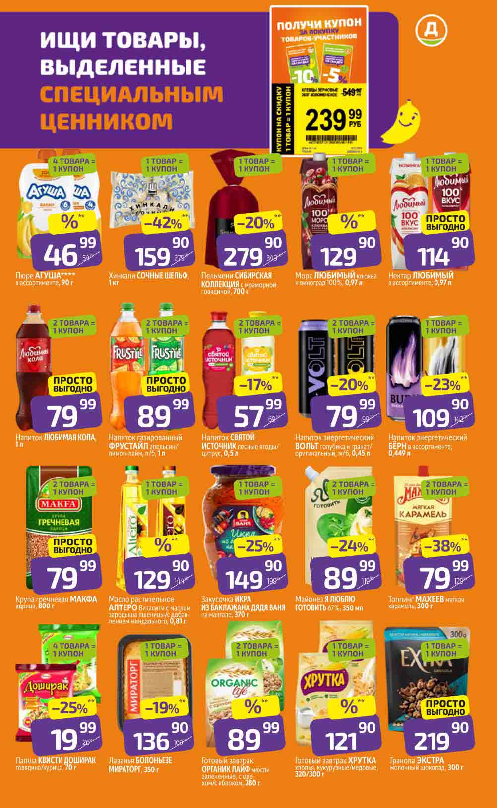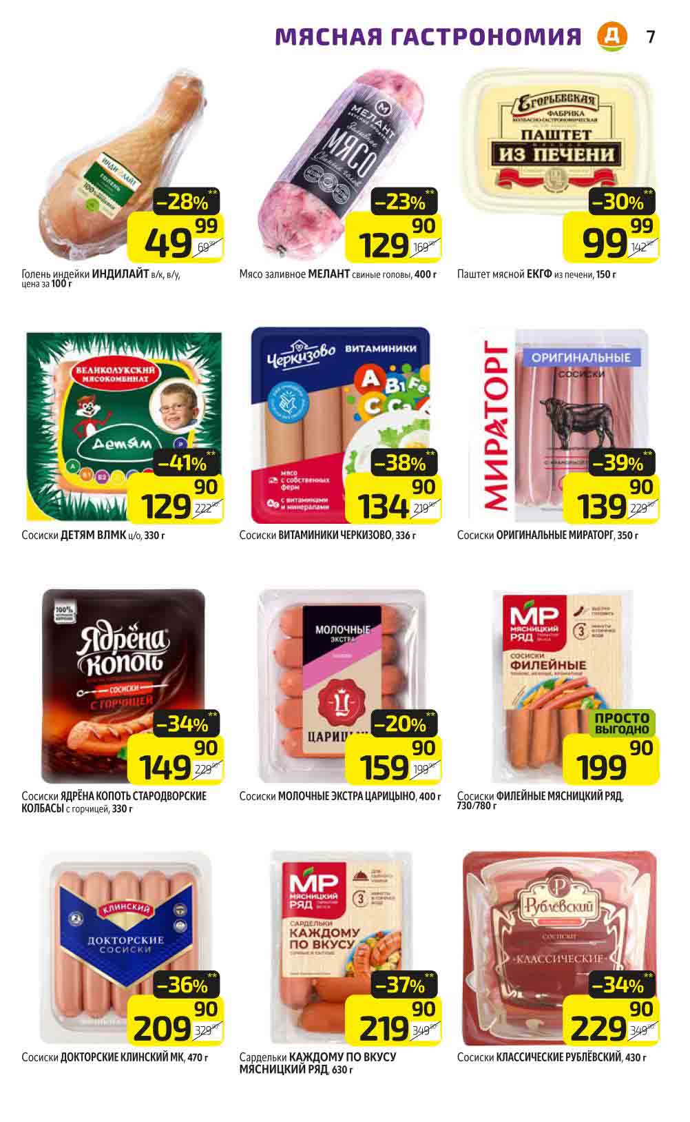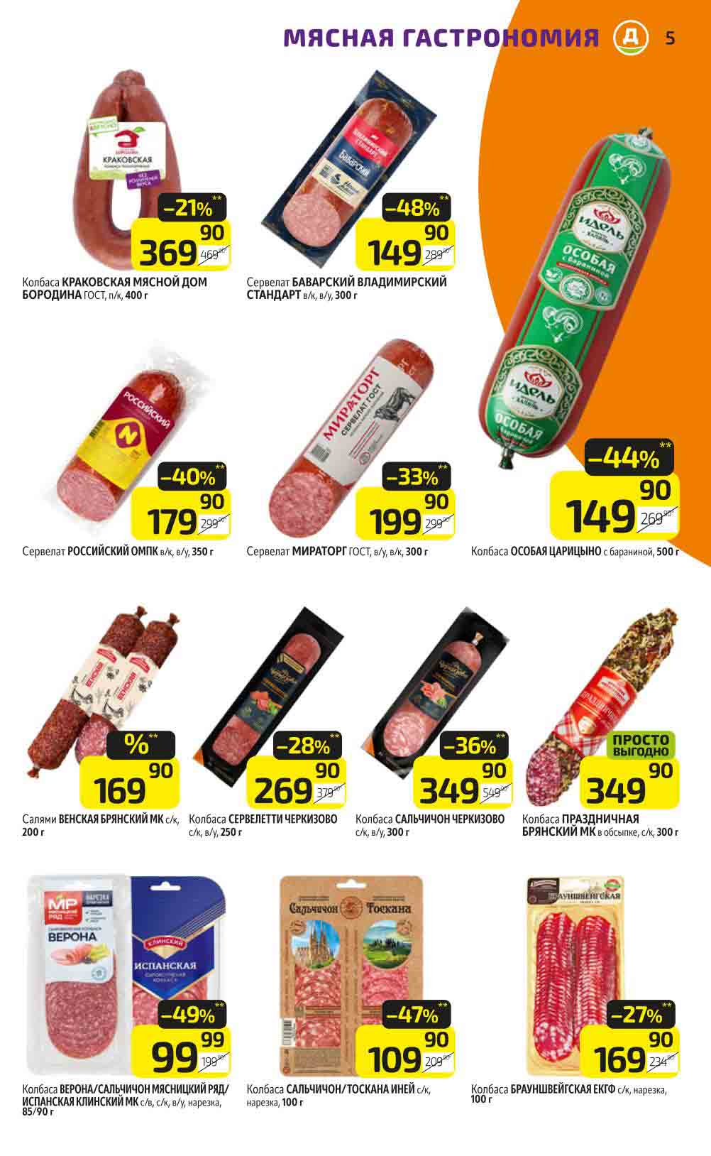 В акционном буклете предложены выгодные цены на различные продукты, такие как: скидка 47% на сливочное масло, минус 48% от цены на Баварский сервелат, пельмени ДОМАШНИЕ МИРАТОРГ со скидкой 54%, кофе ЖАРДИН по скидке 49% и многое другое.
