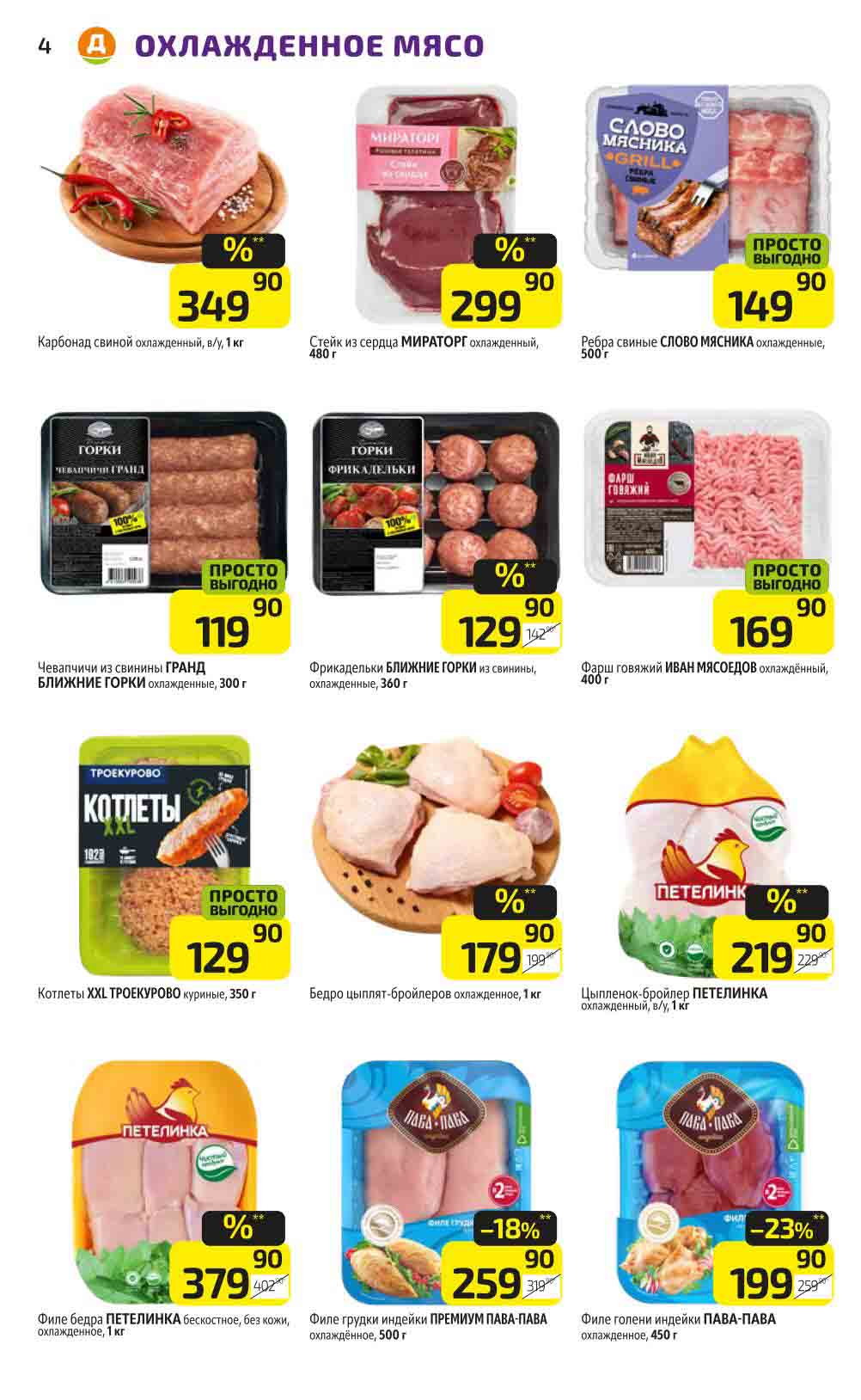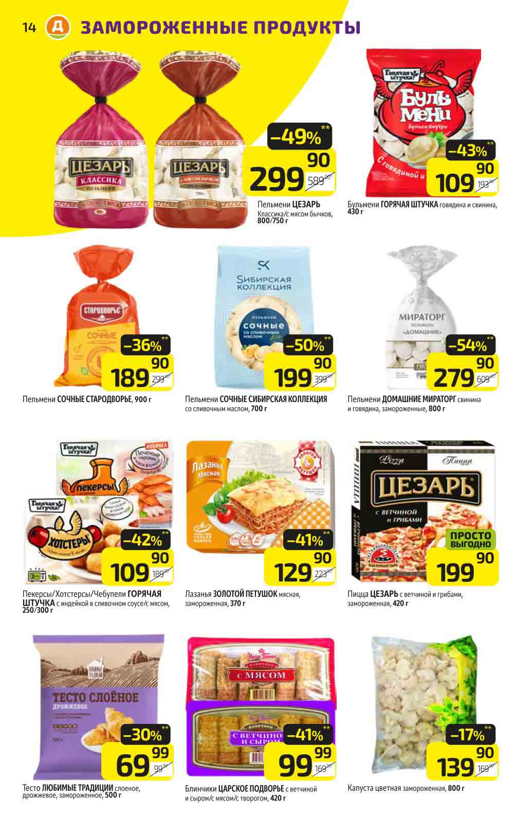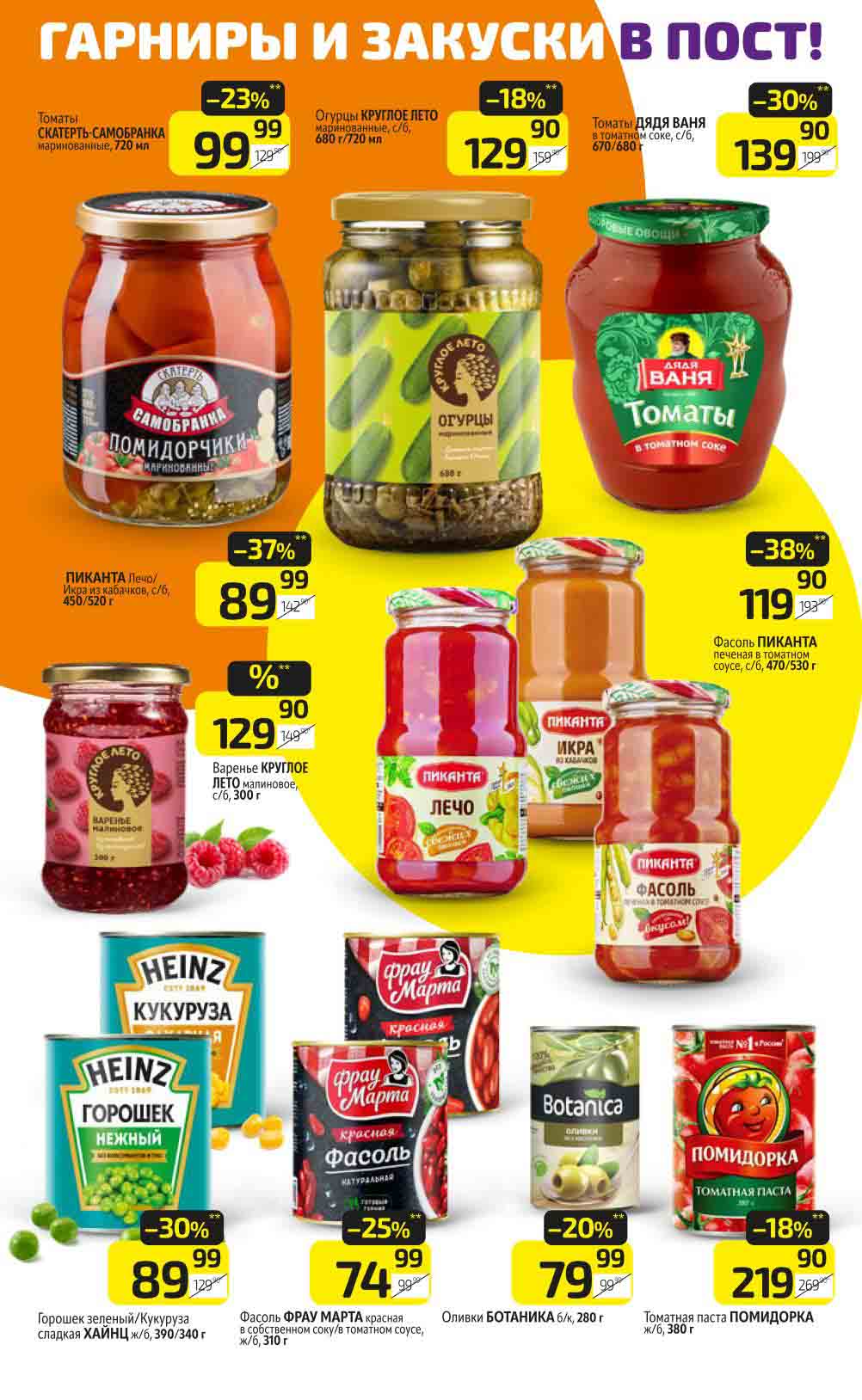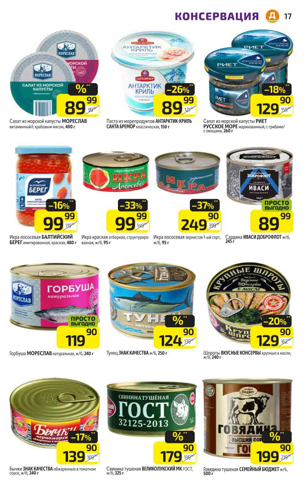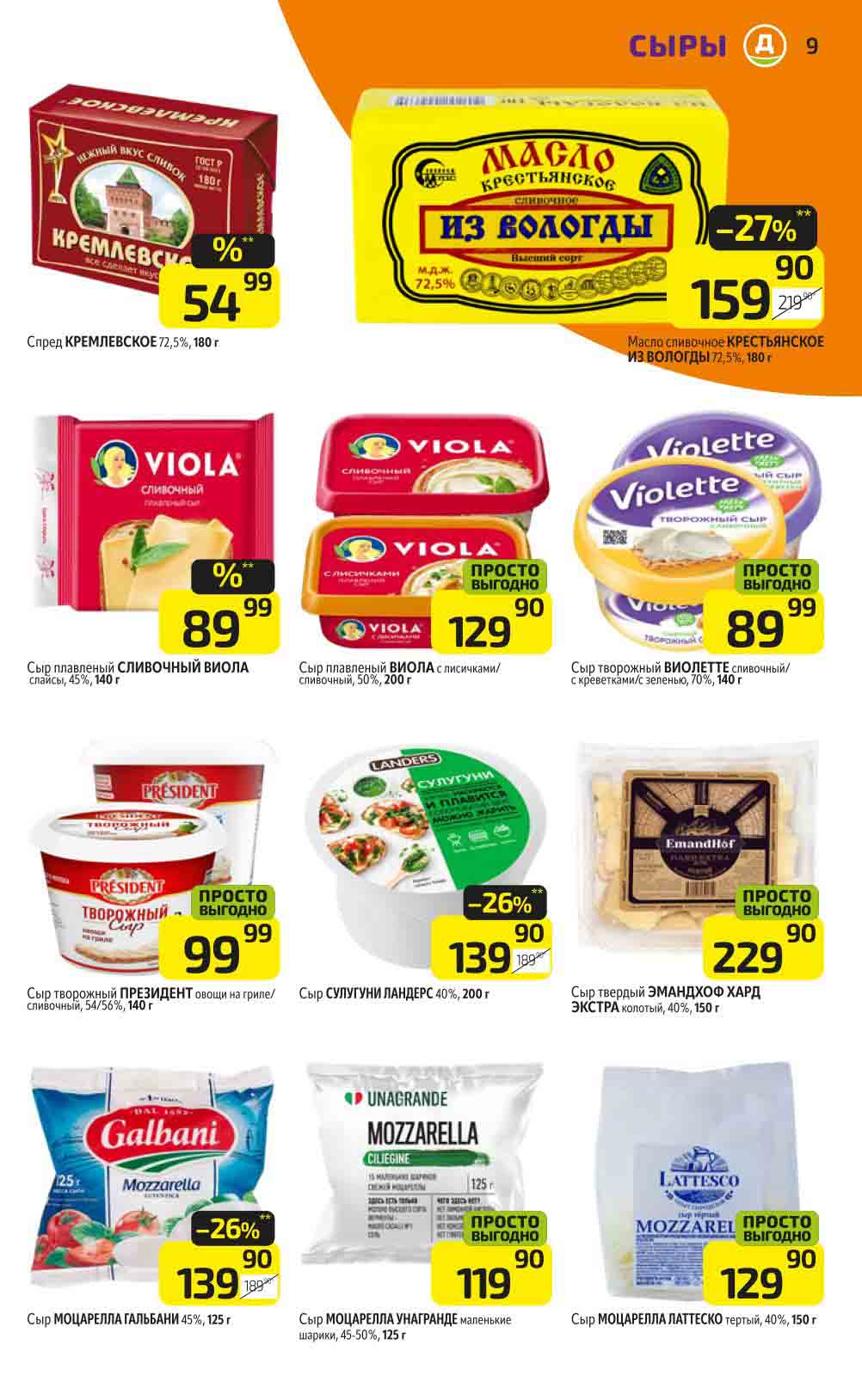 В акционном буклете предложены выгодные цены на различные продукты, такие как: скидка 47% на сливочное масло, минус 48% от цены на Баварский сервелат, пельмени ДОМАШНИЕ МИРАТОРГ со скидкой 54%, кофе ЖАРДИН по скидке 49% и многое другое.