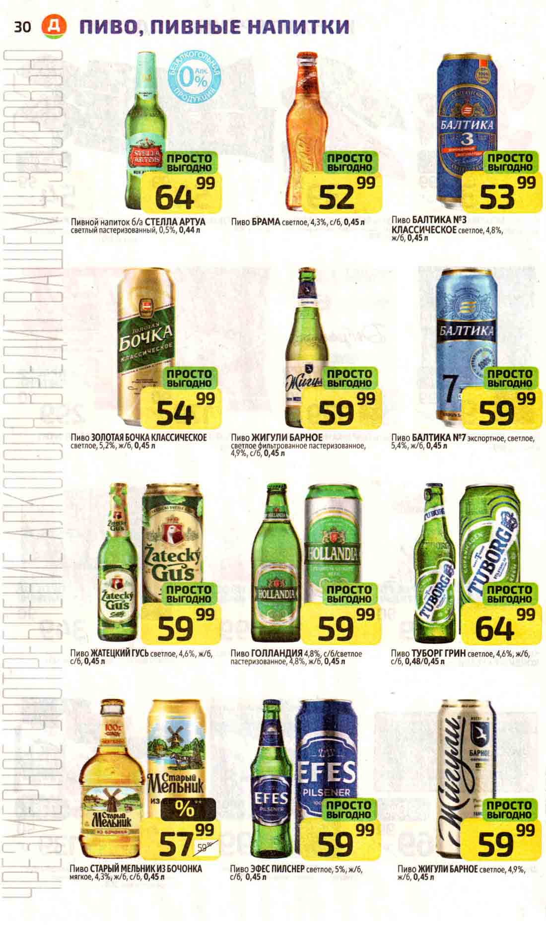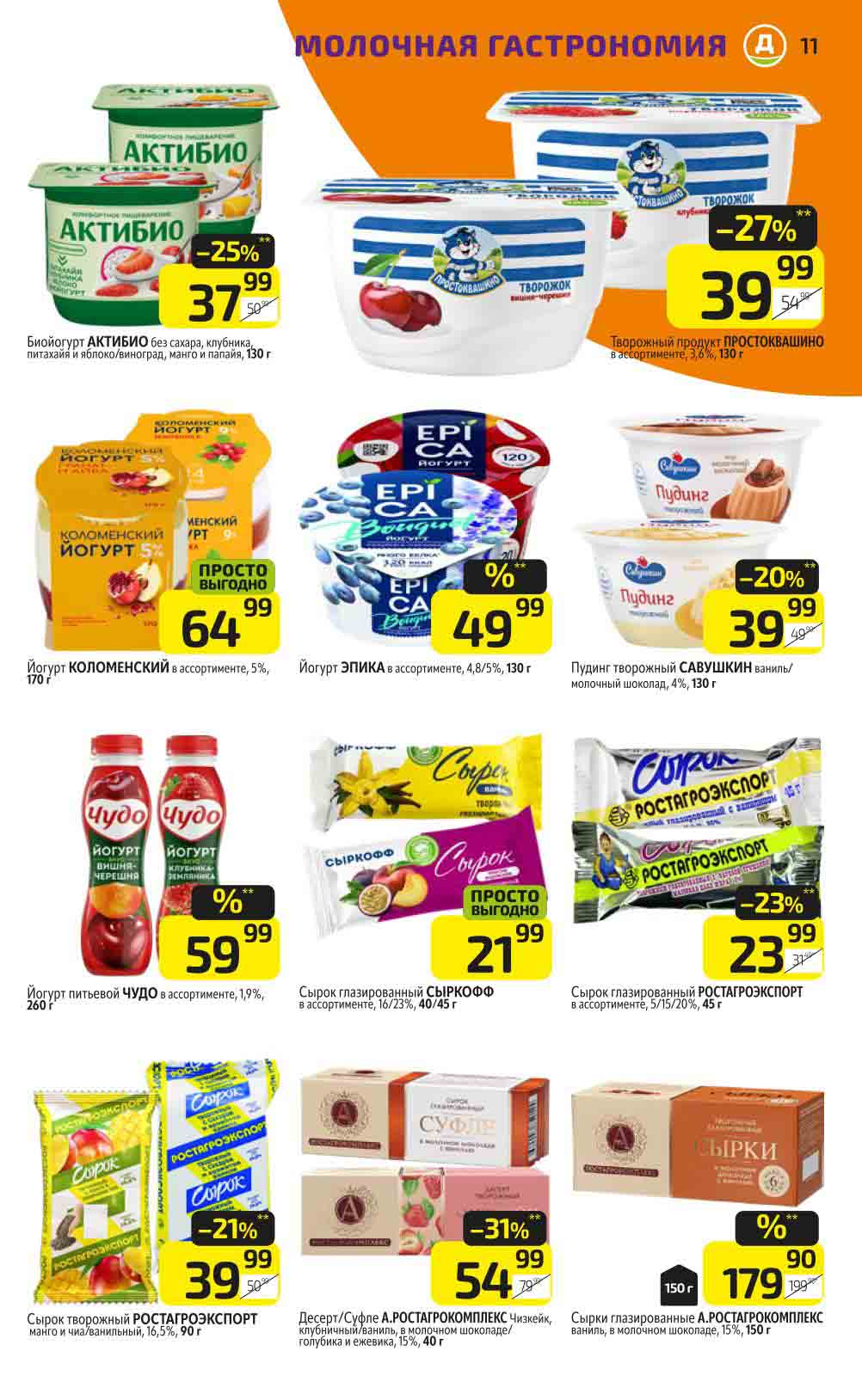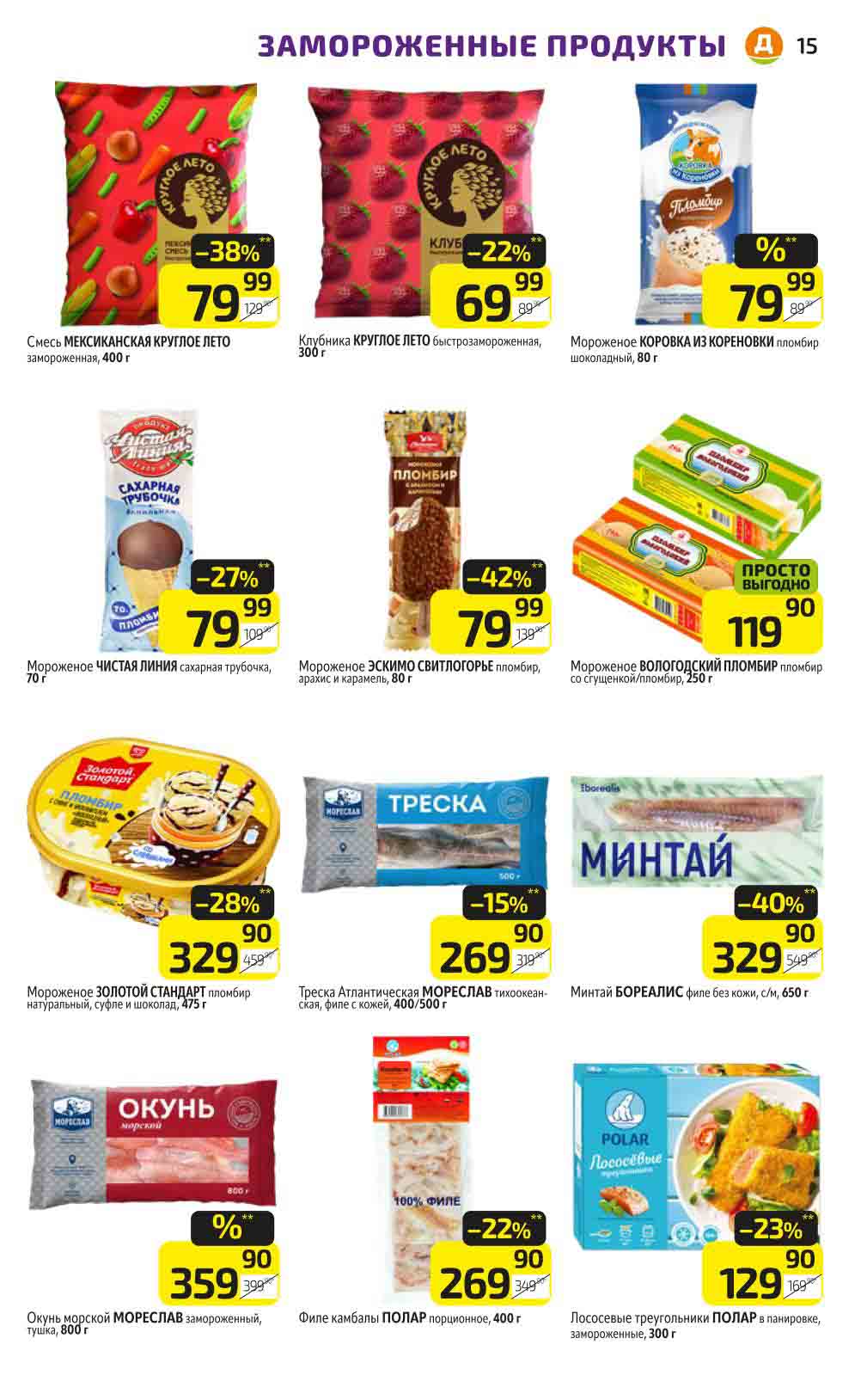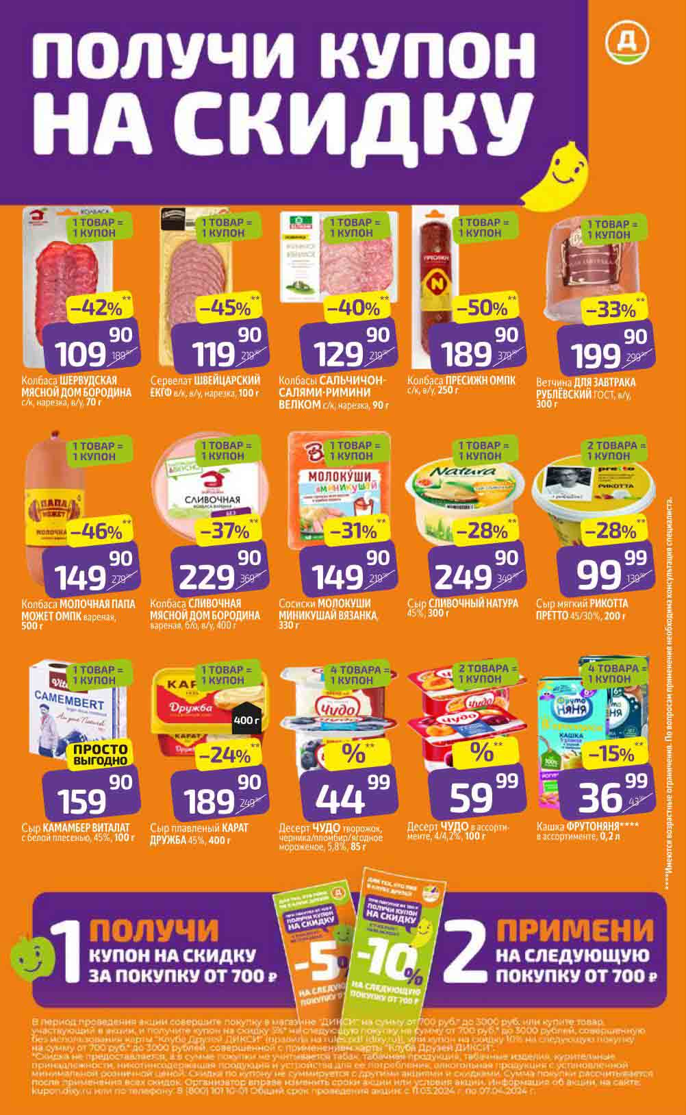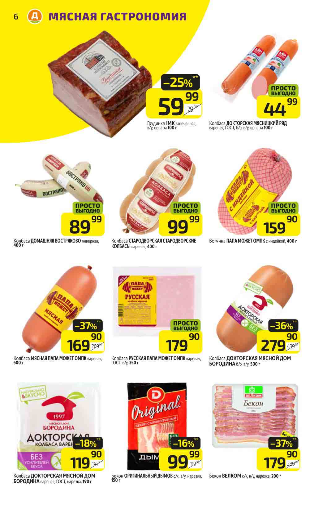 В акционном буклете предложены выгодные цены на различные продукты, такие как: скидка 47% на сливочное масло, минус 48% от цены на Баварский сервелат, пельмени ДОМАШНИЕ МИРАТОРГ со скидкой 54%, кофе ЖАРДИН по скидке 49% и многое другое.