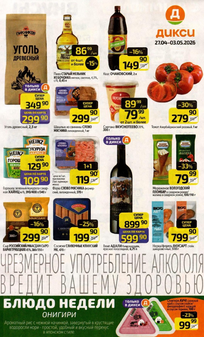 Сеть магазинов Дикси предлагает выгодные предложения к майским праздникам. Редакция подготовила для вас обзор акционных товаров. Все цены действительны с 27 апреля по 3 мая 2026 года. Это отличная возможность подготовиться к отдыху на природе. В каталоге есть шашлык, уголь, сыр и мороженое.