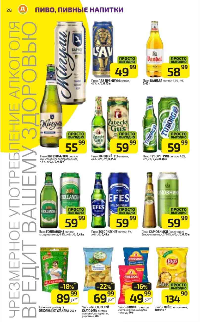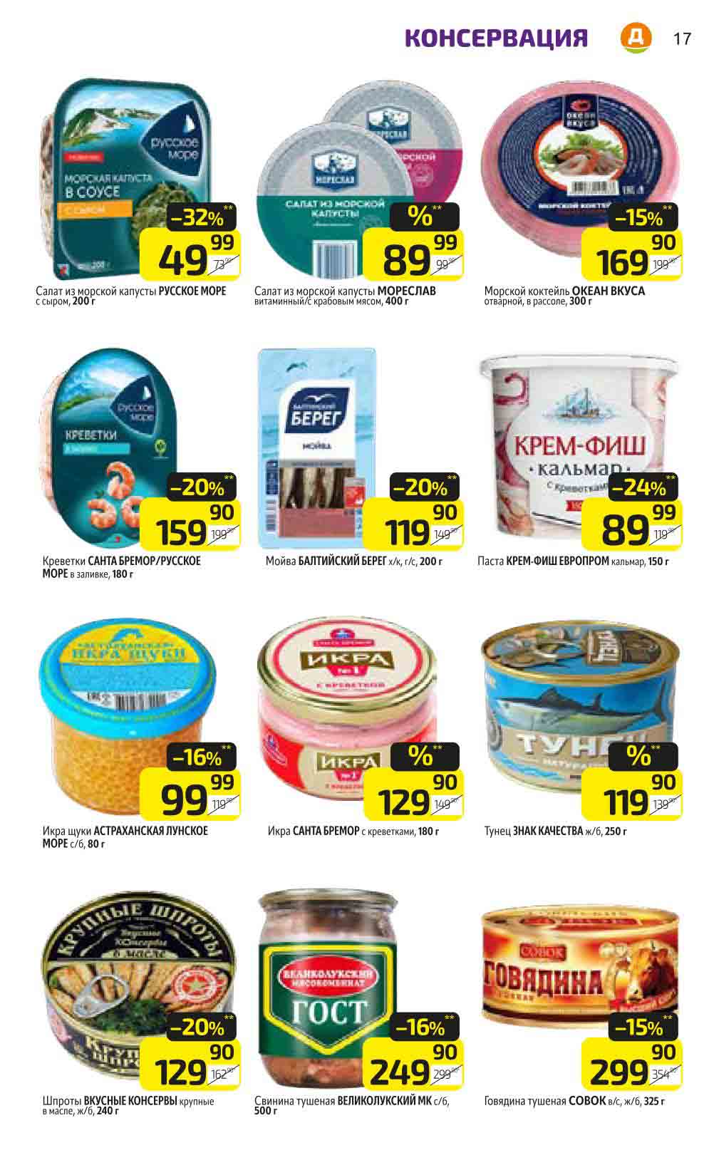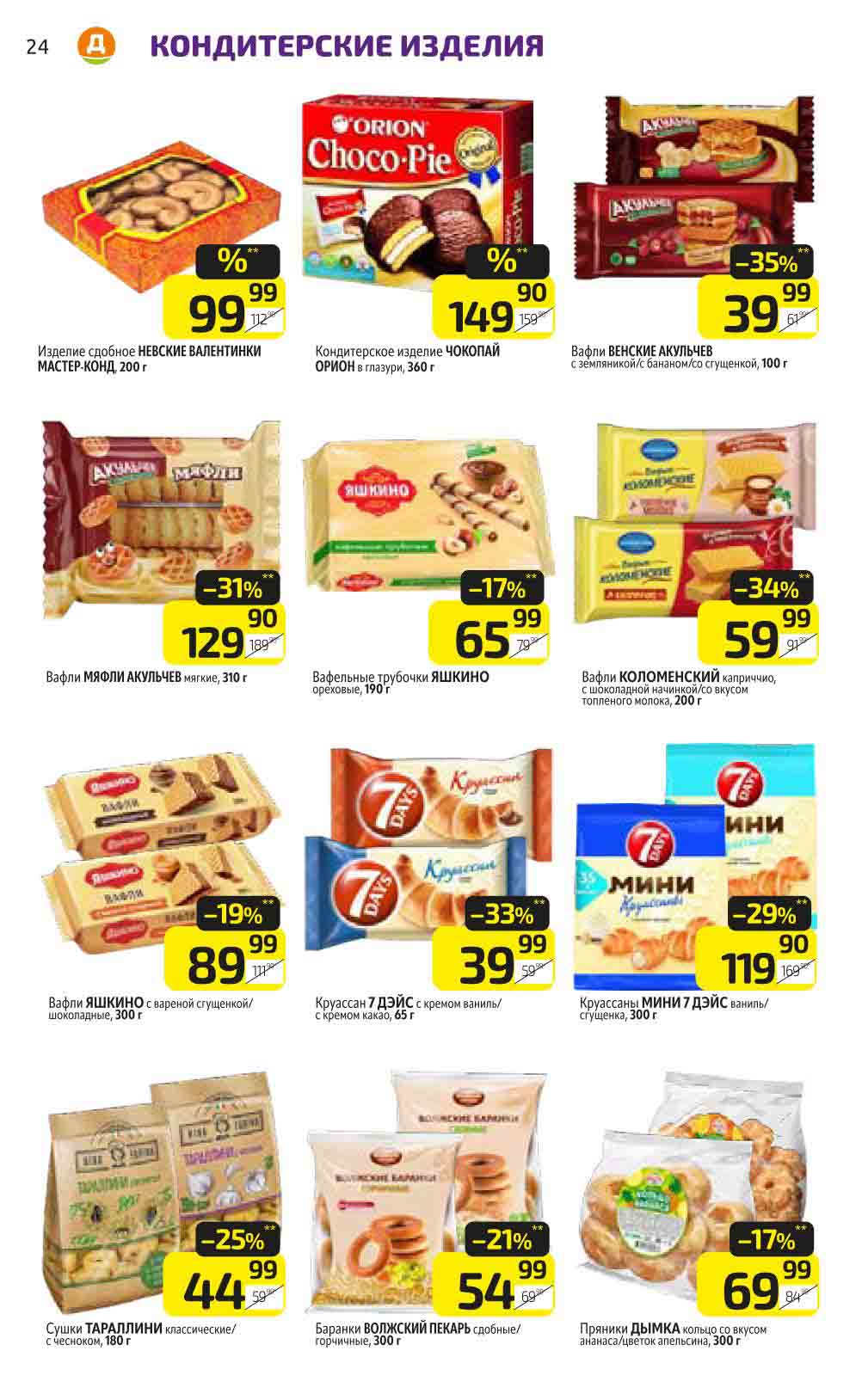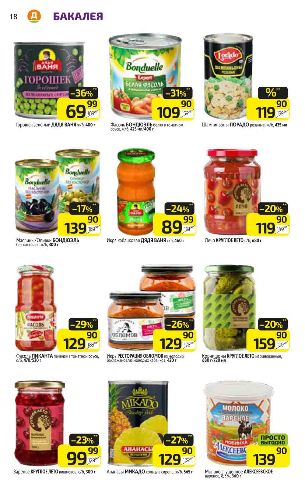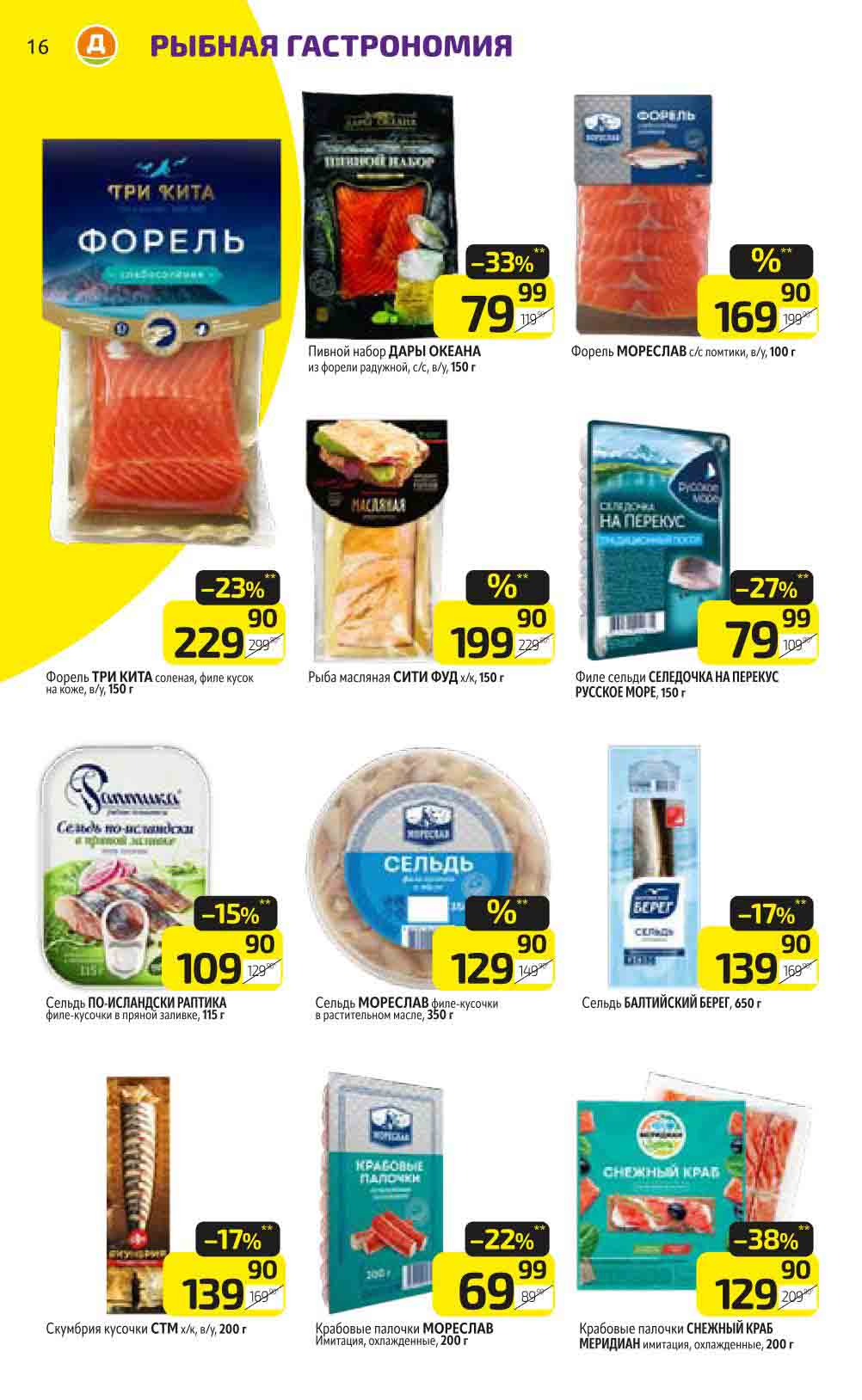 Буклет акционных цен включает в себя различные продукты, например, такие, как апельсины 99.99 руб., сосиски 199.90 руб., масло 159.90 руб., сыр 129.90 руб., авокадо 36.99 руб. и т. д.