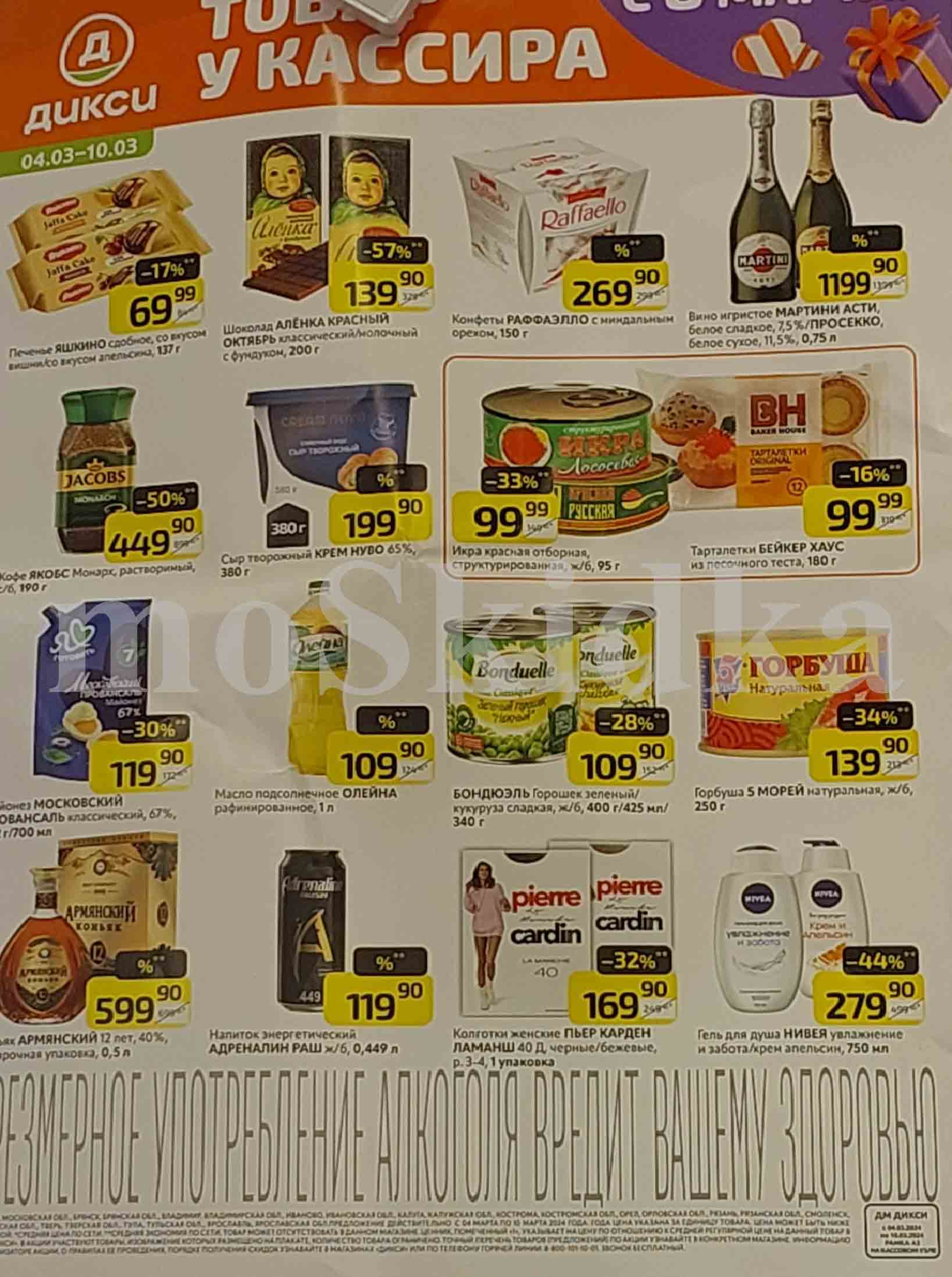В акционном буклете предложены выгодные цены на различные продукты, такие как конфеты, печенье, шоколад, вино, кофе, майонез, икра, горох, кукуруза, бренди, энергетические напитки, колготки, гель для душа и др. Скидки варьируются от 16% до 57% от первоначальных цен.