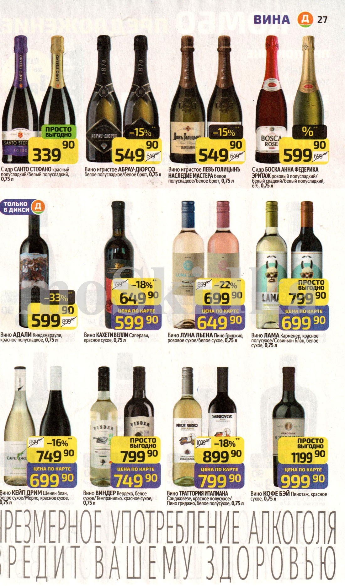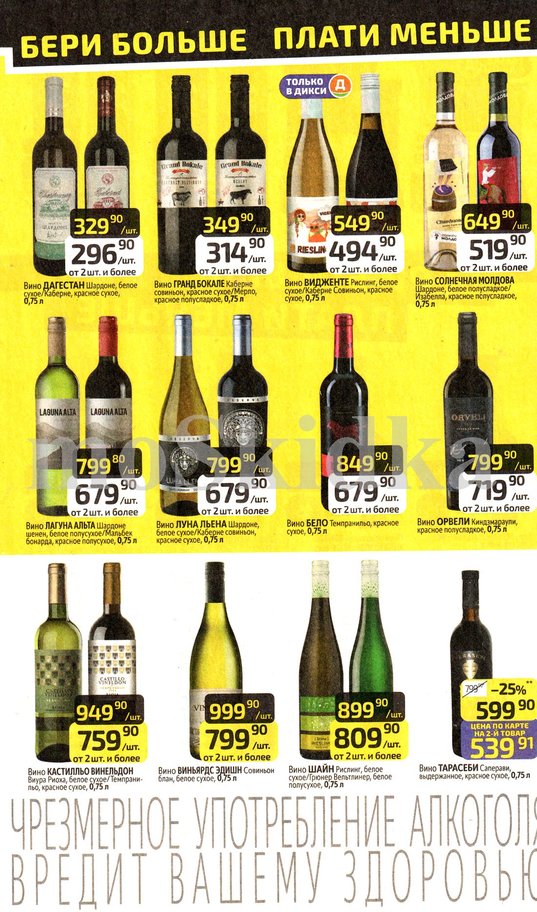 Вино «Дагестан» 0,75 л (329 ₽) , «Ранд Бокале» (296 ₽) , «Солнечная Молдова» (314 ₽) , «Луна Льена» (519 ₽) — цены при покупке 2 бутылок.