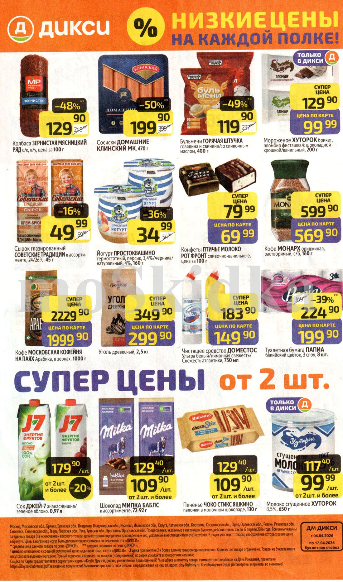 Акция действует с 6 по 12 апреля 2026 года. Специальные цены доступны только при предъявлении карты «Дикси» (бесплатно на кассе или в приложении).