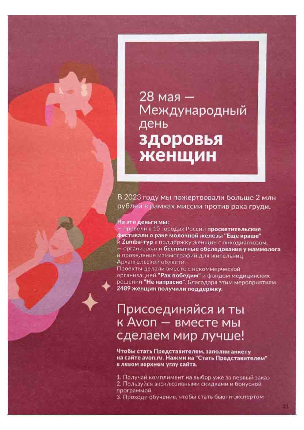 Подробную информацию об правилах, наличии товаров, адресах и скидках узнавайте в магазинахили по тел.:8 (495) 792-36-00и на сайте: my.avon.ru