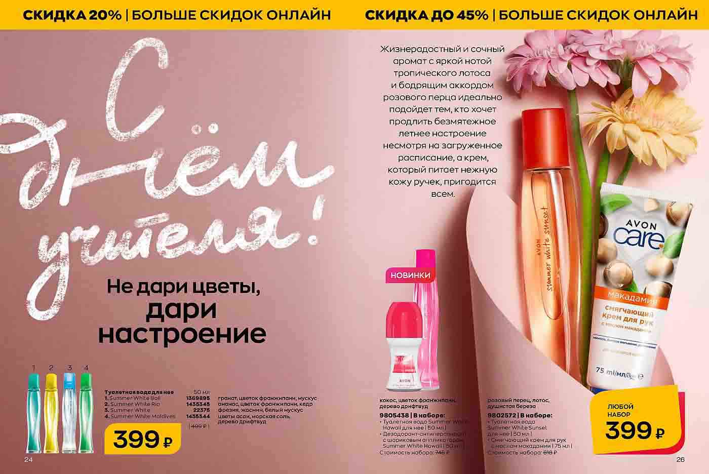 Компания «Эйвон» завоевала любовь россиян широким ассортиментом качественной продукции и демократичными ценами. Скидки на всю продукцию до 25%, закрытые распродажи, призовые программы и другие привилегии. Хотите присоединиться? Каталог Avon – ваш путь к красоте, ваш путь к экономии.